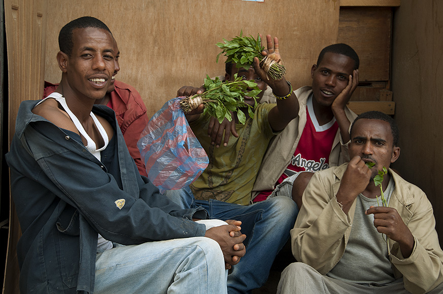 Podobne działanie jak liście koki ma czat, roślina uprawiana w Etiopii. Ze względu na zawarty w niej związek organiczny, podobny w działaniu do amfetaminy, Światowa Organizacja Zdrowia (WHO) zaliczyła krzew czatu do grupy substancji uzależniających. W wielu krajach jego sprzedaż jest ściśle kontrolowana. Jednak nie w Etiopii, gdzie rośliną handluje się powszechnie i otwarcie. Czat jest bardzo popularny wśród mieszkańców tego afrykańskiego państw,a a widok osób o zielonkawych zębach (efekt długotrwałego żucia) jest nagminny. Dla etiopskich rolników czat jest nie tylko sposobem na pozbycie się zmęczenia i poprawę nastroju, ale również źródłem dochodu. Jest on bowiem jednym z najważniejszych towarów eksportowych kraju. Trafia głównie do państw Półwyspu Arabskiego. Na całym świecie sięga po niego kilkanaście milionów ludzi od Sudanu po Madagaskar.