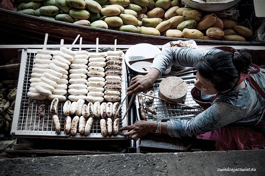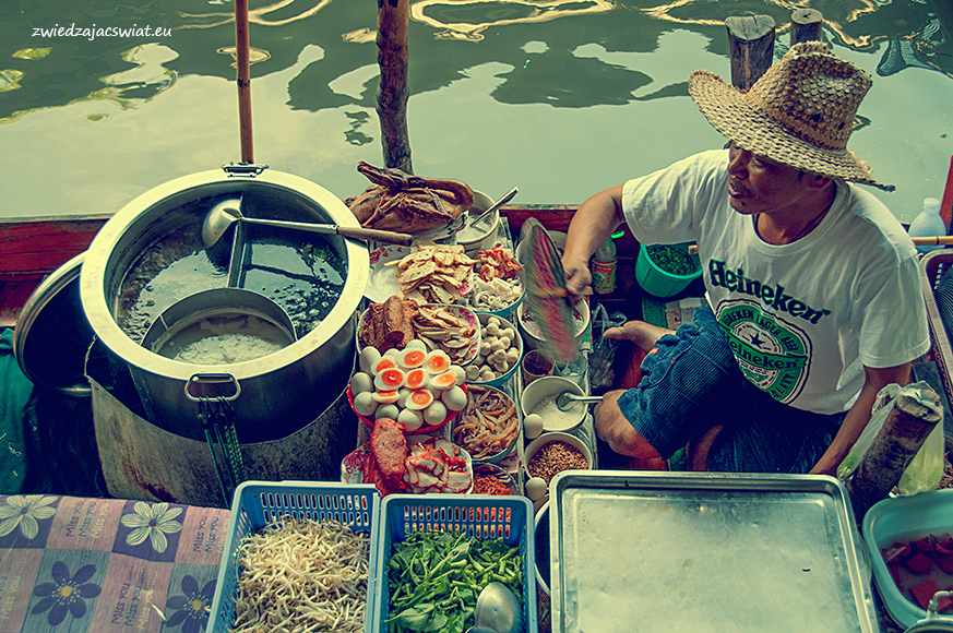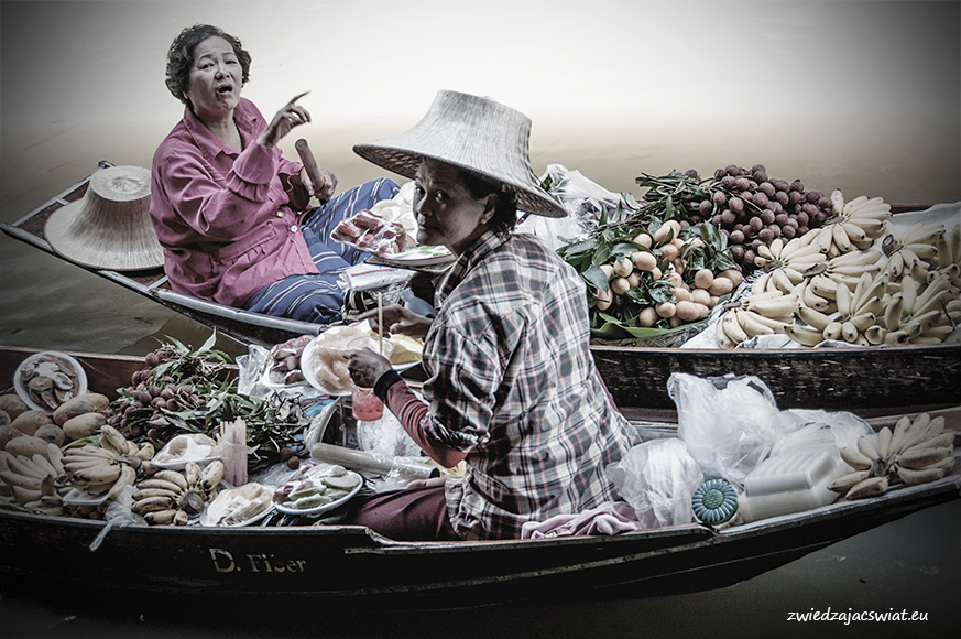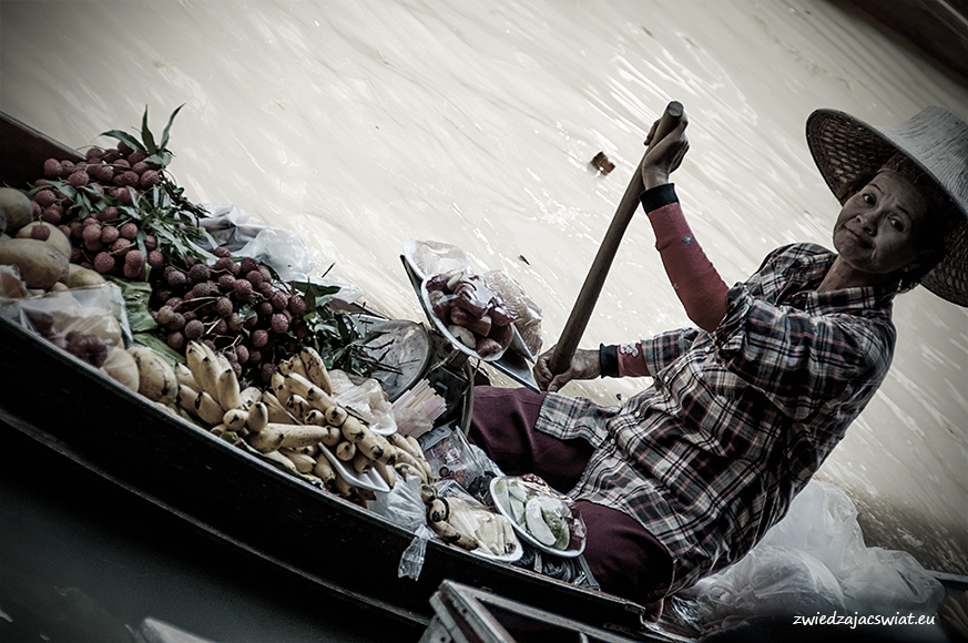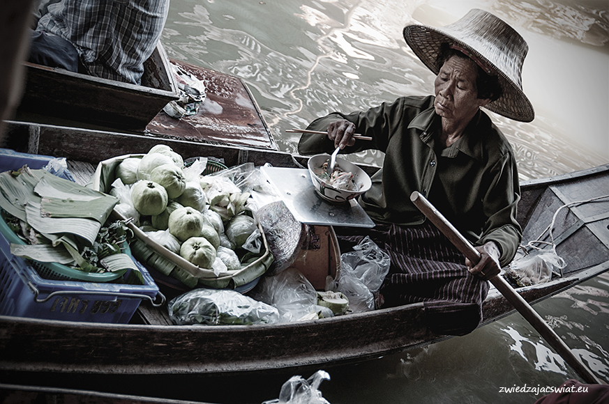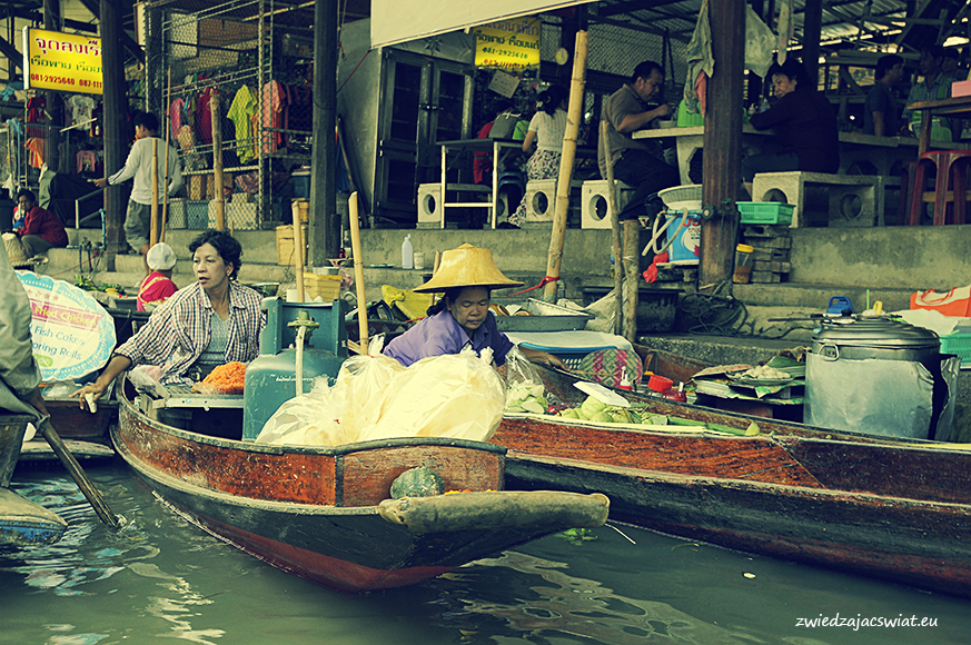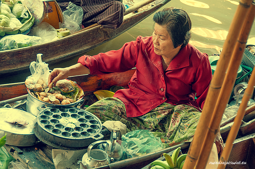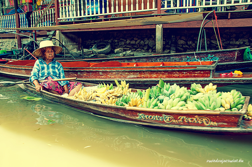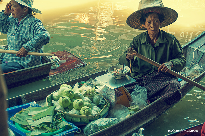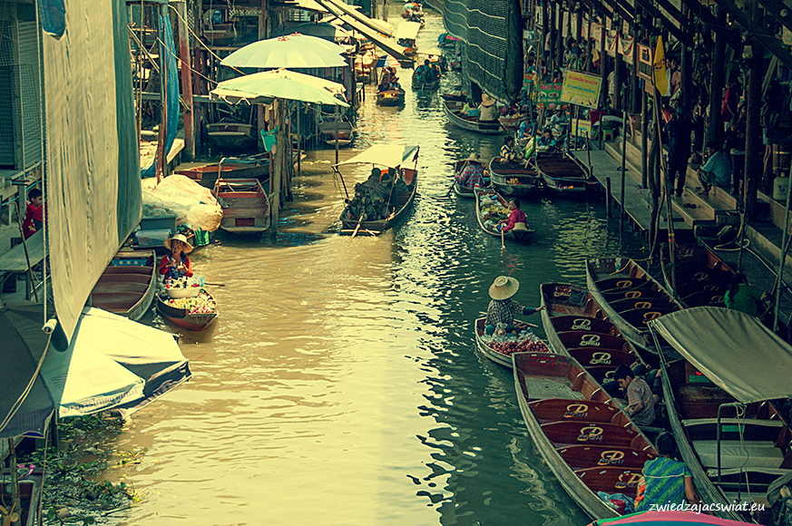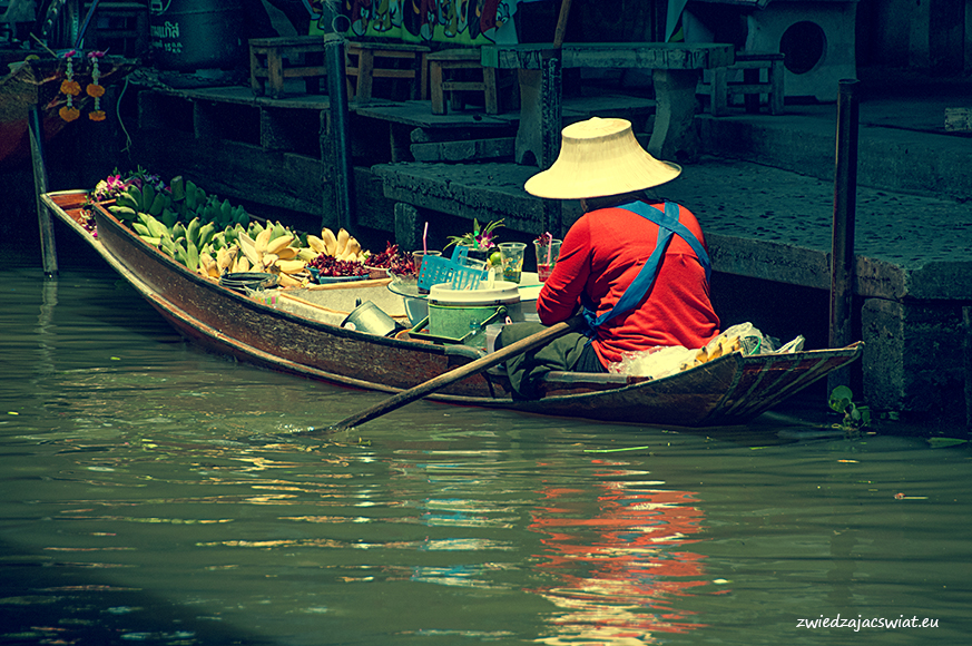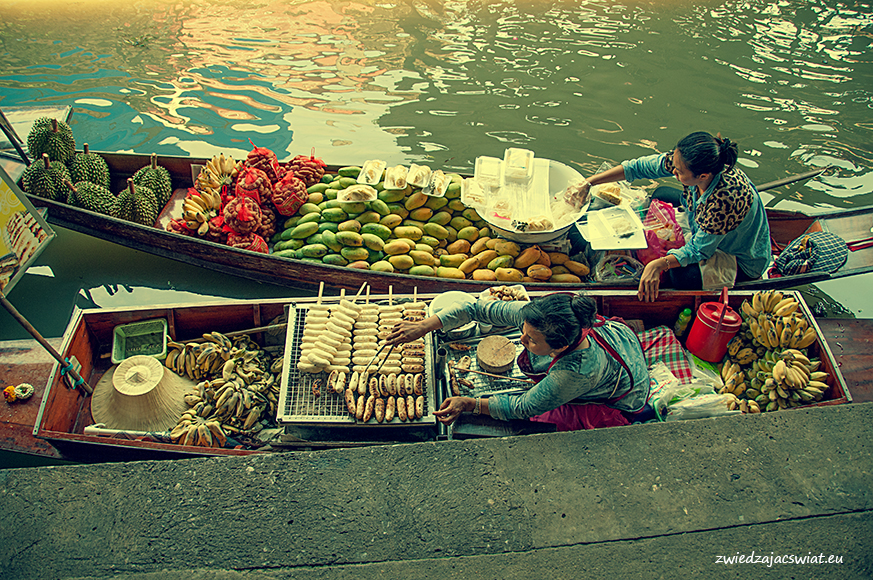 Smukłe, długie łodzie wypełnione egzotycznymi owocami, sprzedawcy w słomkowych kapeluszach, pływające garkuchnie, na poczekaniu wyczarowujące smakowite, tradycyjne potrawy, a wszystko to w scenerii porośniętych egzotyczną roślinnością kanałów, z domami na palach wzdłuż brzegów. Tak wyobrażacie sobie pływający targ w Tajlandii? Najsłynniejszy, w Damnoen Saduak, miejscowości oddalonej ok. 100 km od Bangkoku, kusi takimi właśnie obrazami. I owszem są one zgodne z prawdą, barwne i egzotyczne, niestety pozbawione autentyzmu. Jeżeli liczycie, że odwiedzając pływający targ w Damnoen Saduak, odbędziecie podróż w czasie, jedyne co wam pozostanie po powrocie, to wystylizowanie zrobionych tam zdjęć na stare pocztówki.