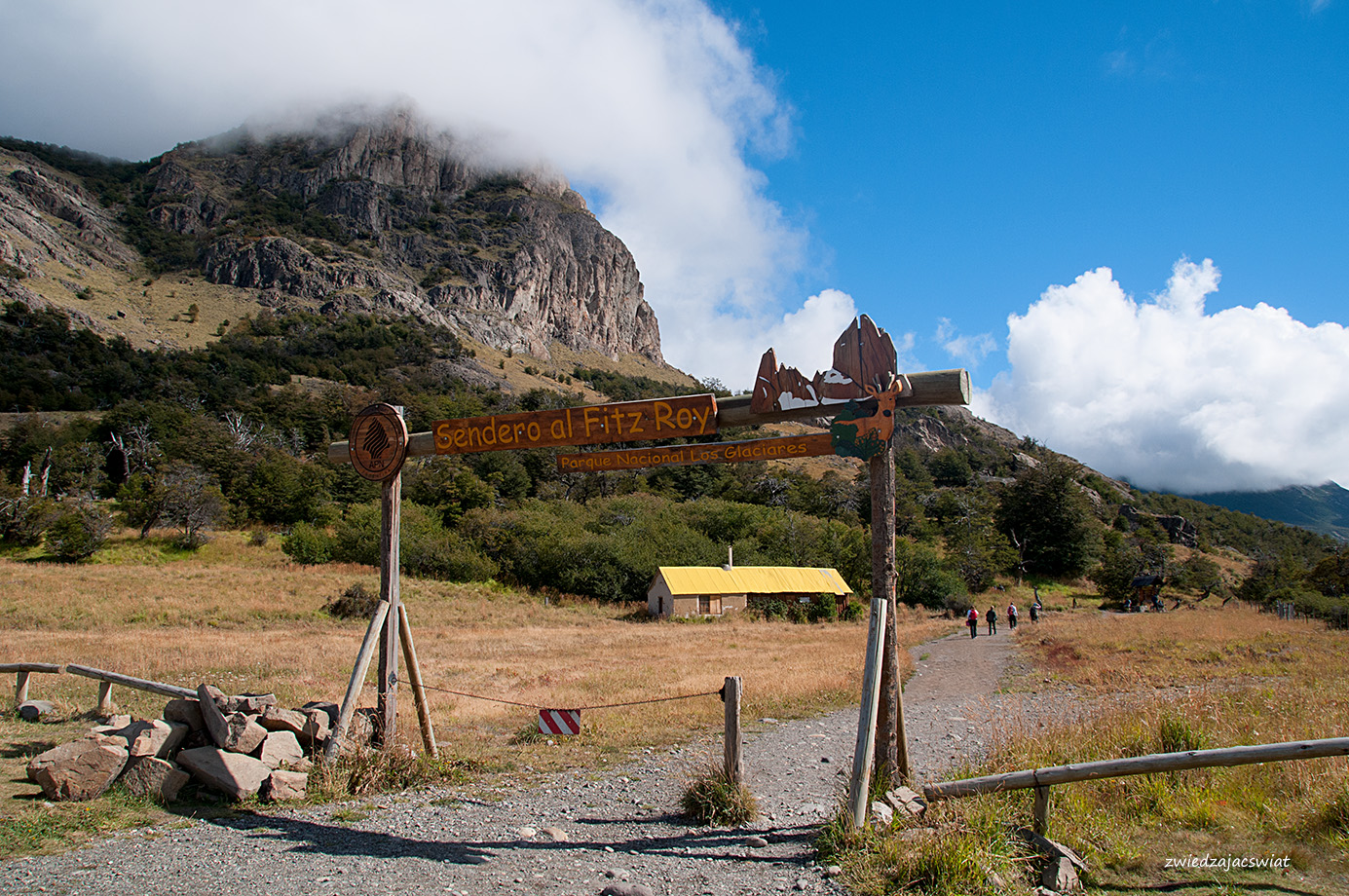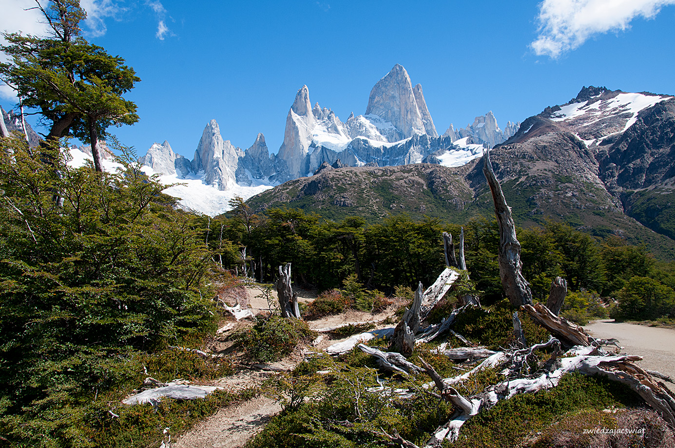 Trasa do Laguny de los Tres pod Fitz Royem, staruje za drewnianą bramą, dzięki której mamy pewność, że wkraczamy na teren Parku Narodowego Lodowców (Los Glaciares). Dosyć ostre, kilkusetmetrowe podejście i możemy spojrzeć na panoramę El Chalten, położonego płasko w dole w otoczeniu gór. Kolejny punkt to znajdująca się mniej więcej w połowie trasy Laguna Capri i kemping w jej pobliżu. Dobra opcja dla planujących nocleg w tym rejonie. Ostatni z 10 kilometrów szlaku to już poważne wyzwanie. Cała trasa w jedną stronę zaplanowana jest na około 4 godziny marszu. Pierwszych 9 kilometrów to mniej więcej trzygodzinna wędrówka, co oznacza, że pokonanie ostatniego kilometra zajmuje…godzinę czasu.