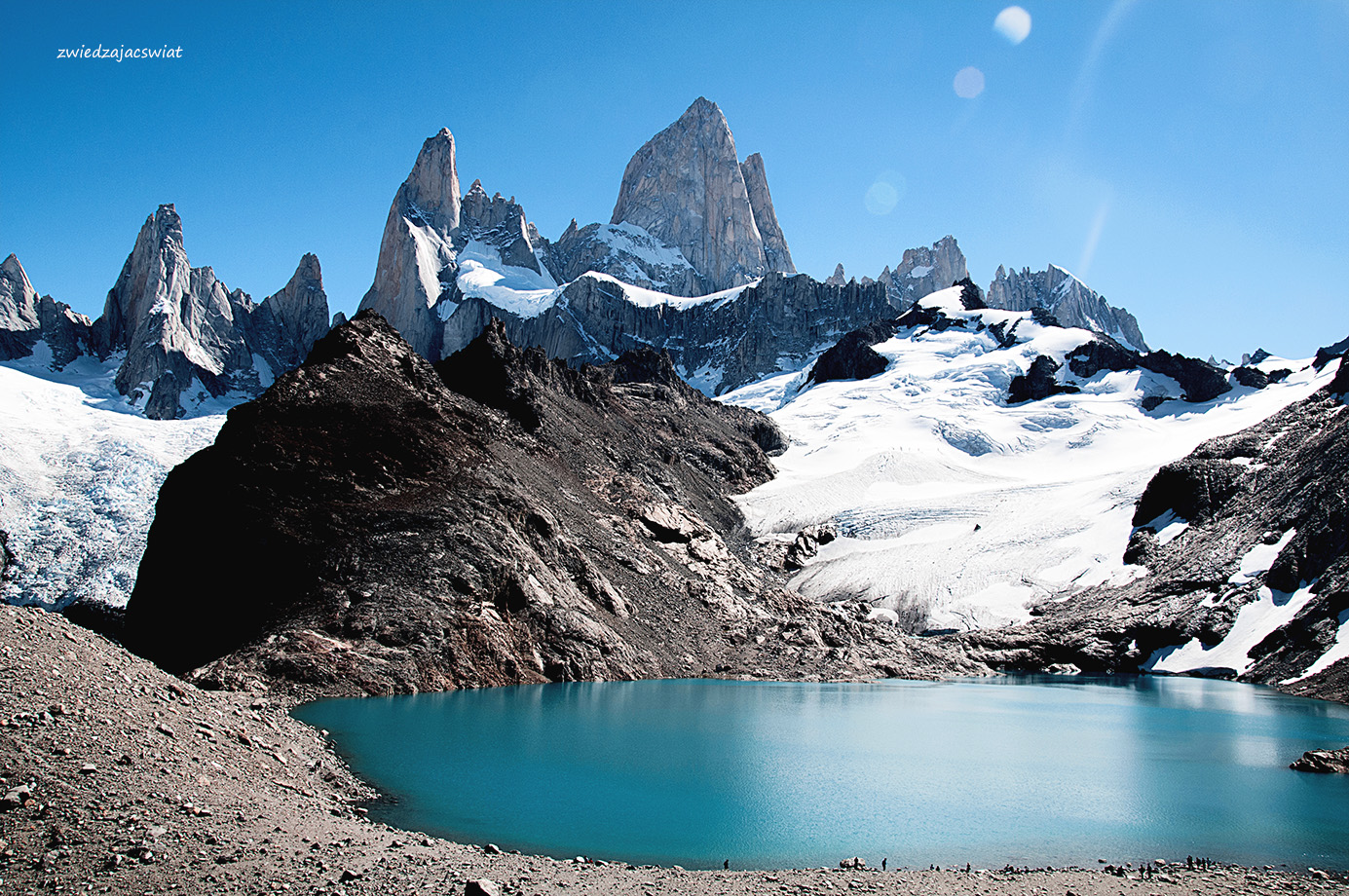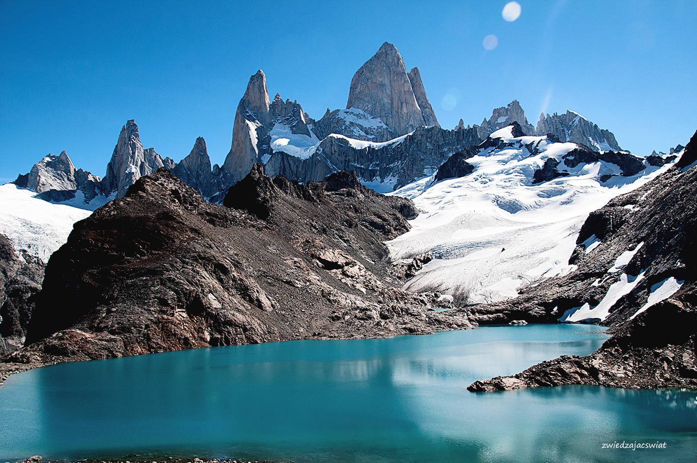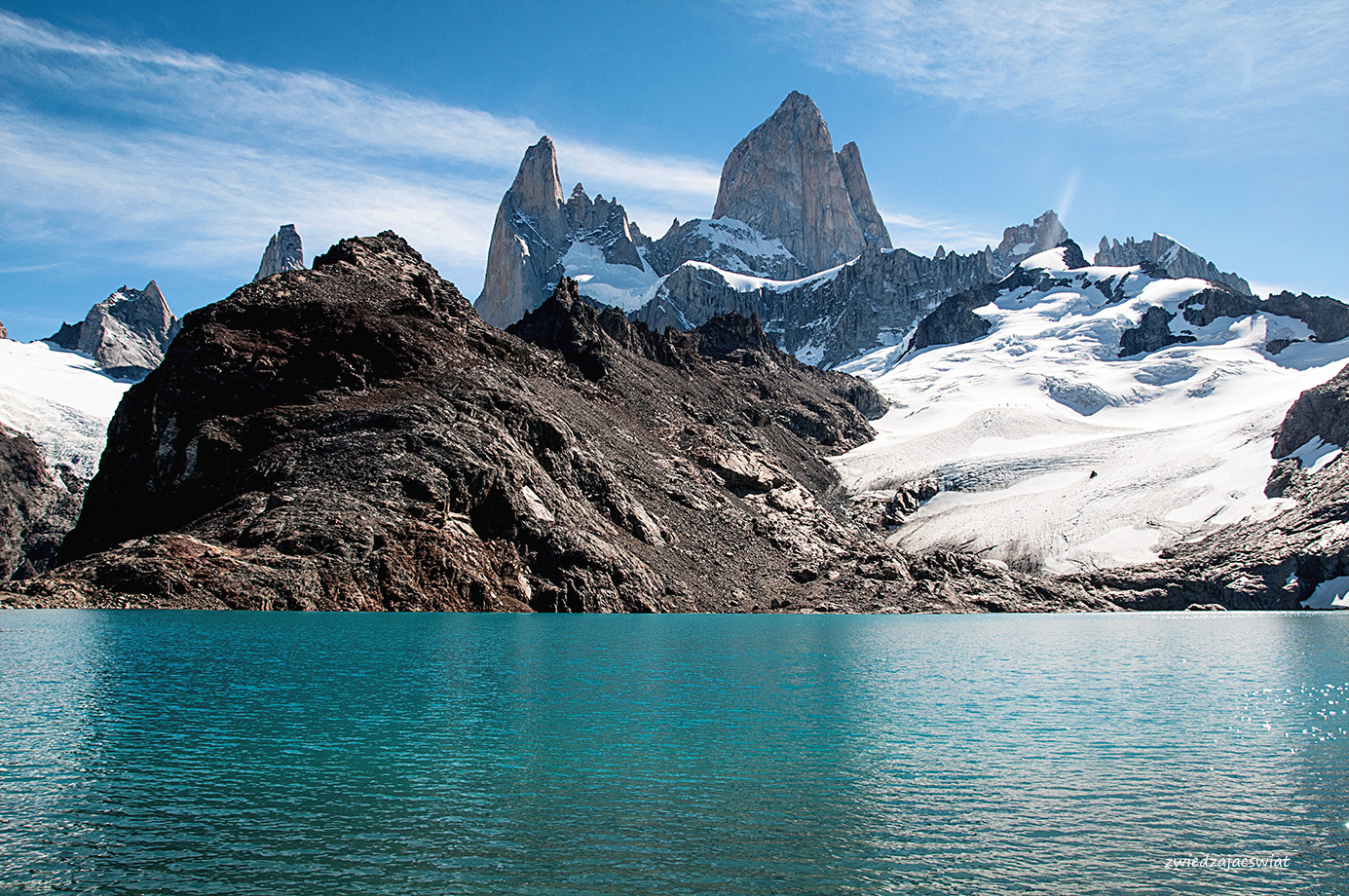 Dzień jest słoneczny jak na lato przystało – co jednak w Patagonii, słynącej ze zmiennej pogody wcale nie jest oczywiste. Mimo że, jak to było w planach, Fitz Roy nie płonie w promieniach zachodzącego słońca, prezentuje się wspaniale, w całej swej majestatycznej okazałości. Z reguły wierzchołek argentyńskiego szczytu spowity jest chmurami. Stąd jego nazwa – Dymiąca Góra. Jak miło, że tym razem jest inaczej.