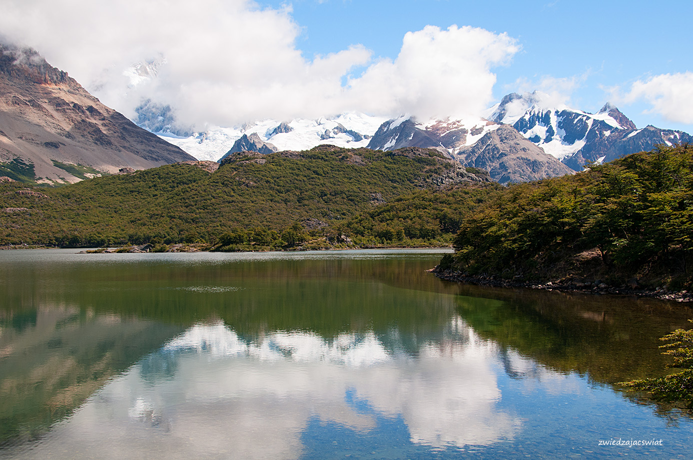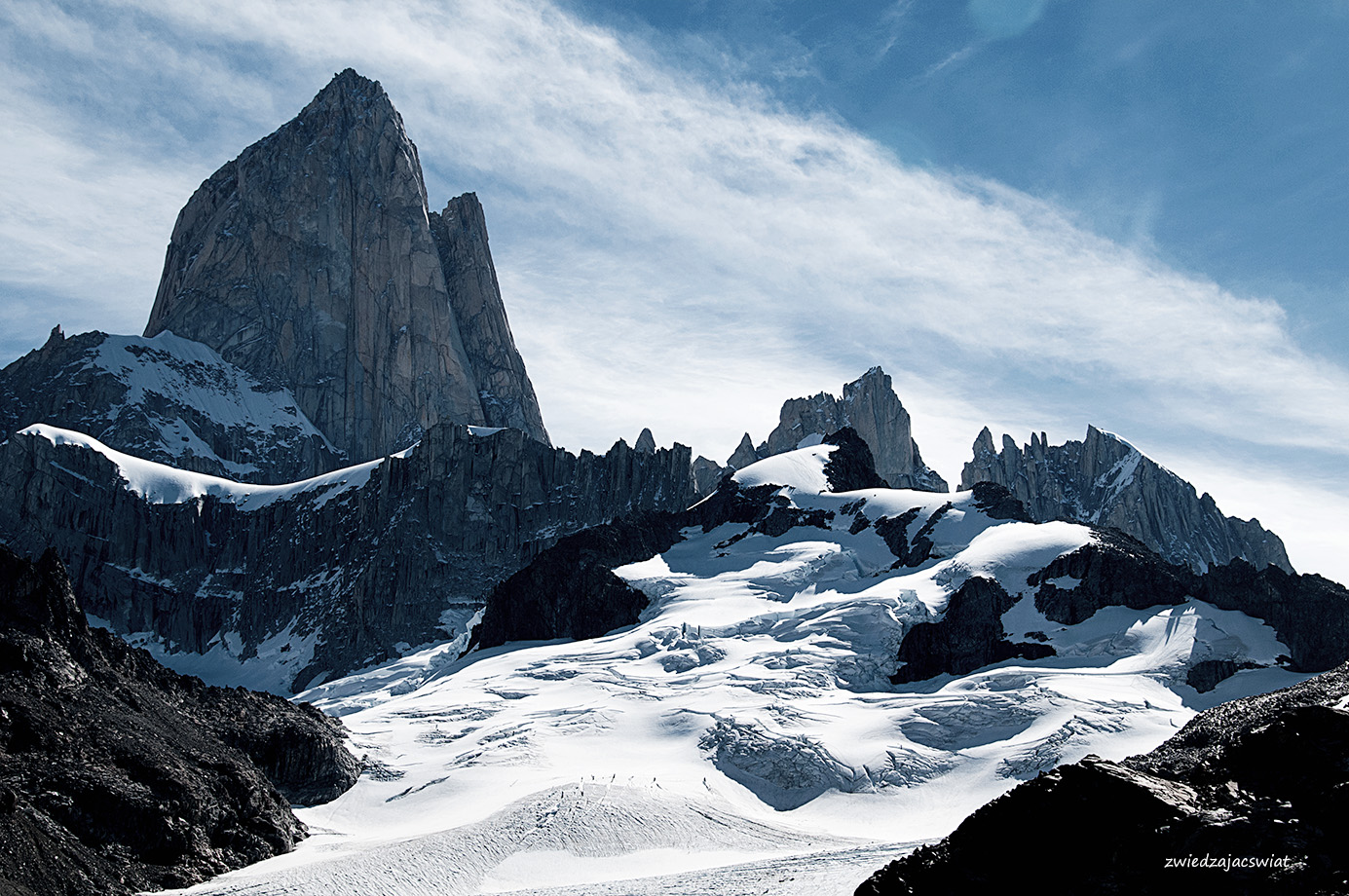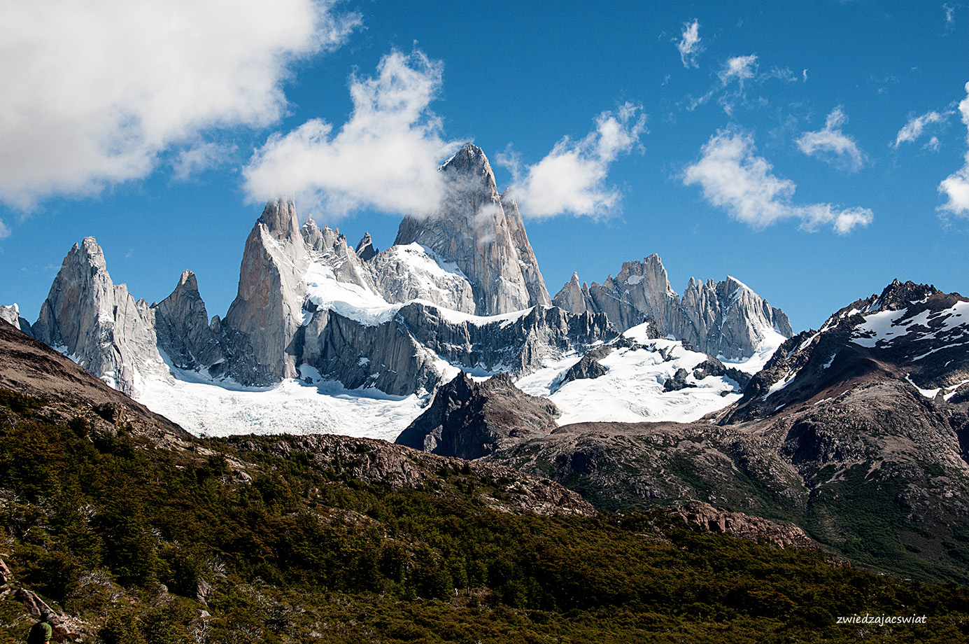 Dzień jest słoneczny jak na lato przystało – co jednak w Patagonii, słynącej ze zmiennej pogody wcale nie jest oczywiste. Mimo że, jak to było w planach, Fitz Roy nie płonie w promieniach zachodzącego słońca, prezentuje się wspaniale, w całej swej majestatycznej okazałości. Z reguły wierzchołek argentyńskiego szczytu spowity jest chmurami. Stąd jego nazwa – Dymiąca Góra. Jak miło, że tym razem jest inaczej.