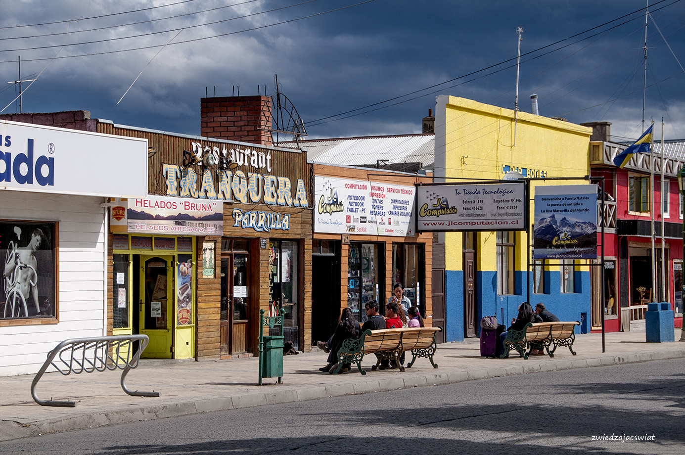 Puerto Natales sympatyczne chilijskie miasteczko z niską zabudową, starymi modelami aut na ulicach i wałęsającymi się psami, oferuje to, co związane jest z trekkingiem w Torres del Paine. Od transportu, przez wypożyczany sprzęt – namioty, śpiwory, karimaty, po spożywkę – pieczywo, konserwy, napoje, wszystko jest tu dostępne i da się zorganizować. Tylko artykuły spożywcze znikają ze sklepów szybko i w hurtowych ilościach. Tanio nie jest, ale w porównaniu z cenami w Parku, taki popyt nie dziwi. No i tam na miejscu nie wszystko można zorganizować. Po niedługim pobycie, dobrze zaopatrzeni i wyposażeni turyści zostawiają Puerto Natales, ruszając w stronę Torres del Paine, gdzie czeka na nich przygoda i najwspanialsze z górskich widoków.
