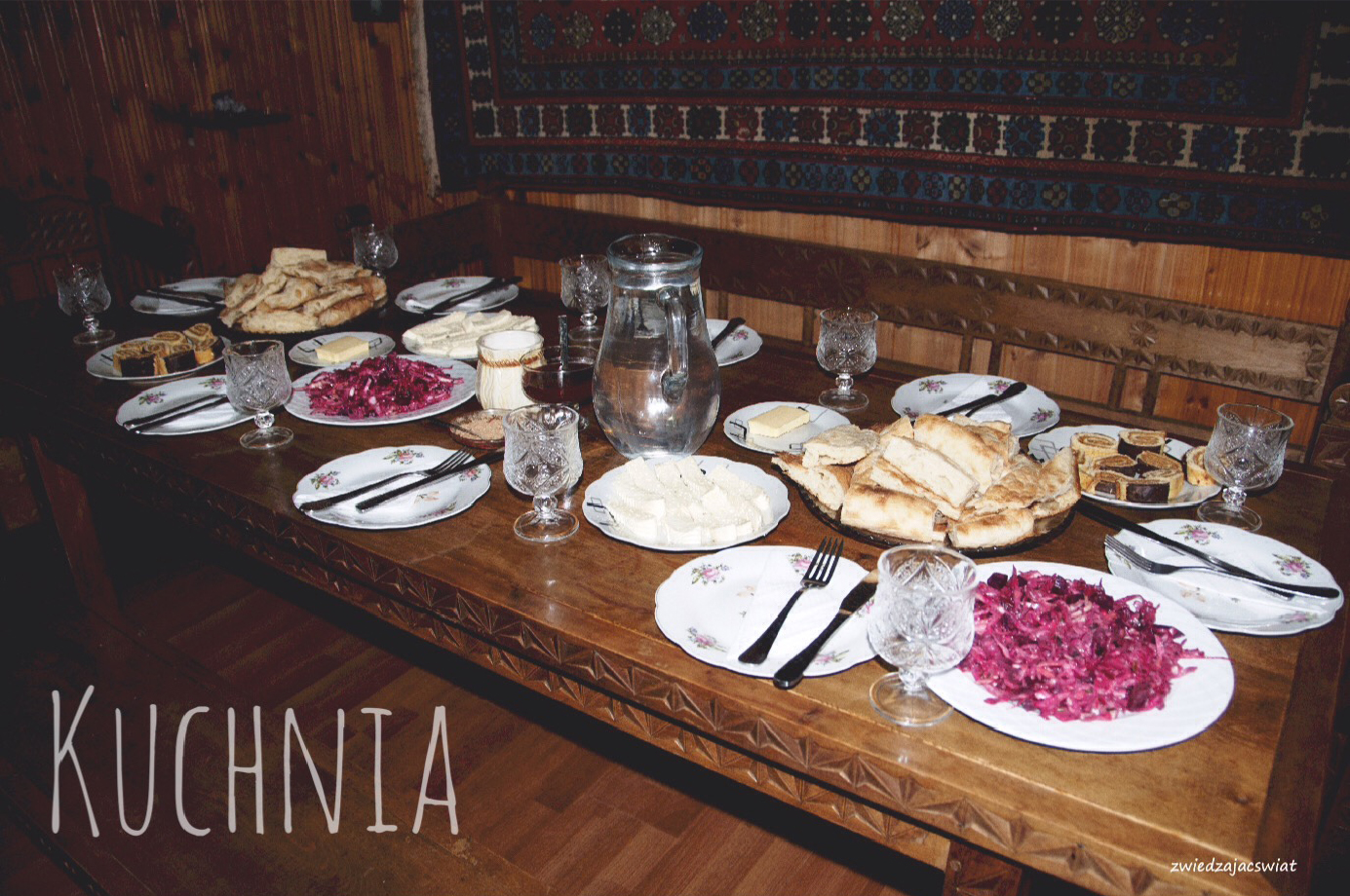 Nie rezerwowaliśmy noclegów z Polski, licząc, że poza sezonem nie będzie takiej potrzeby. Faktycznie, nie było. Najczęściej szukaliśmy czegoś na miejscu, w przypadku większych miast przeglądając wcześniej stronę Booking.com, by wyłowić oferty z przedziału cenowego, który nam odpowiadał. Nocowaliśmy na kwaterach prywatnych, w hostelach i hotelu. Ceny kształtowały się odpowiednio od 15 do 40 GEL/os. bez wyżywienia. Wybór opcji z posiłkami (śniadanie 5-10 GEL, obiadokolacja 10-15 GEL) oznacza domowe jedzenie i suto zastawiony stół. Czasami jednak w dużej ilości dań, trudno było znaleźć odpowiadające nam smaki.