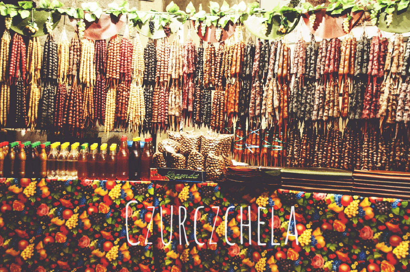 Na deser coś bardzo oryginalnego, czyli czurczchela (churchkhela). Niezorientowani mogą je uznać za…świece. W różnych odcieniach żółci, czerwieni i brązu, całymi pękami wiszą na ulicznych straganach. Czym jest czurczchela? To wybrane rodzaje orzechów w masie z soków owocowych (najczęściej soku winogronowego) i mąki, uformowanej w kształcie długich batonów (lub świecy ;)) ze sznurkiem w środku (który przed jedzeniem, usuwa się jednym pociągnięciem). W turystycznych miejscach gorszej jakości – mimo to, każda sprzedawczyni będzie zapewniać, że oryginalną czurczchelę kupicie właśnie u niej.