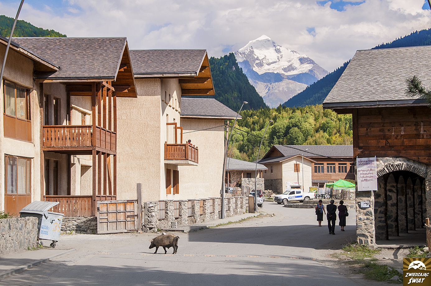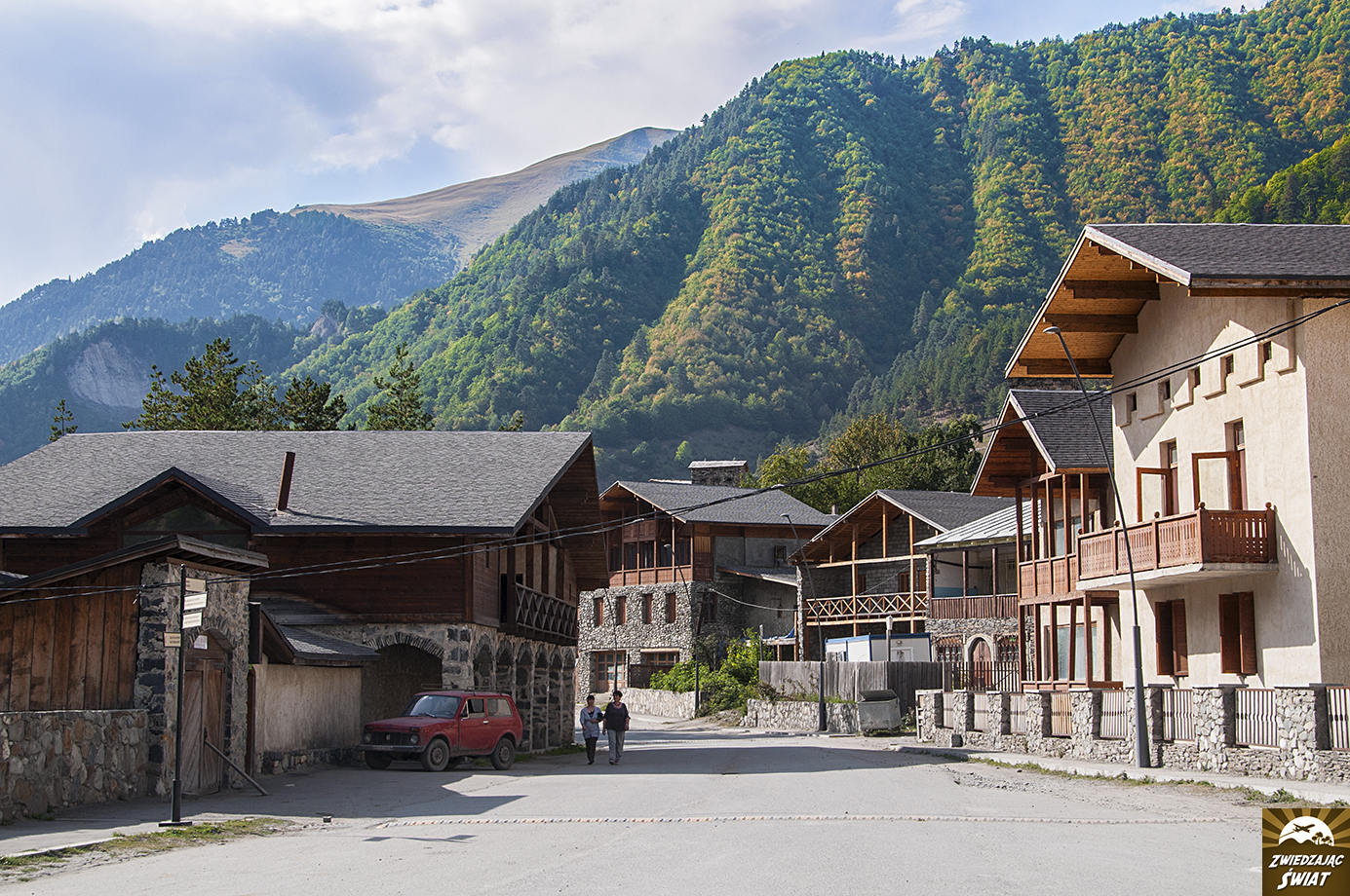 Przed chwilą wysiedliśmy z busa. Jego kierowca ze słynną, gruzińską brawurą przewiózł nas w 4,5 godziny z Kutaisi do Mestii. Zmęczeni nocnym lotem, oszołomieni pierwszym doświadczeniem jazdy w gruzińskim stylu i zachwyceni widokami z drogi, musimy się zorganizować. Plan podróży oczywiście jest, ale większość spraw będziemy załatwiać na miejscu. Na przykład lokum na najbliższą noc.