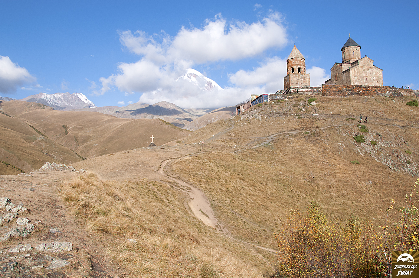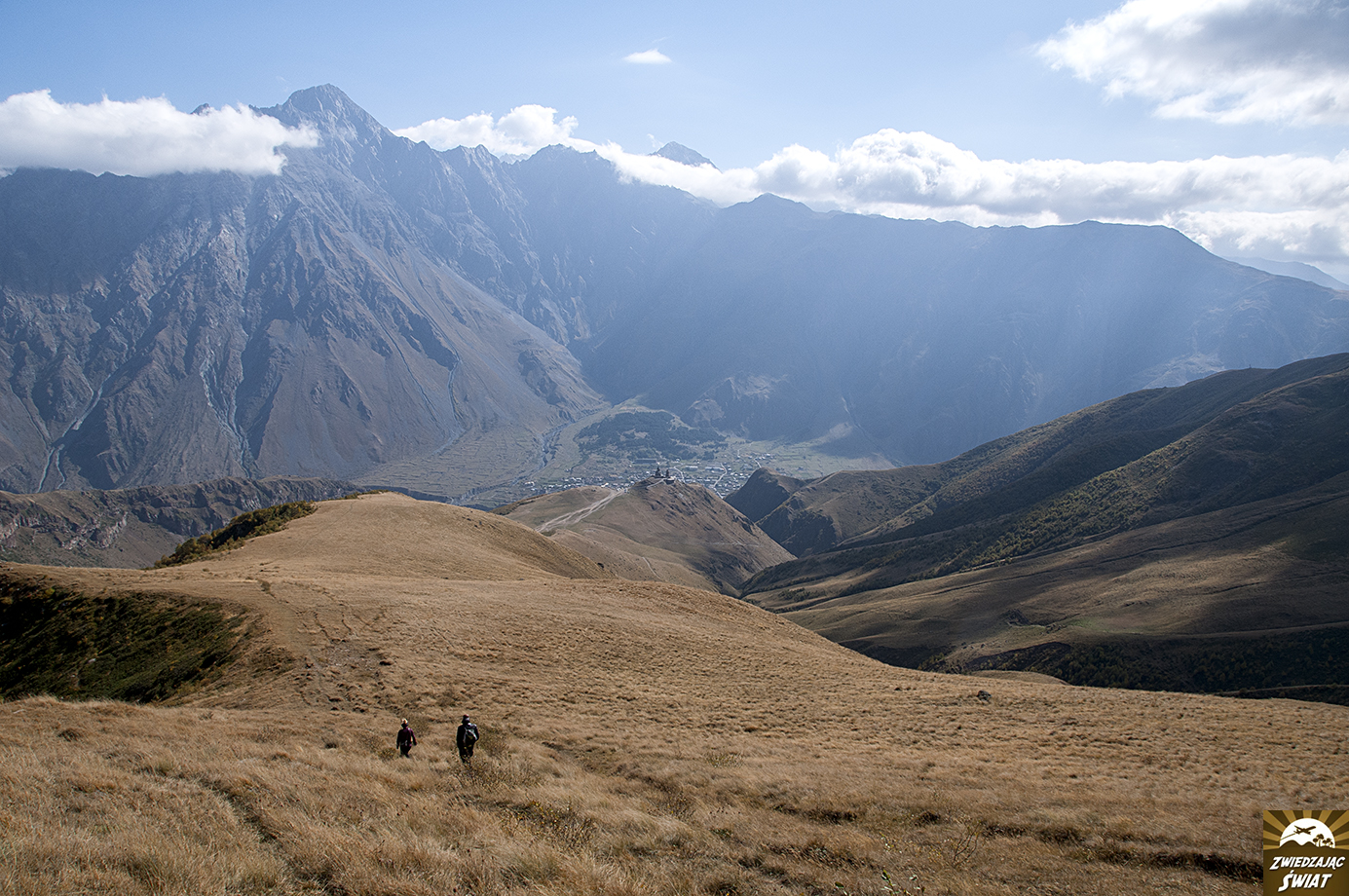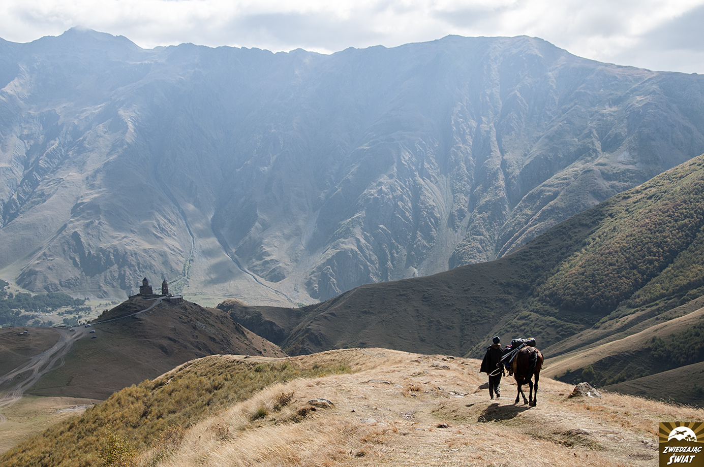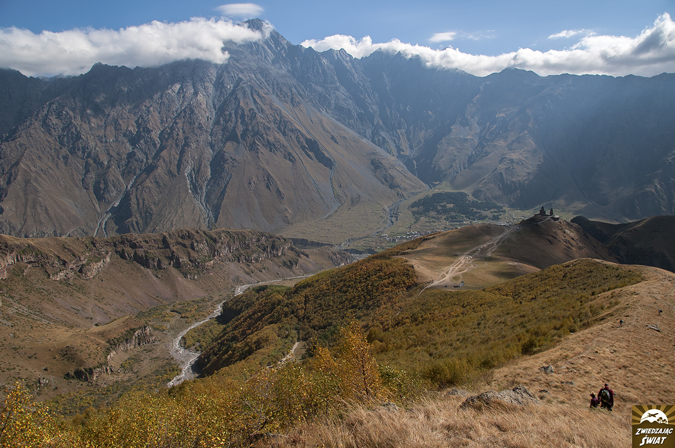 Droga powrotna z punktu, do którego dotarliśmy wędrując w stronę lodowca, nie tylko jest mniej męcząca od wspinaczki. Daje też możliwość spokojnego oglądania górskiej panoramy z kościołem Cminda Sameba w roli głównej. Od momentu, gdy znów pojawił się w zasięgu naszego wzroku, możemy podziwiać go, bez ciągłego obracania się za siebie.