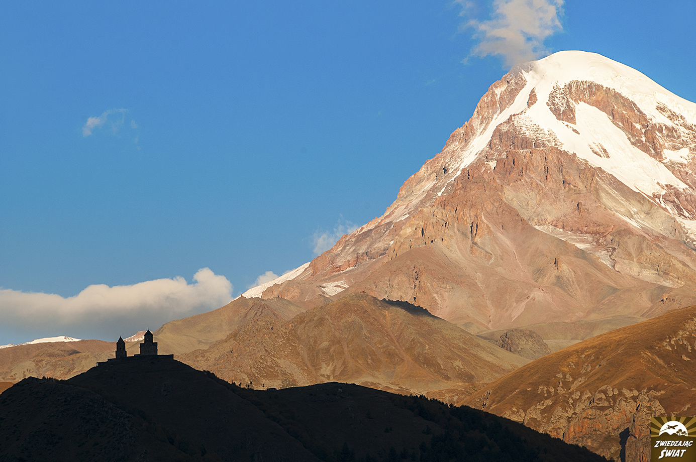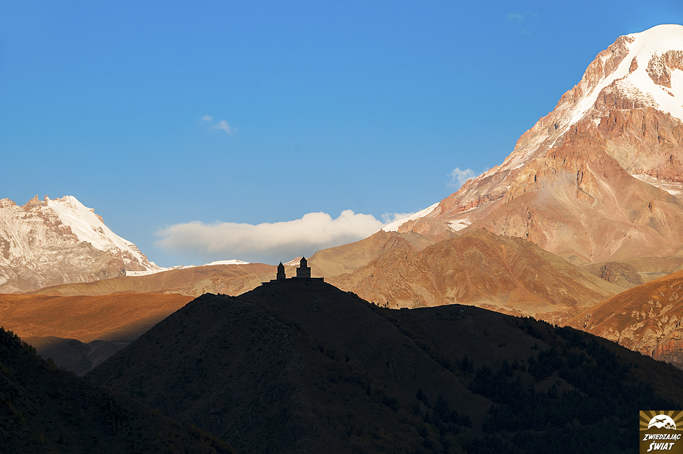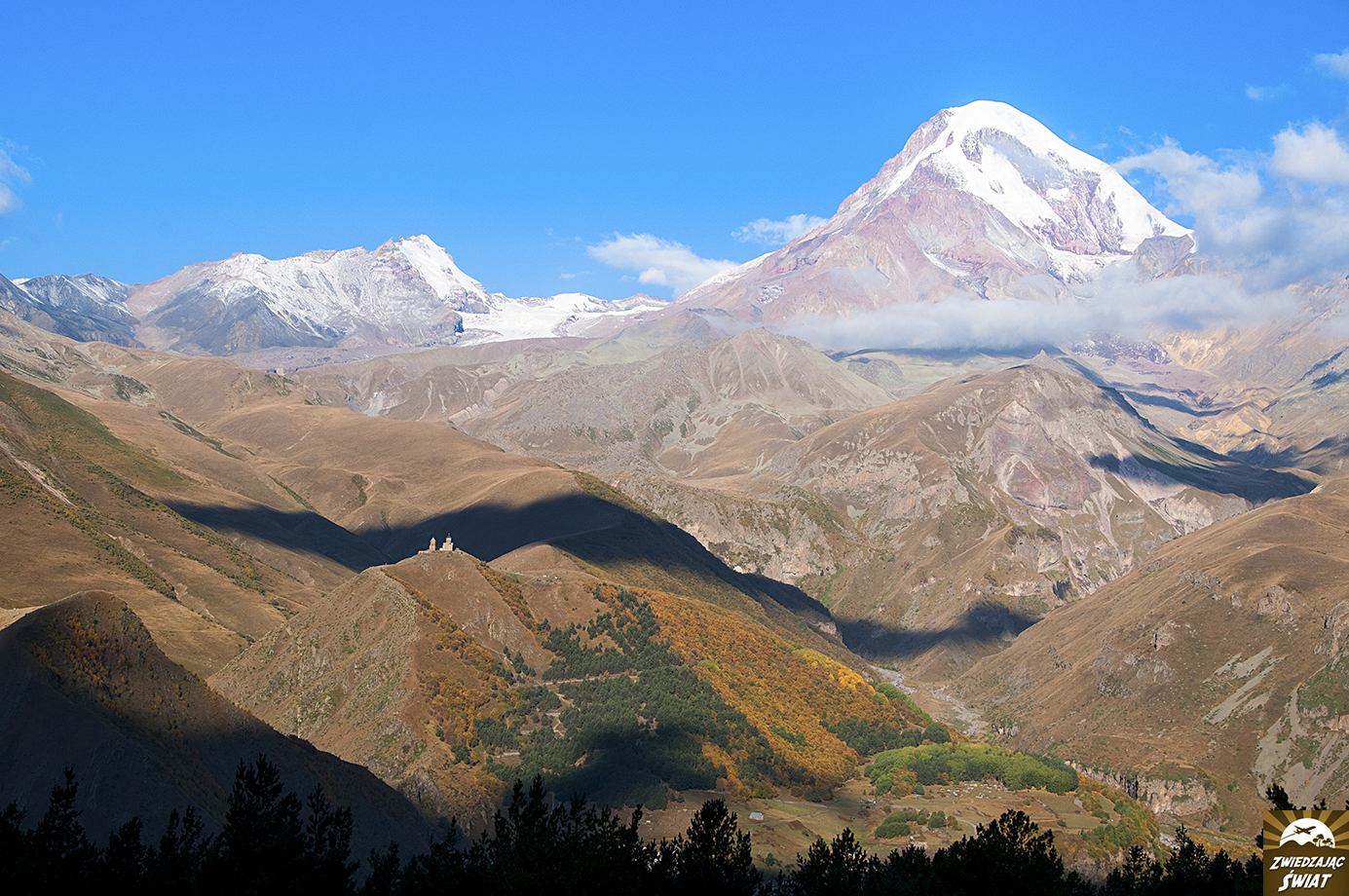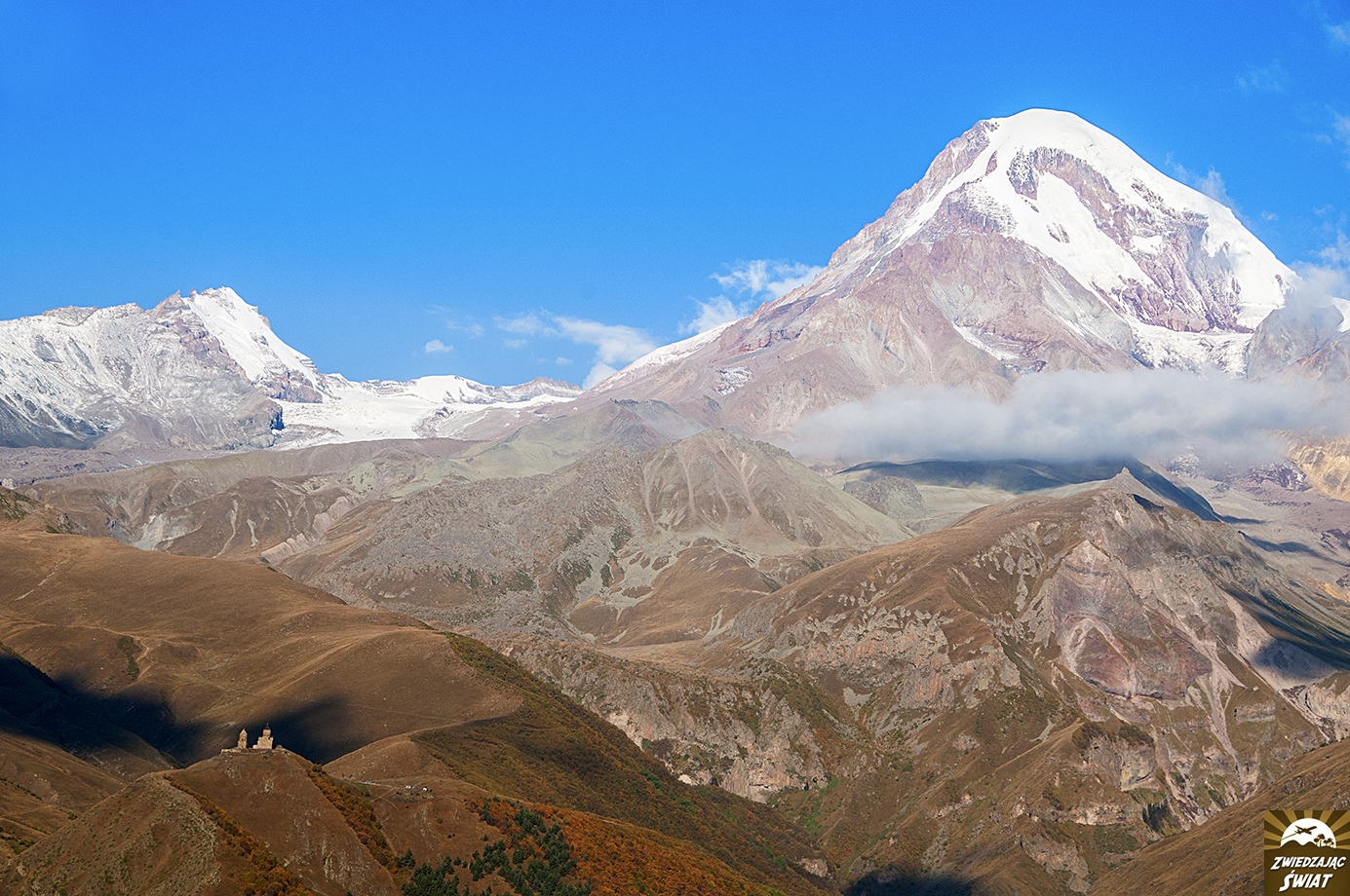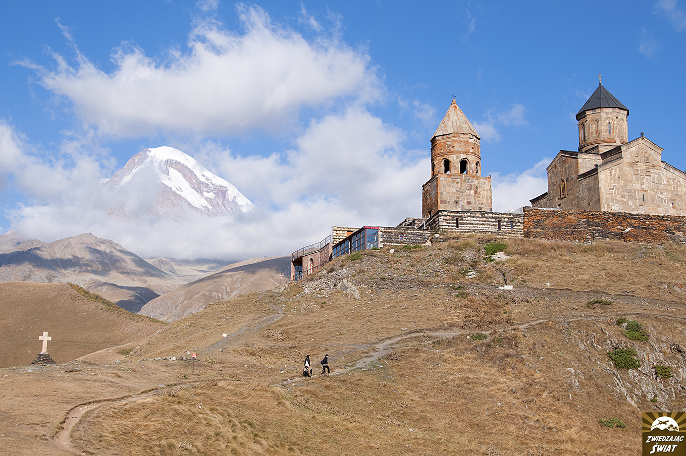 Droga powrotna z punktu, do którego dotarliśmy wędrując w stronę lodowca, nie tylko jest mniej męcząca od wspinaczki. Daje też możliwość spokojnego oglądania górskiej panoramy z kościołem Cminda Sameba w roli głównej. Od momentu, gdy znów pojawił się w zasięgu naszego wzroku, możemy podziwiać go, bez ciągłego obracania się za siebie.