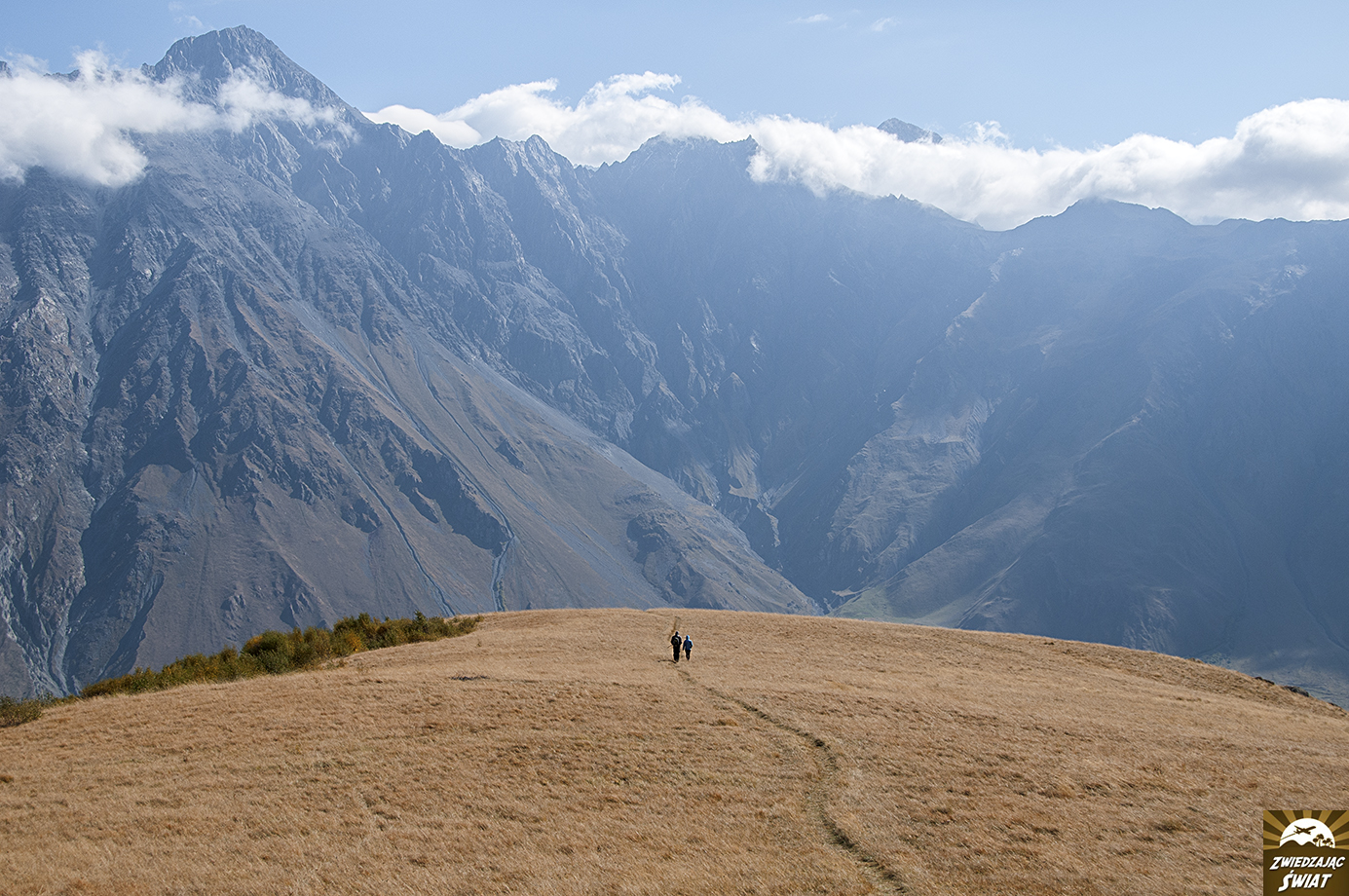 Przekroczyliśmy wysokość Rysów. Kościółek Cminda Sameba dawno pozostał w dole za nami. Widoki są piękne, choć główny punk górskiej panoramy, nie jest osiągalny dla naszych oczu. Potężny Kazbek, który tak wspaniale prezentował się rano, spowijają teraz gęste chmury.