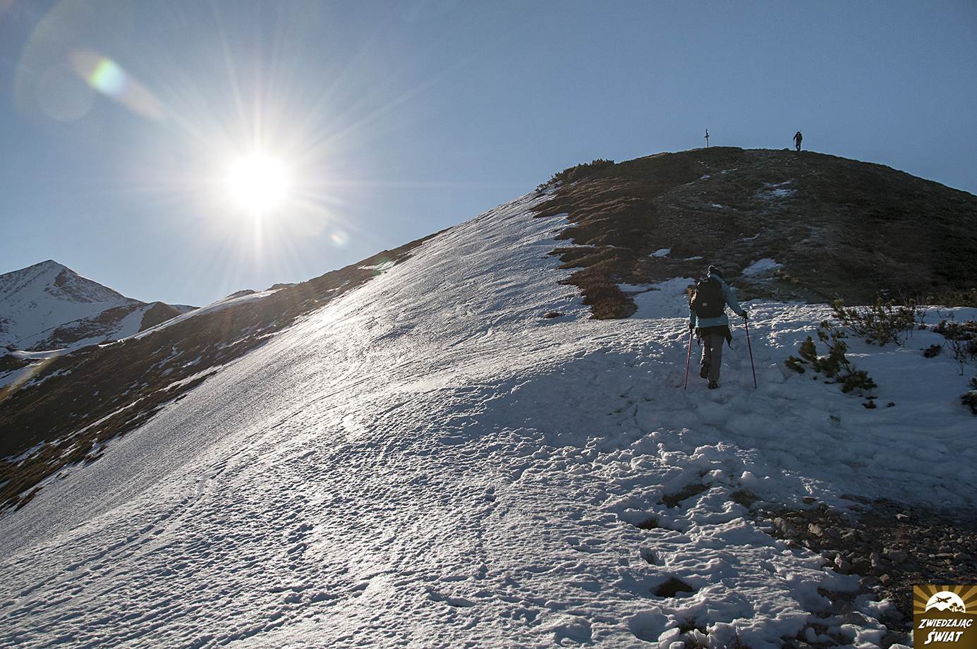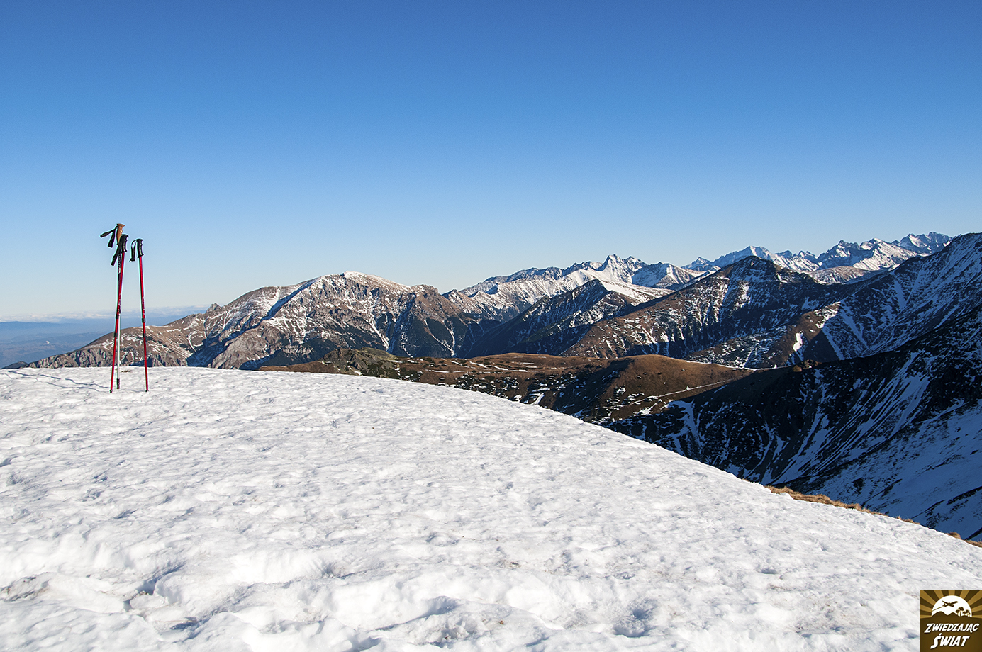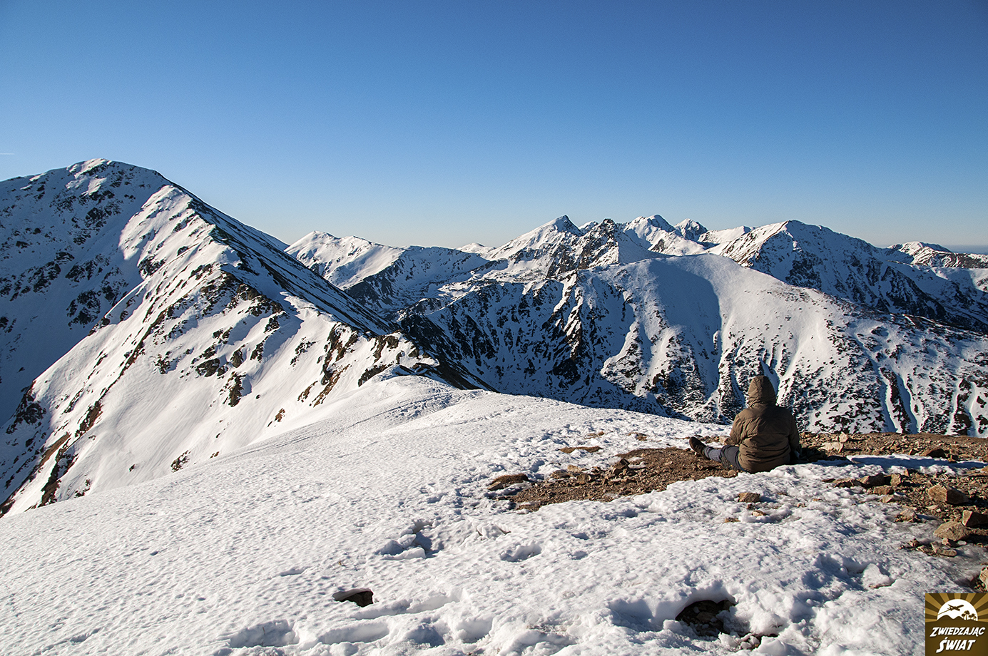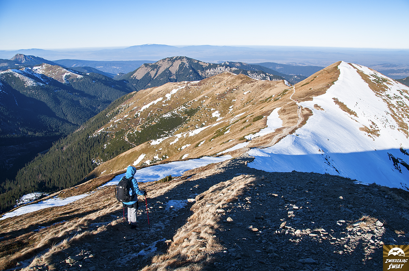 Widoki oraz porywy wiatru zapierają dech. Chętnie ruszylibyśmy dalej w stronę Starorobociańskiego lub Jarząbczego Wierchu, ale wiemy, że oznaczałoby to powrót do schroniska po zmroku. Zimowe dni są takie krótkie. A ten, dodatkowo bardzo mroźny.