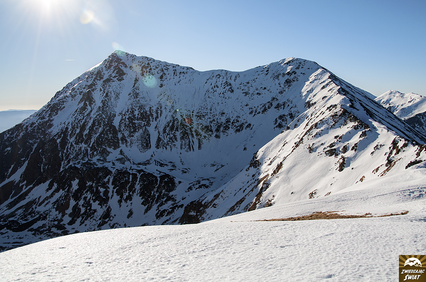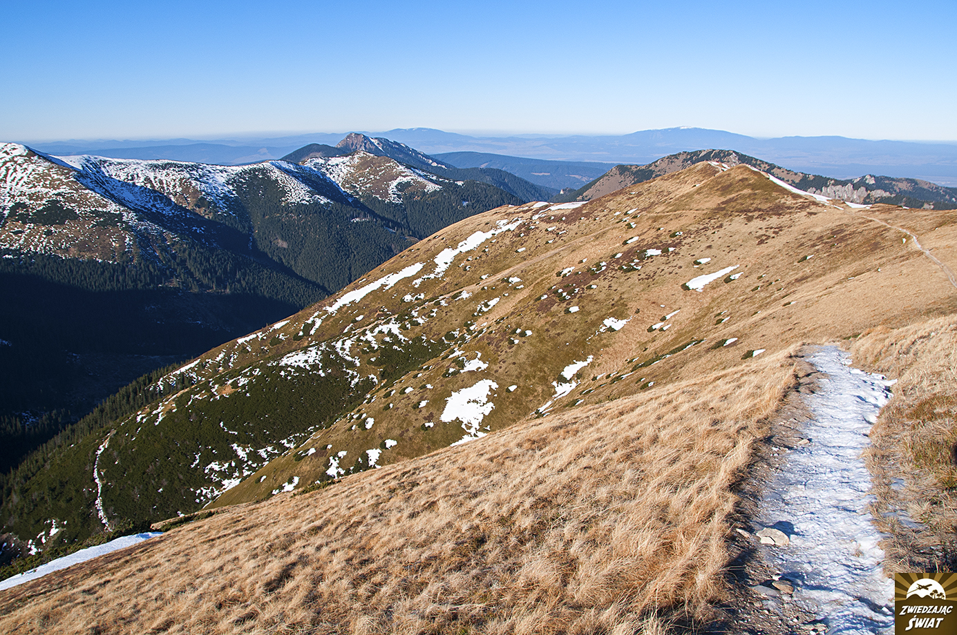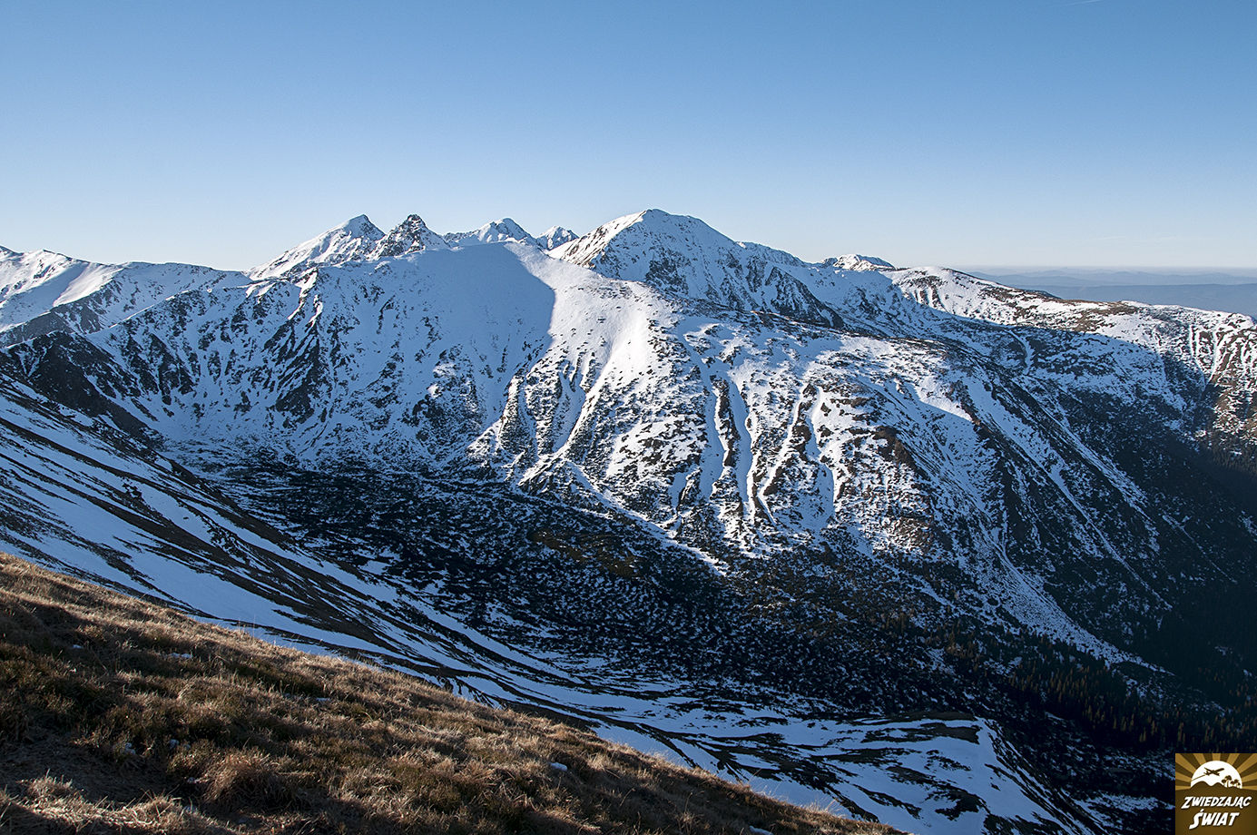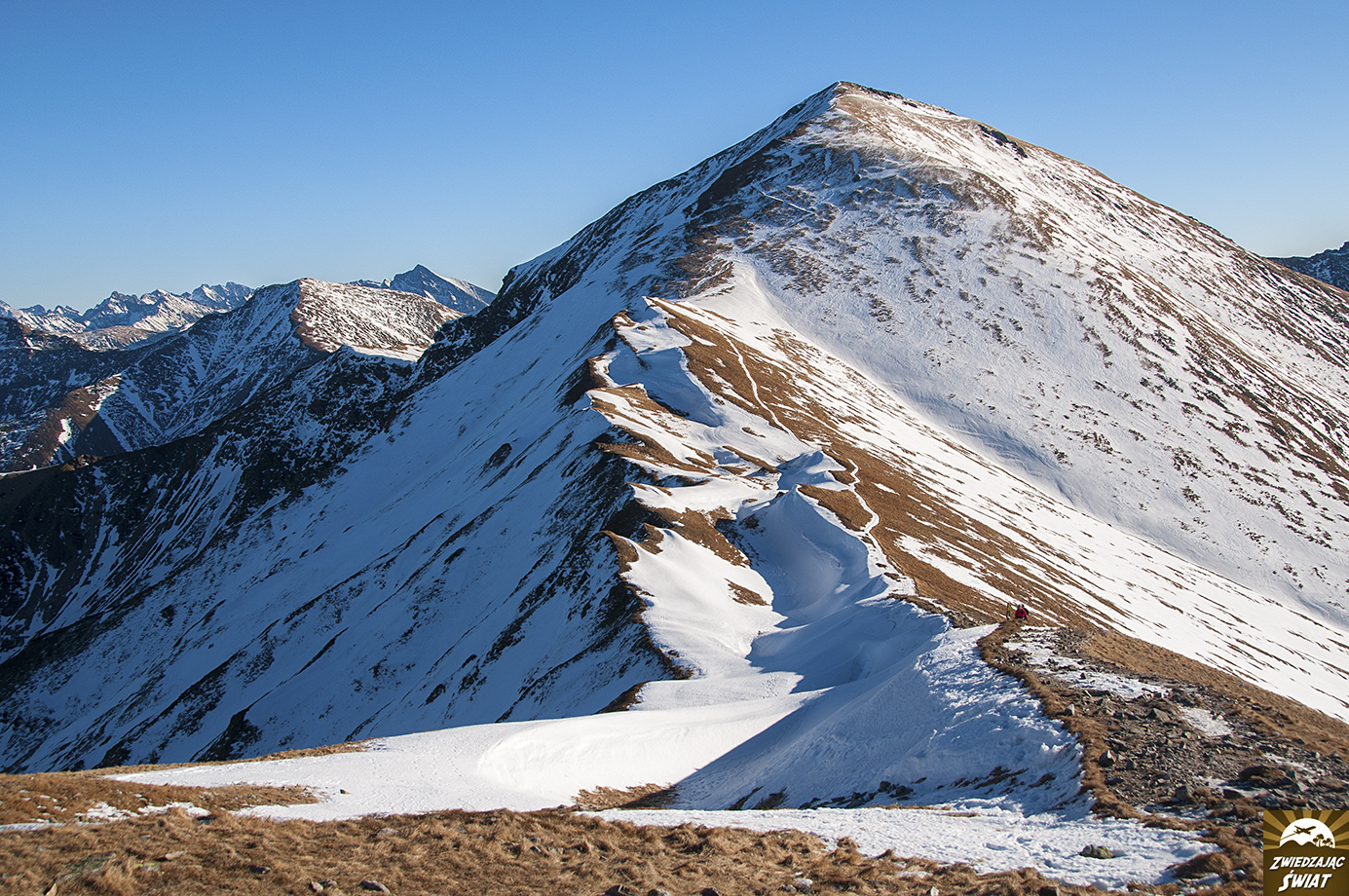 Widoki oraz porywy wiatru zapierają dech. Chętnie ruszylibyśmy dalej w stronę Starorobociańskiego lub Jarząbczego Wierchu, ale wiemy, że oznaczałoby to powrót do schroniska po zmroku. Zimowe dni są takie krótkie. A ten, dodatkowo bardzo mroźny.