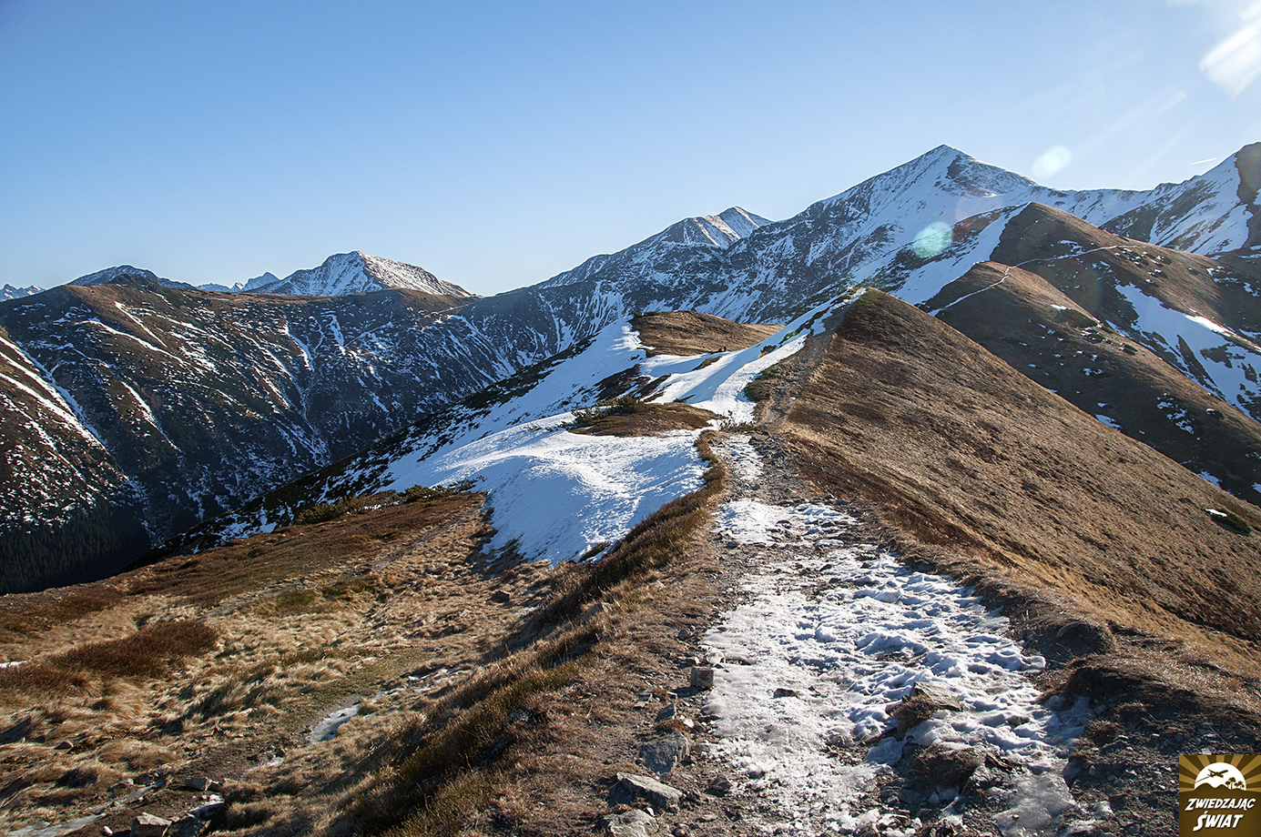 Szlak na przemian podnosi się i opada. Przez Czubik trawiastym grzbietem docieramy pod wierzchołek Kończystego. Ścieżka wiodąca od Trzydniowiańskiego, początkowo szeroka, zwęża się i prawie na całym odcinku pokryta jest zlodowaciałym śniegiem. Pomaga przejście trawiastym bokiem lub raki.