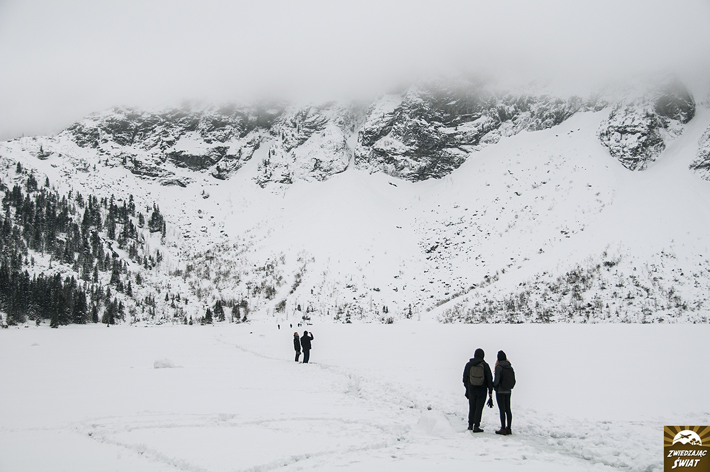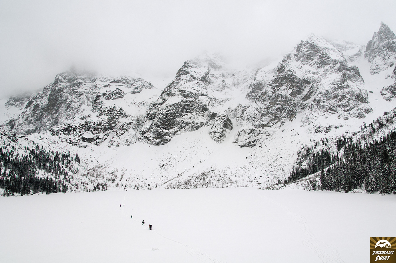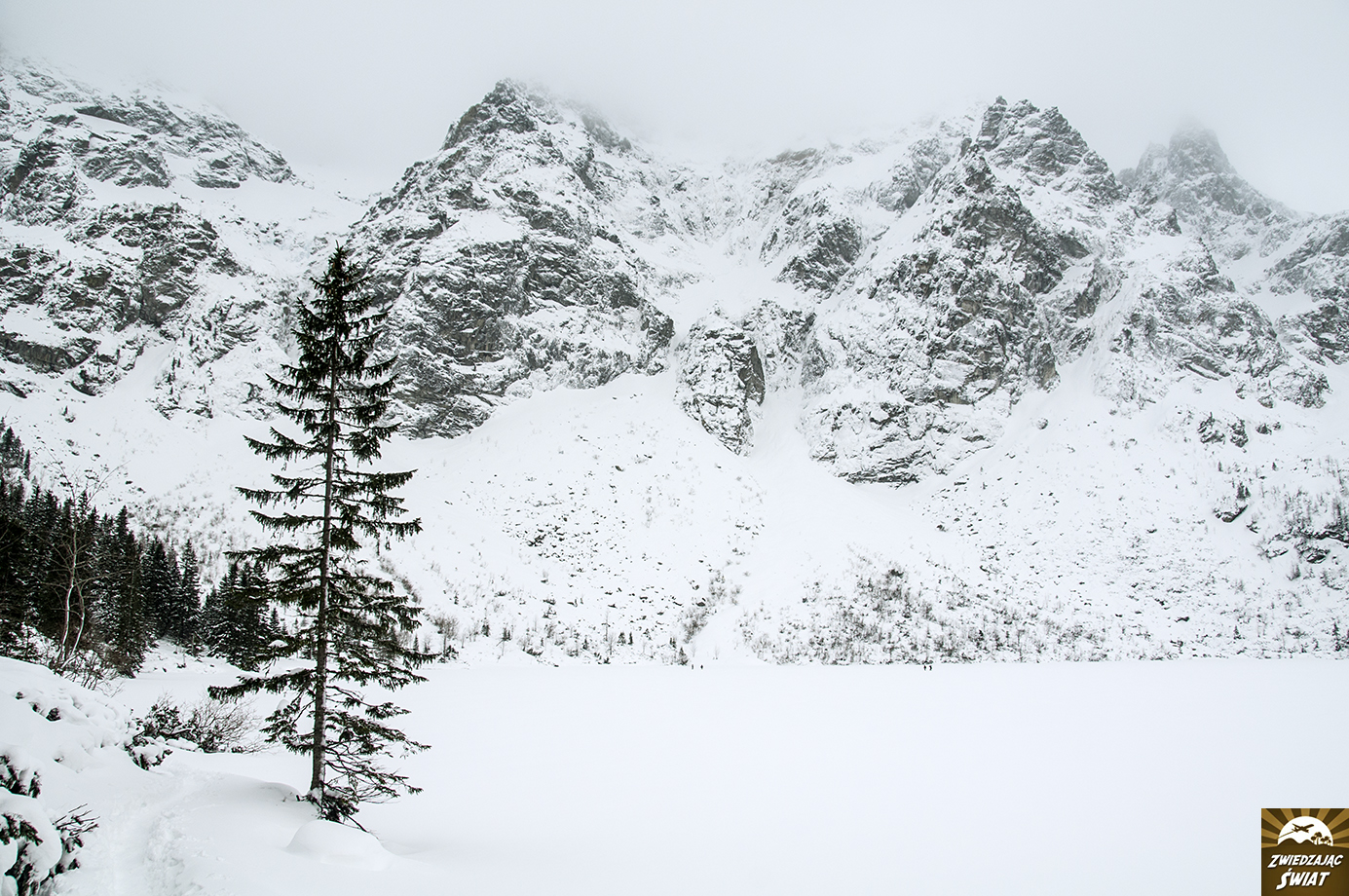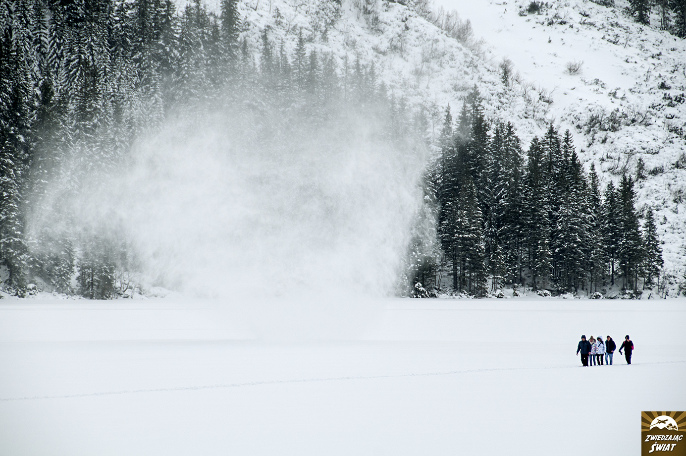 Dzięki śnieżnej powłoce asfaltowa „ceprostrada” do Morskiego Oka zamieniła się w szeroką, białą drogę osłoniętą potężnymi świerkami. Najsłynniejsze tatrzańskie jezioro – w biały deptak z maszerującymi po jego tafli (na własne ryzyko) przechodniami. Bielusieńki był również Czarny Staw pod Rysami, szczególnie za sprawą śnieżnej zadymki, która złapała nas na górze.