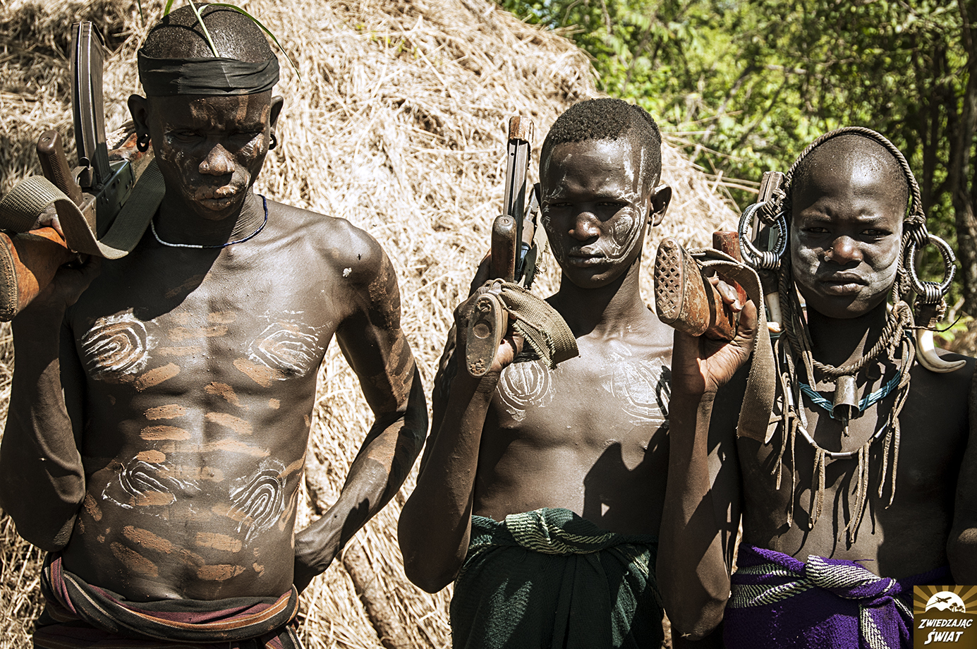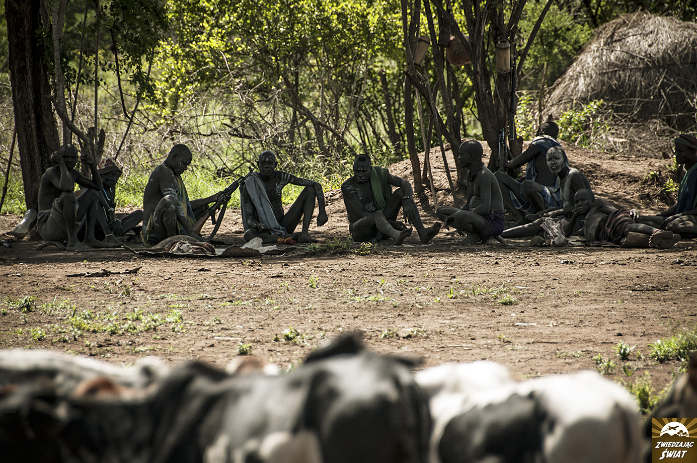 Przy wjeździe do wioski spotykamy dwa sępy. Jakie to symboliczne. W trakcie pobytu czujemy się trochę jak ofiary drapieżników. A może to Mursi padli ofiarą odwiedzających ich wioski turystów, którzy w zamian za wstęp do tego świata, zaoferowali niepotrzebne im dotąd pieniądze. Teraz Mursi znają już wartość pieniądza. Wiedzą, że za przywiezione przez podróżnych papierki, można kupić broń lub ubarwiający monotonne życie, alkohol.
