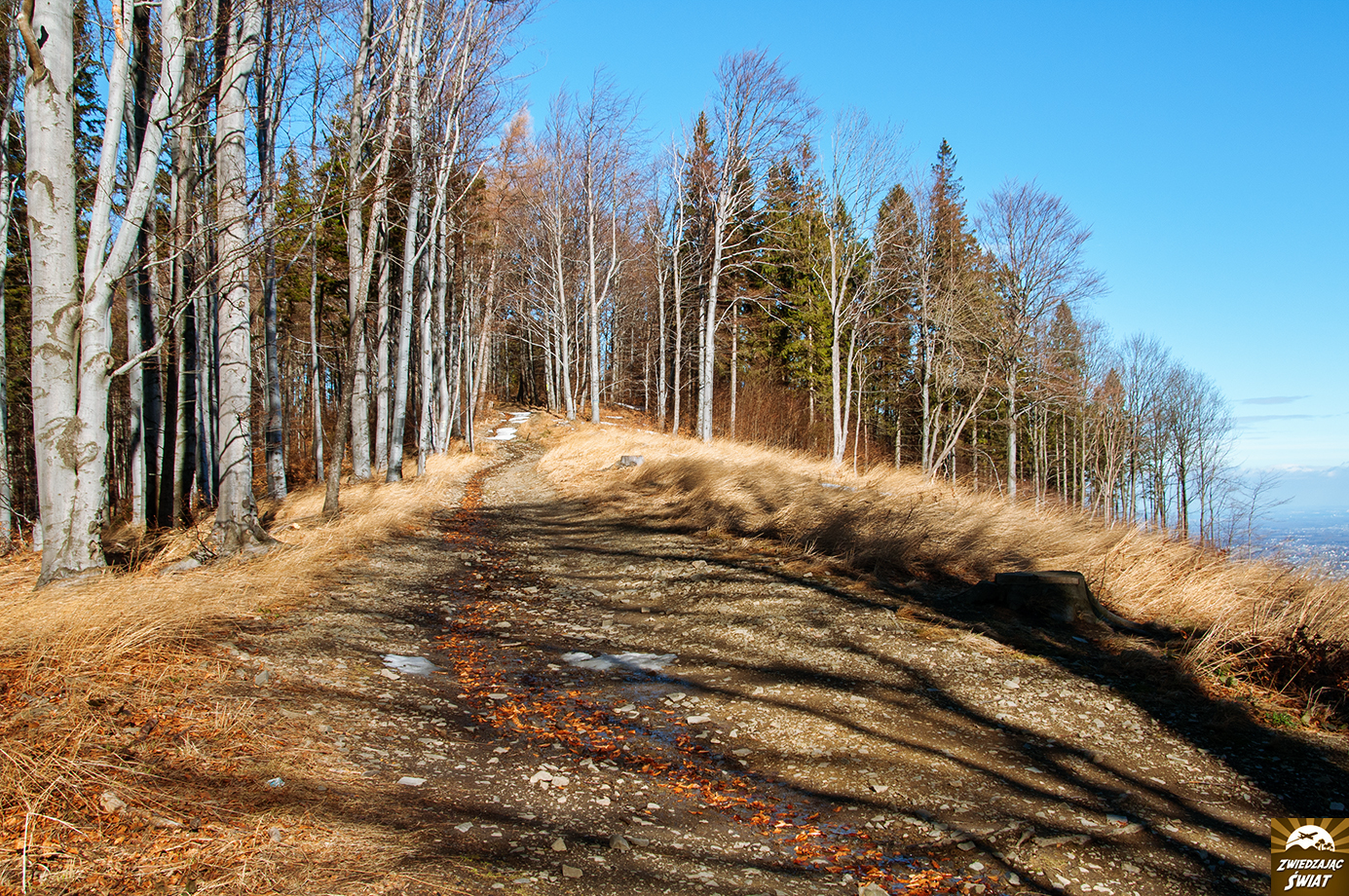 Bukowe lasy, tak jak i inne liściaste, mają to do siebie, że prezentują się pięknie o każdej porze roku, poza zimą. Szczególnie bezśnieżną zimą. Tak głębokie przemyślenia tłuką nam się po głowach, podczas podejścia czerwonym szlakiem przez Dębowiec (686 m n.p.m.) na Szyndzielnię (1026 m n.p.m.). To około 340 metrów różnicy wysokości po pokonania. Mniej więcej dwugodzinna wędrówka. Wędrówka wśród nagich bukowych pni i konarów.