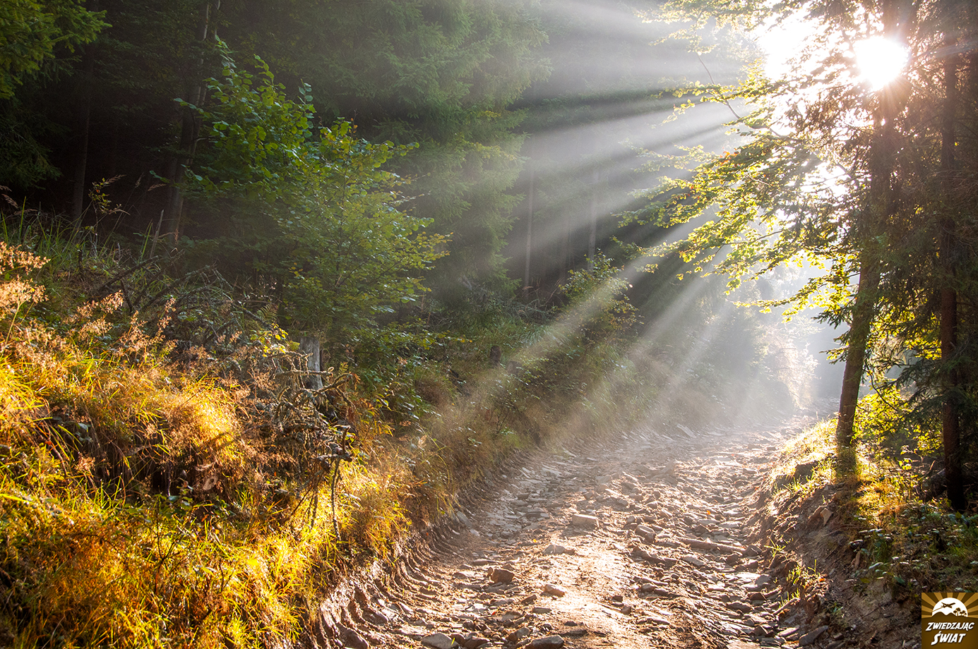 Kolejne, ponadgodzinne podejście prowadzi przez piękny świerkowy las, ścieżką ozdobioną wystającymi korzeniami drzew. Po drodze mijamy grób partyzanta. Na Małej Rycerzowej mimo, iż jest ona zalesiona, otwierają się pierwsze górskie panoramy. Te widoki, to jednak nic w porównaniu z tym co czeka nas przy zejściu z góry.
