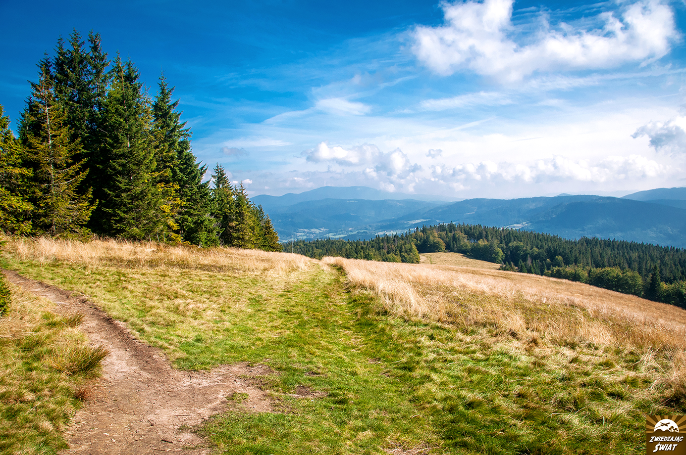 Już sama trasa, do miejsca w którym rozpoczniemy tego dnia wędrówkę, oferuje wspaniałe, faliste panoramy. Ciągną się one nieprzerwanie od Żywca, przez Węgierską Górkę, aż po Rycerkę Dolną w kierunku na Zwardoń. W Joneczkowych Rycerkach parkujemy i ruszamy niebieskim szlakiem w stronę Mładej Hory. To niecała godzina podejścia leśną drogą, z otwierającymi się od czasu do czasu rozleglejszymi widokami.
