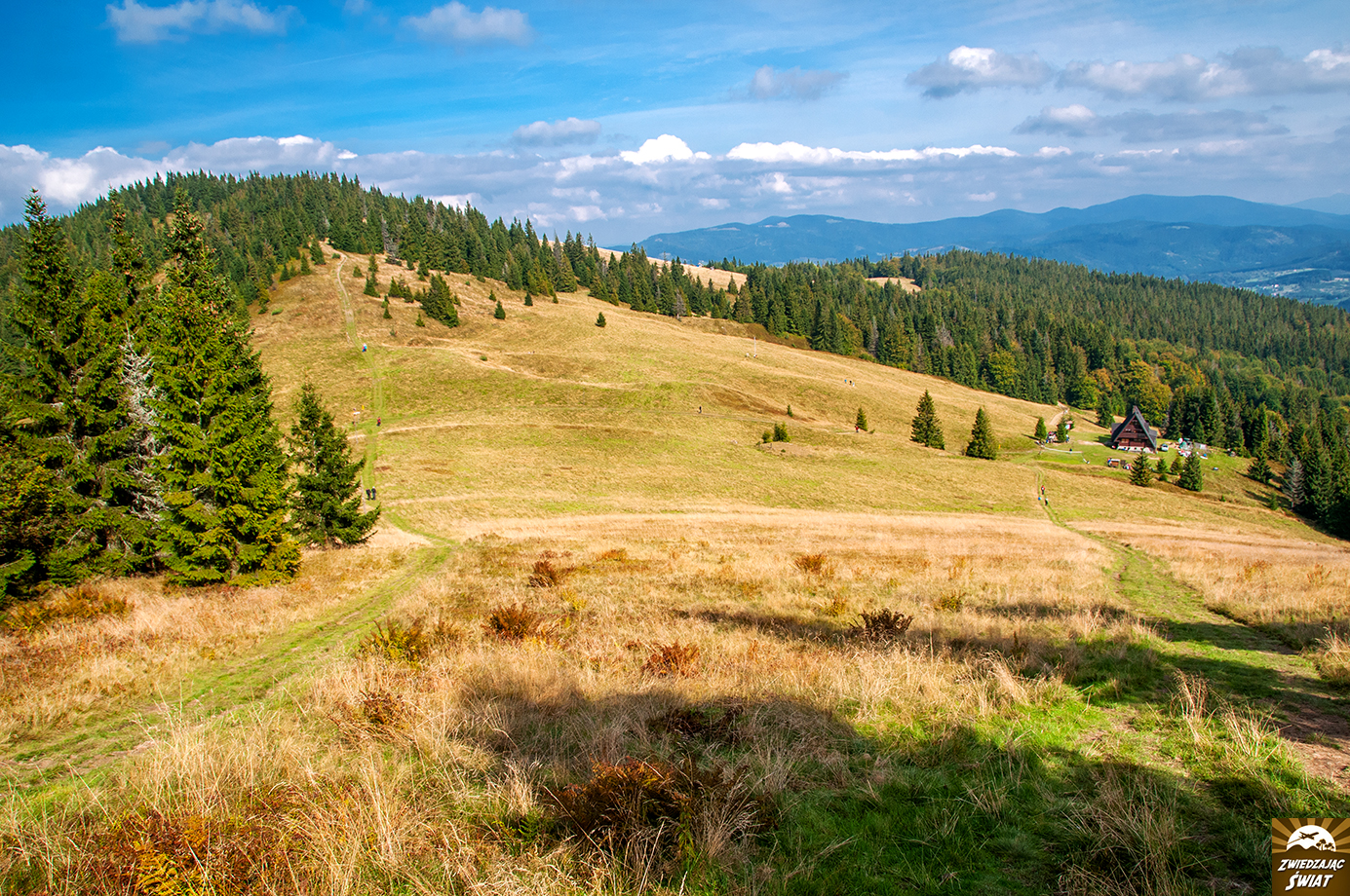 Hala Rycerzowa i znajdująca się na niej Przełęcz Halna (pomiędzy Małą i Wielką Rycerzową), zachwyca przestrzenią, złotym kolorem poruszanych wiatrem traw oraz wspaniałymi widokami, od Babiej Góry i Pilska, na Tatrach kończąc. Tutaj właśnie, ulokowała się klimatyczna bacówka, której zdjęcie na tle pofałdowanych górskich grzbietów, ściągnęło nas w to miejsce.