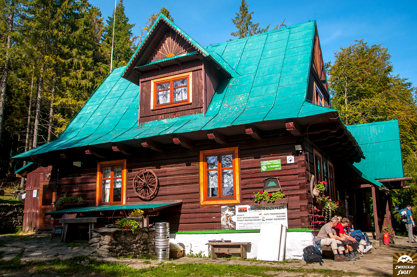 Przed nami kolejna, godzinna przeprawa leśnym szlakiem do Przełęczy Przegibek. W końcu wychodzimy na otwartą przestrzeń, gdzie rozłożyły się nieliczne domki tutejszego przysiółka. Jeszcze 15 minut drogi i jesteśmy przed schroniskiem PTTK na Przegibku. Odpoczywać nie bardzo jest po czym, bo dotychczasowa trasa do trudnych i czasochłonnych nie należała, mimo to lokujemy się przed jedną z drewnianych ław na zewnątrz schroniska. Lubimy atmosferę takich miejsc. Chodzi też o to, by delektować się pięknym, jesiennym dniem w górskim klimacie. Spieszyć się nie musimy, bo przed nami jeszcze tylko niespełna godzinny powrót zielonym szlakiem do Joneczkowych Rycerek.
