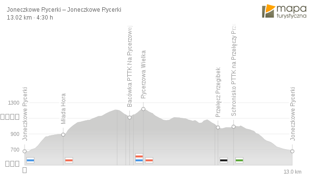 Przy jednej z drewnianych ław stojących przed bacówką, zajadamy się pysznymi racuchami z jagodowym sosem. Jest wietrznie, ale jesienne słońce przygrzewa rozkosznie. Nasyceni pysznym posiłkiem i widokami, wracamy na Przełęcz Halną (1165 m n.p.m.) pod krzyżówkę szlaków. Czas na Wielką Rycerzową (1226 m n.p.m.). Wchodząc na górę, wciąż odwracamy się, by chłonąć piękną panoramę hali z bacówką i Małą Rycerzową w roli głównej. Po 15 minutach jesteśmy na szczycie.