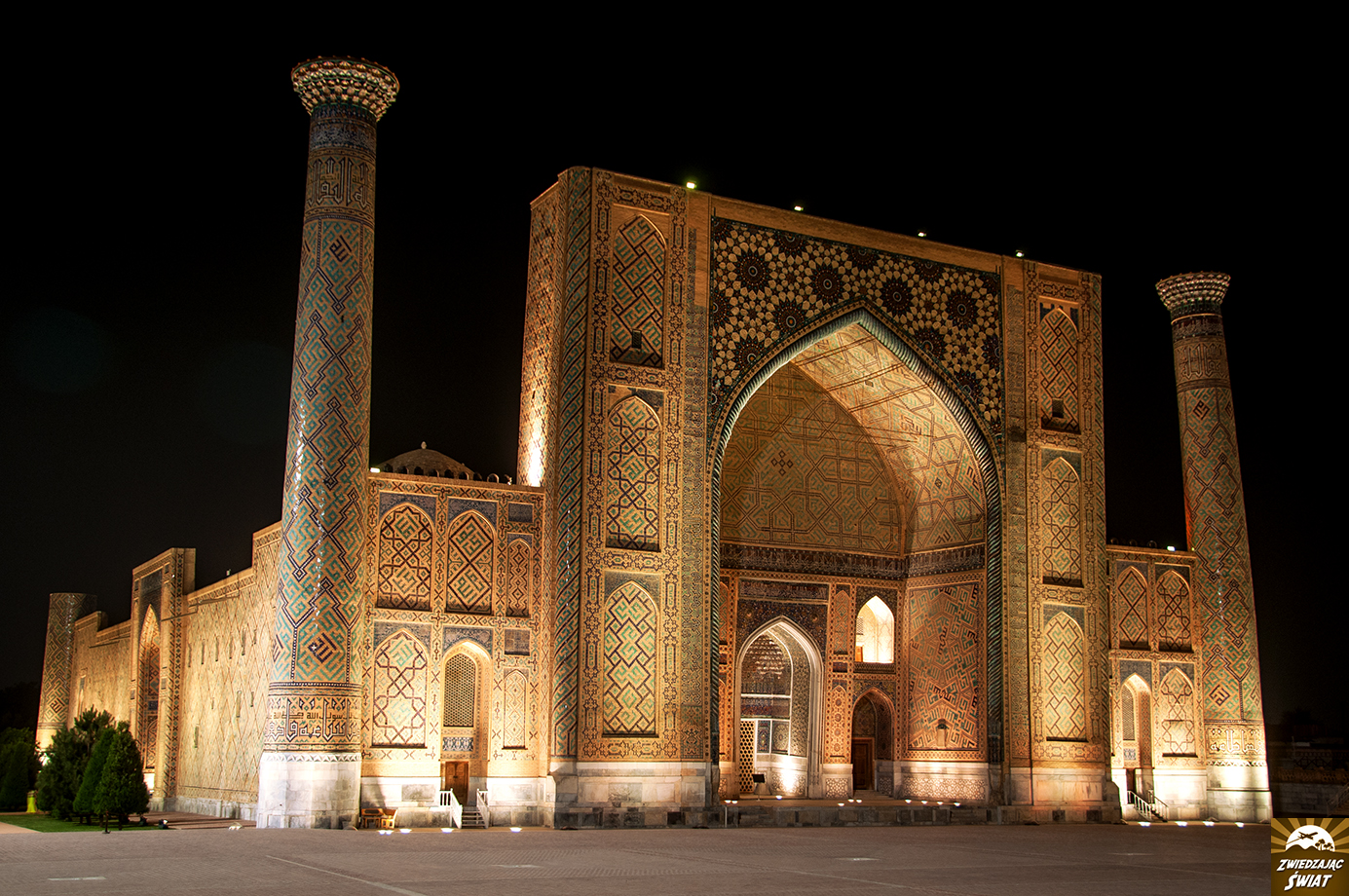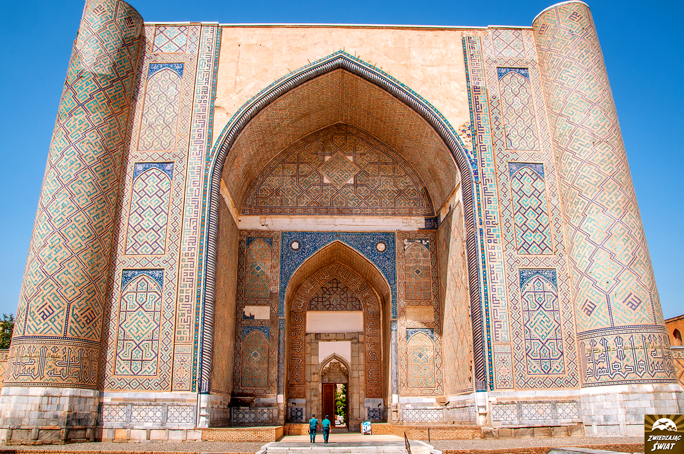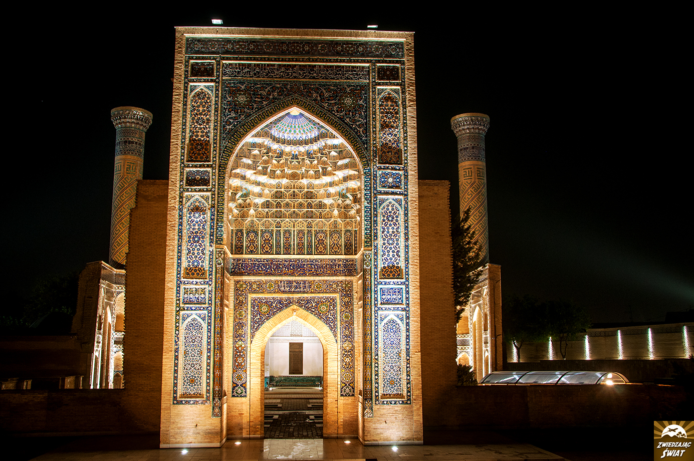 Na miejscu jesteśmy tuż przed zachodem słońca. Jego ciepłe, łagodne promienie opierają się już tylko na turkusowych kopułach tutejszych budowli. W wąskiej alejce pomiędzy mauzoleami panuje półmrok. Nawet przy tak nikłym oświetleniu, niebieskie mozaiki na fasadach budynków, oszałamiają bogactwem i precyzją wzorów. W dodatku mamy je na wyłączność – poza nami, nikt o tej porze nie zakłóca panującej tu ciszy i spokoju. Nadciągający wieczór przynosi ulgę od upału, i powoli zamyka pierwszy dzień naszej obecności w Samarkandzie.