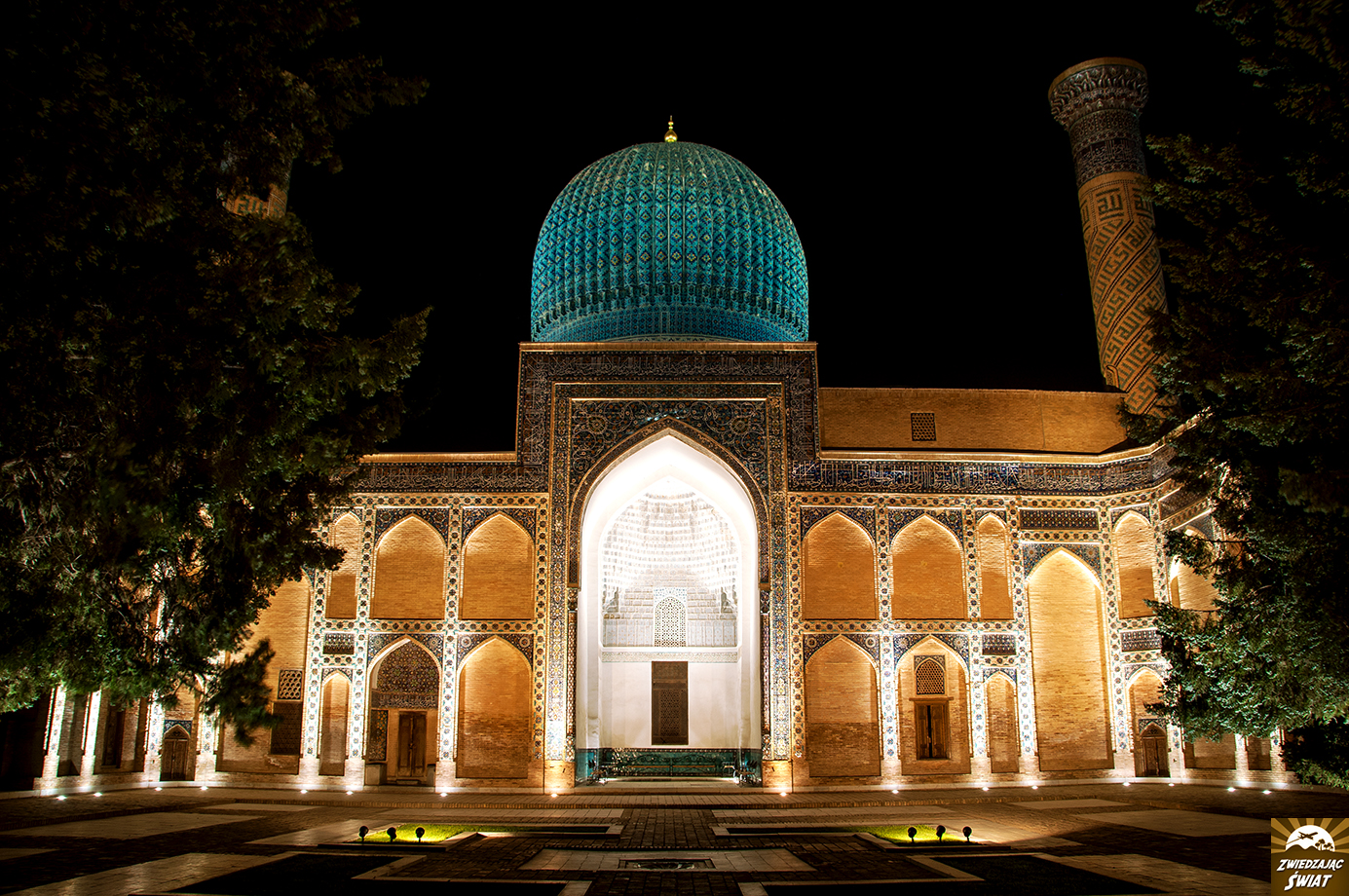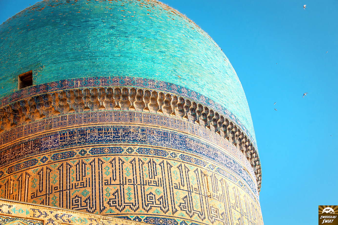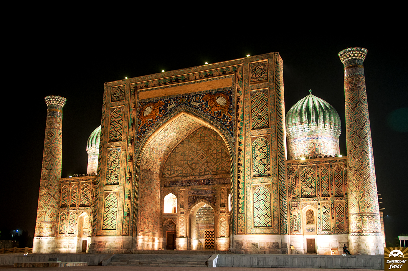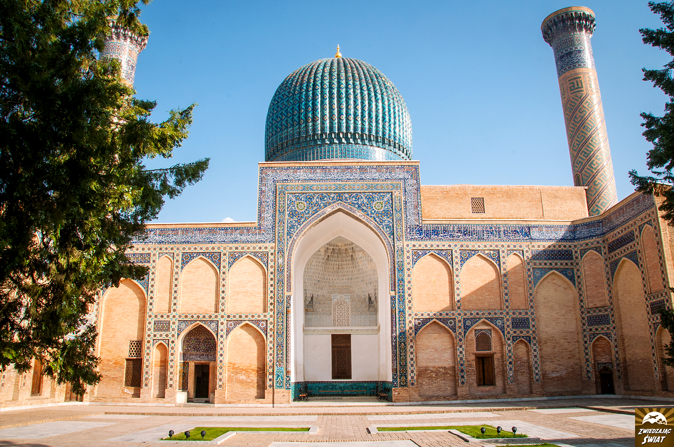 Na miejscu jesteśmy tuż przed zachodem słońca. Jego ciepłe, łagodne promienie opierają się już tylko na turkusowych kopułach tutejszych budowli. W wąskiej alejce pomiędzy mauzoleami panuje półmrok. Nawet przy tak nikłym oświetleniu, niebieskie mozaiki na fasadach budynków, oszałamiają bogactwem i precyzją wzorów. W dodatku mamy je na wyłączność – poza nami, nikt o tej porze nie zakłóca panującej tu ciszy i spokoju. Nadciągający wieczór przynosi ulgę od upału, i powoli zamyka pierwszy dzień naszej obecności w Samarkandzie.