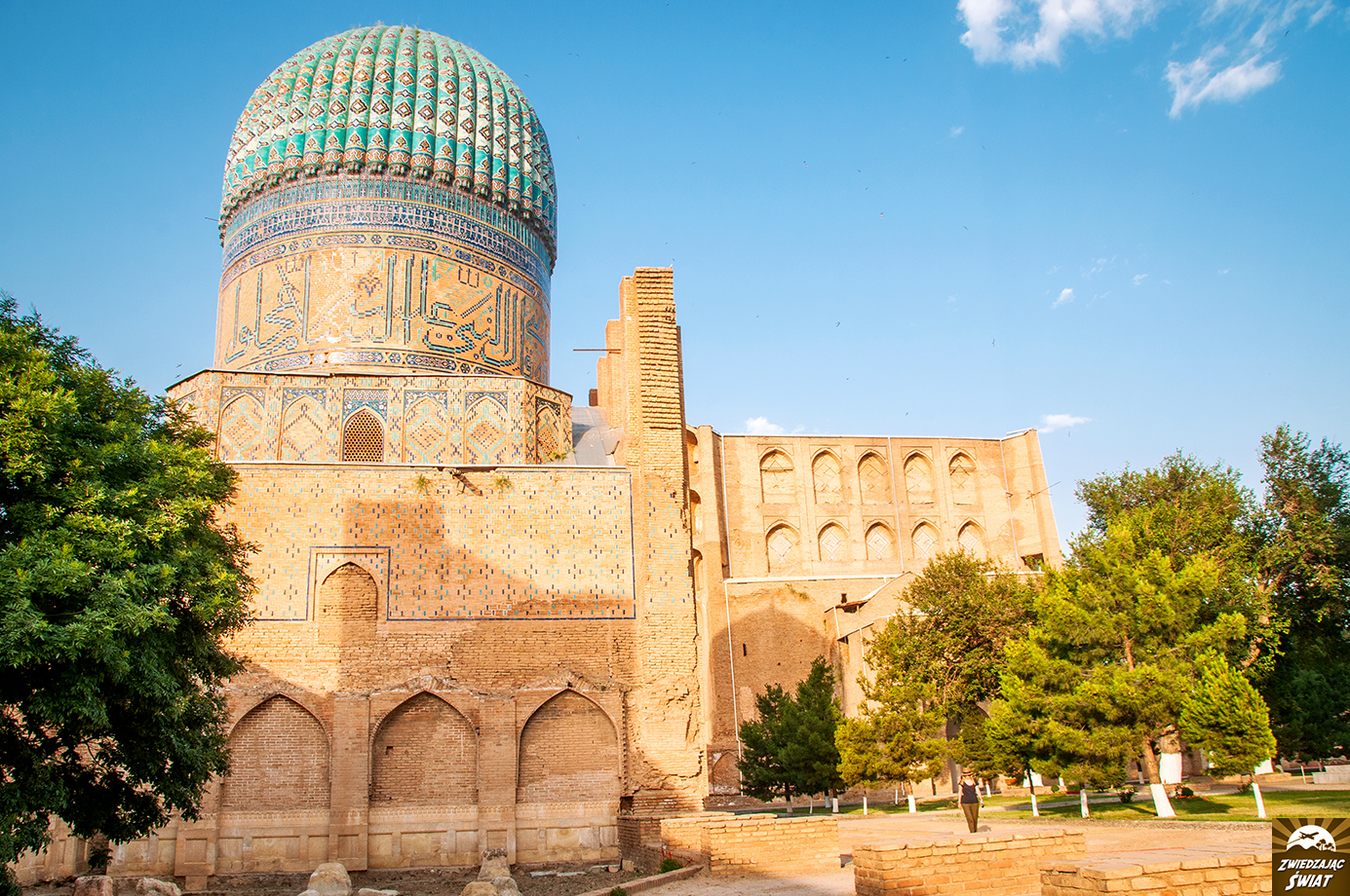 Póki co, budowle Registanu oglądamy tylko z zewnątrz, po czym kierujemy się w stronę następnego must see Samarkandy. Krótki spacer i jesteśmy przed meczetem Bibi Chanum. Zbudowany na polecenie Timura w 1399 roku, obecnie pełni rolę muzeum i mimo widocznych śladów zniszczenia, spowodowanych wadami konstrukcyjnymi oraz trzęsieniem ziemi z 1897 roku, nadal zachwyca pięknem i wielkością. Naprzeciwko niego stoi znacznie skromniejsza budowla. To mauzoleum o tej samej nazwie, co potężna świątynia. Powtarzające się słowa „Bibi Chanum” tłumaczyć należy jako „starsza żona”. Dotyczą one małżonki Timura, która przyczyniła się do budowy tego kompleksu.