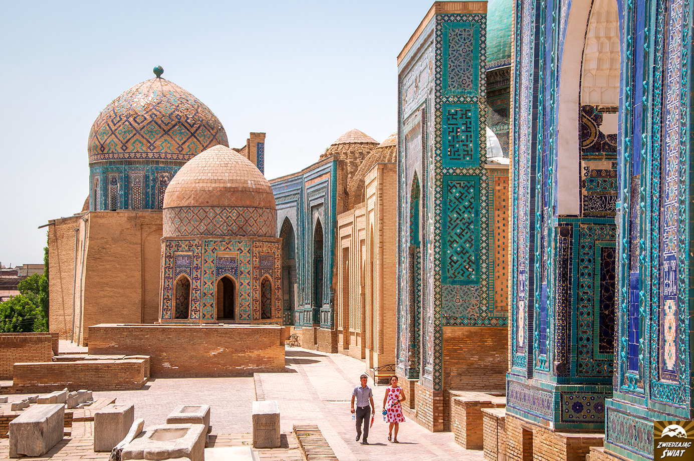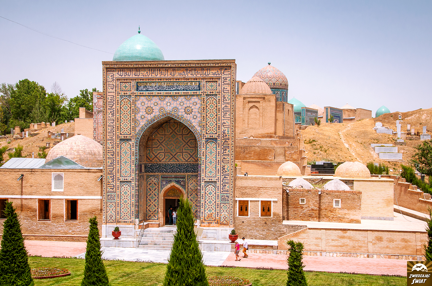 Do kolejnego miejsca drepczemy spod meczetu Bibi Chanum dłuższą chwilę. Przekraczając ruchliwą ulicę, zatrzymujemy się u stóp wzniesienia, na którym ulokowany jest muzułmański cmentarz z XIV i XV wieku. To słynny zespół Szach-i Zinda, dosłownie – „żywy król”. Nazwa ta odnosi się do osoby Kusamy ibn Abbasa, kuzyna proroka Mahometa, który przybył do Samarkandy, by głosić islam. Trafiony przez niewiernych strzałą, znalazł schronienie w jaskini, w której ponoć żyje po dzień dzisiejszy.