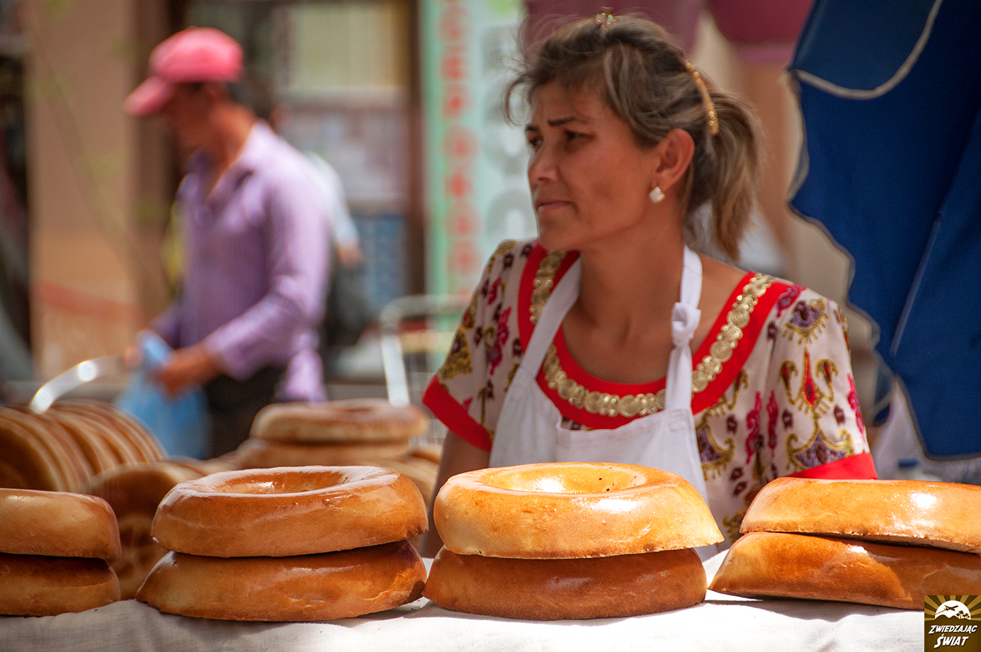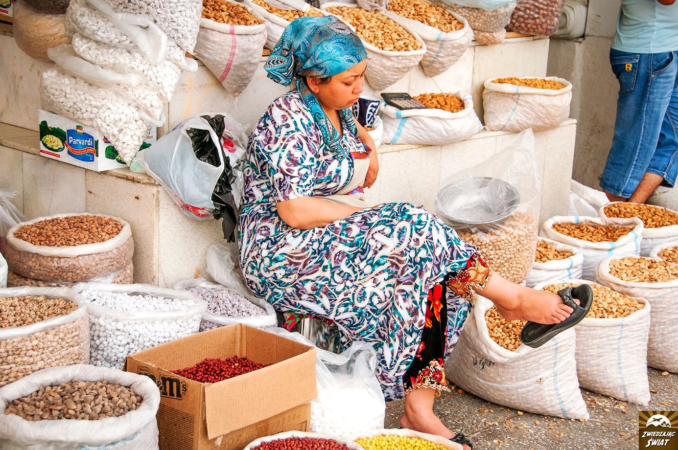Nie samym zwiedzaniem zabytków jednak człowiek żyje. Obok meczetu Bibi Chanum odwiedzamy główny plac handlowy Samarkandy – bazar Siabski. Uwielbiamy takie miejsca. Czego tu nie ma. Warzywa, owoce, nabiał, mięso. Nas jednak najbardziej interesują słodkości, przede wszystkim słynna samarkandzka czekolada, nugaty i orzechy. Nie możemy też oderwać oczu od cudnych, okrągłych lepioszek. Tutejsze należą do najsmaczniejszych w całym Uzbekistanie. Śmiało możemy to potwierdzić!