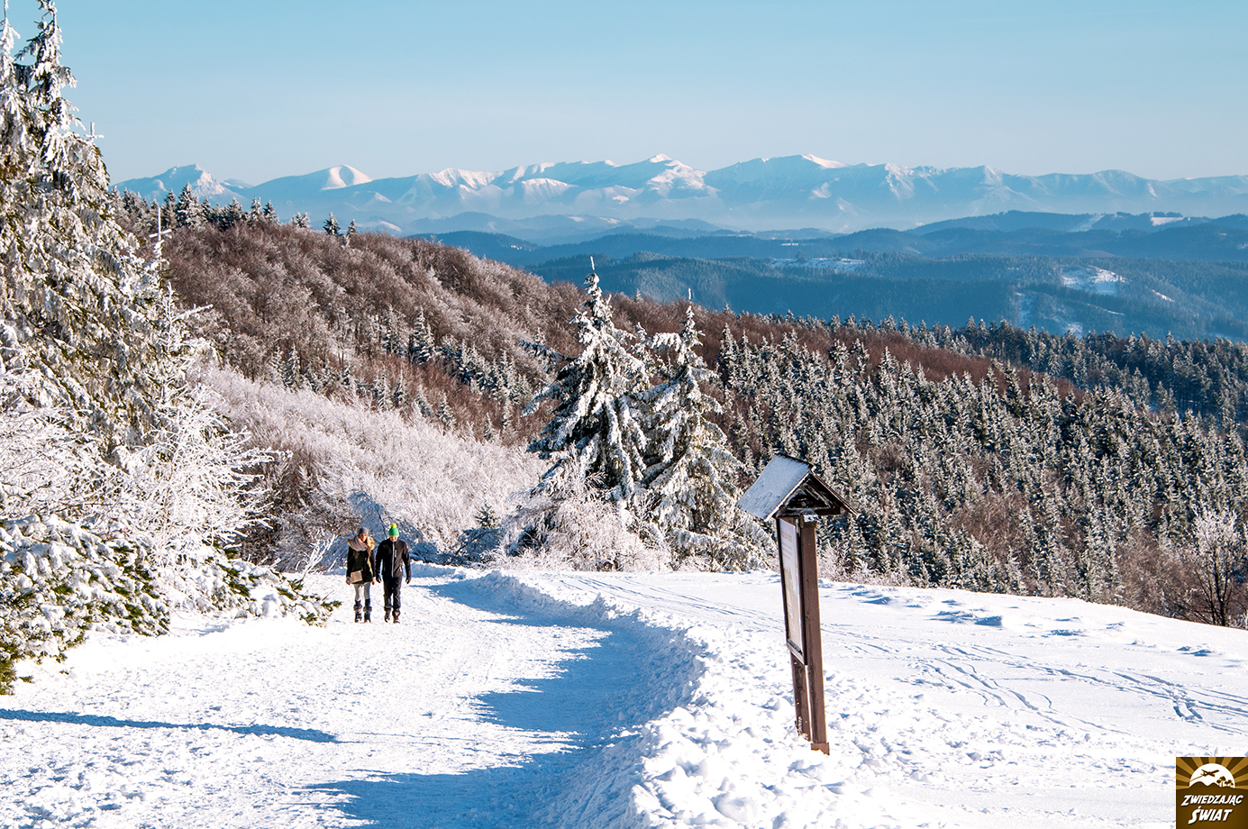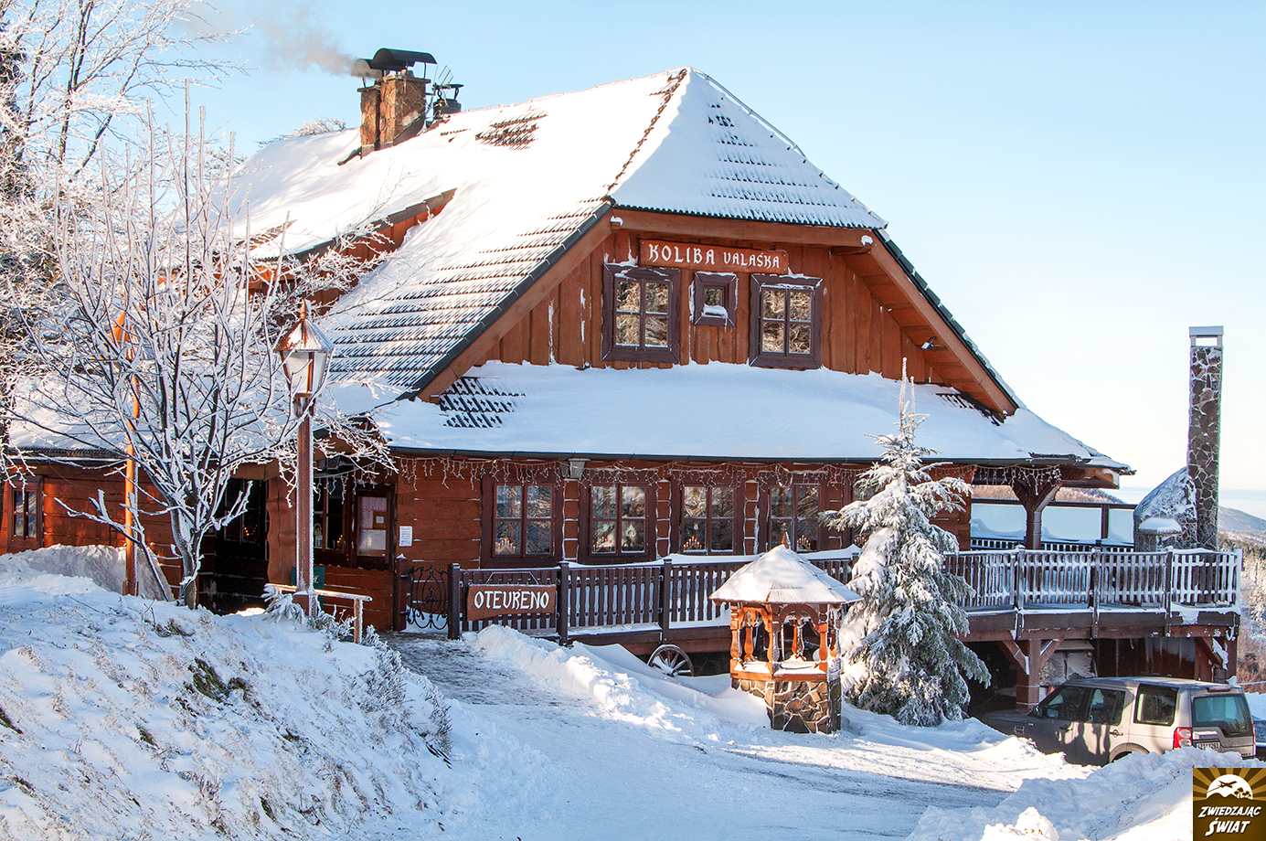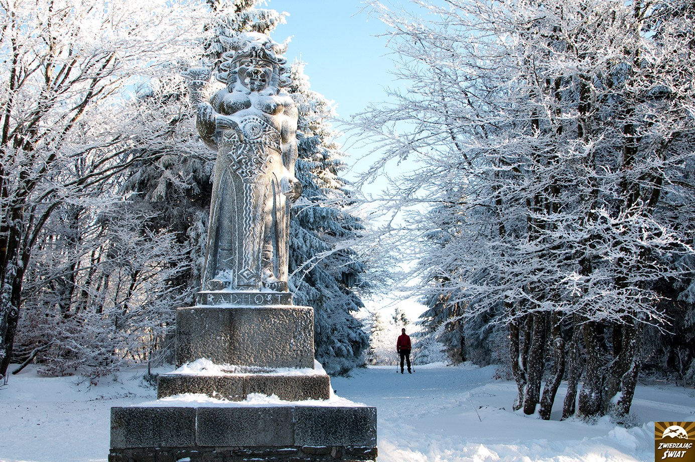 Dla nas, Przełęcz Pustevny – w porannym słońcu, z drzewami przystrojonymi szadzią i grubą warstwą śniegu poniżej (w którym nasze auto zakopało się dwukrotnie, co jak zaobserwowaliśmy później, było w tym miejscu zjawiskiem nagminnym) – staje się wręcz bajkowym startem dla wycieczki na Radhošt, górę poświęconą pogańskiemu bóstwu.