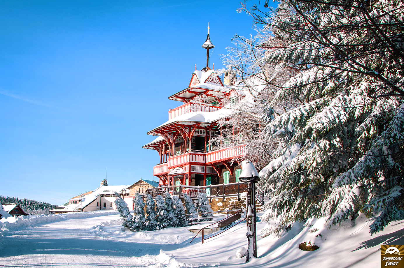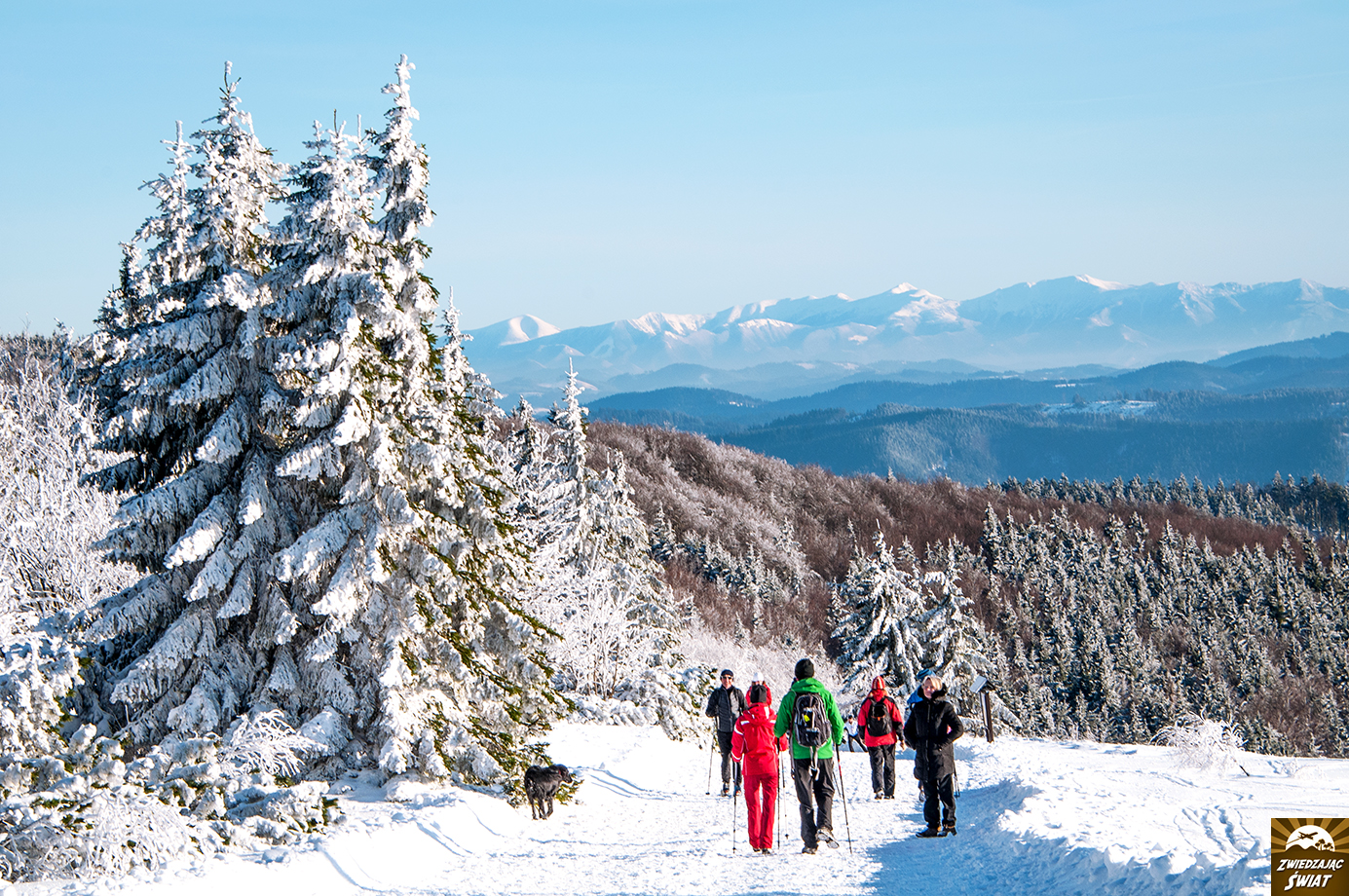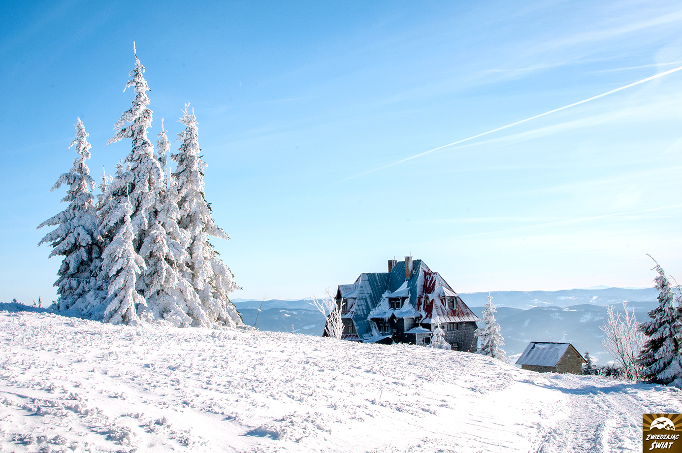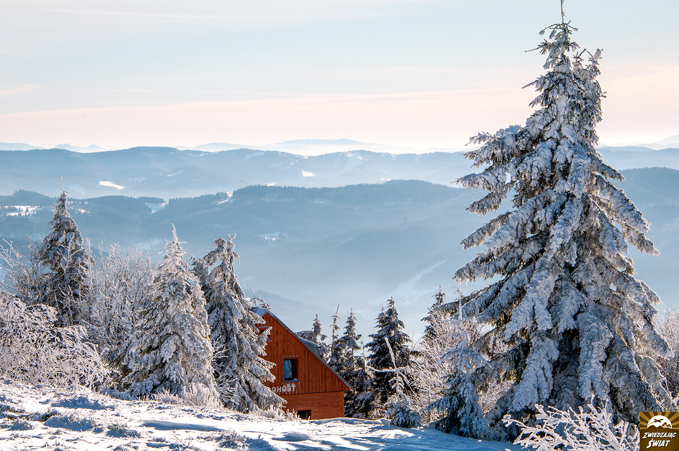 Dla nas, Przełęcz Pustevny – w porannym słońcu, z drzewami przystrojonymi szadzią i grubą warstwą śniegu poniżej (w którym nasze auto zakopało się dwukrotnie, co jak zaobserwowaliśmy później, było w tym miejscu zjawiskiem nagminnym) – staje się wręcz bajkowym startem dla wycieczki na Radhošt, górę poświęconą pogańskiemu bóstwu.