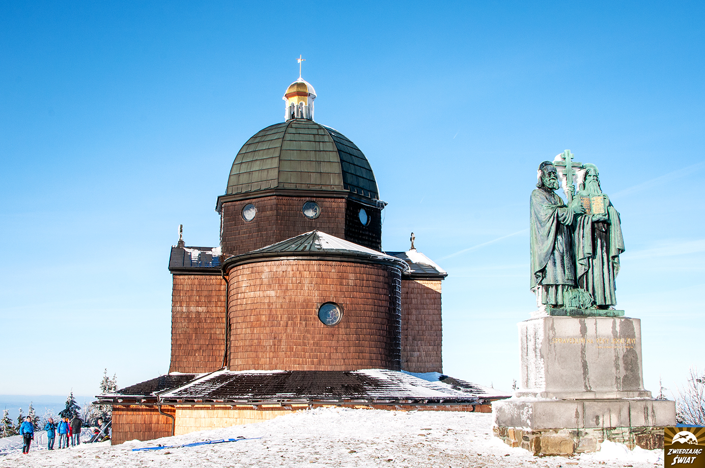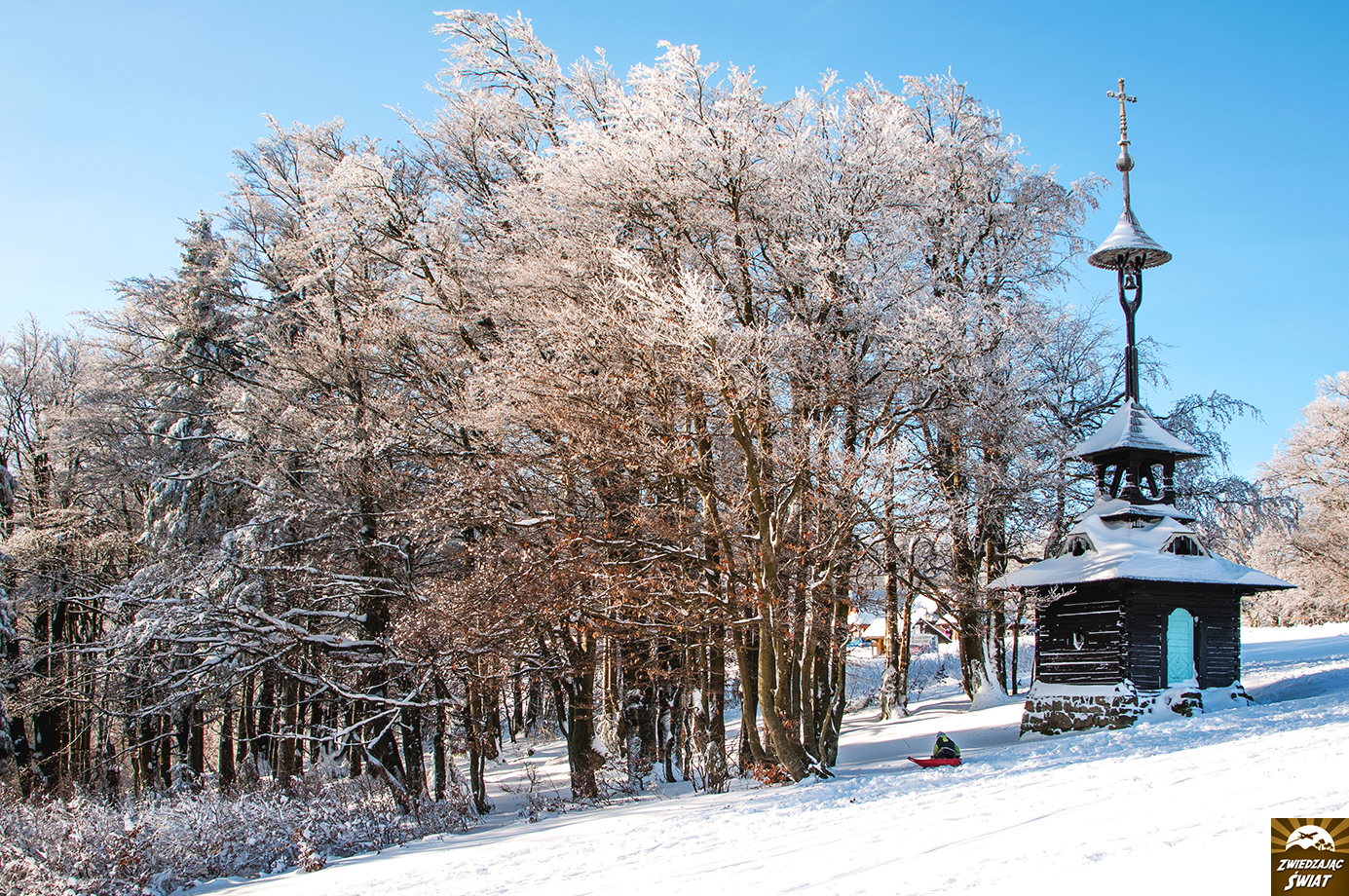 W zachwycie nad zimową scenerią, bez większego wysiłku docieramy na szczyt Radhošta (1129 m n.p.m.). Tutejsza drewniana kaplica św. Cyryla i Metodego, za sprawą śnieżnej powłoki prezentuje się bajkowo.