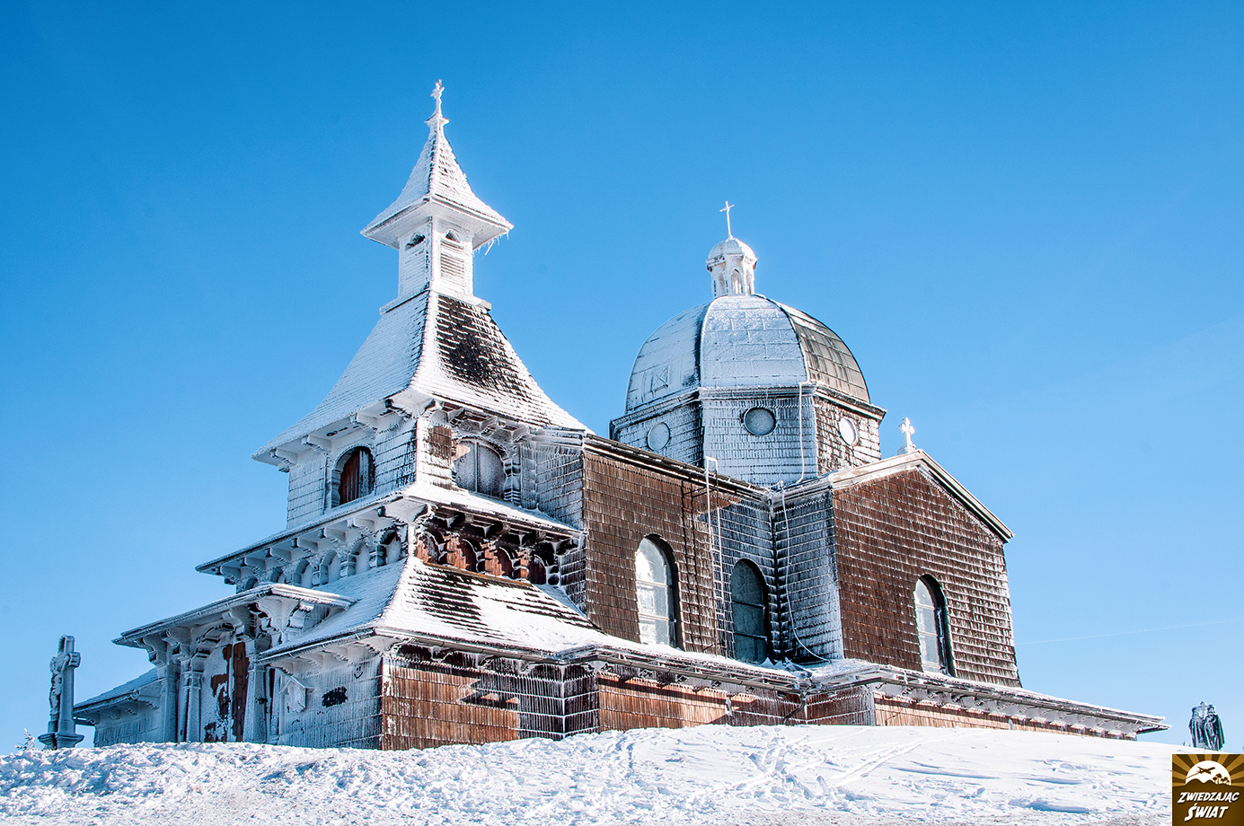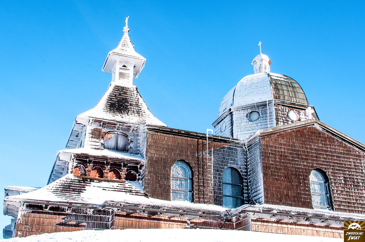Ostre promienie światła roztapiają śnieżną szadź, pokrywającą zewnętrzną ścianę drewnianej absydy. Boki budowli i jej skryty w cieniu front, nadal jednak zdobi biała, skrząca się powłoka. Zjawiskowa, lecz w obliczu słonecznego dnia niezwykle krucha zimowa szata, w jaką przystrojona jest kaplica św. Cyryla i Metodego, wkrótce zniknie.