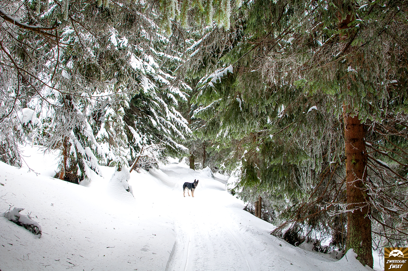 Nie zamierzamy jednak zakłócać panującej w nim sennej atmosfery – otrzymując zgodę na pozostawienie auta przed budynkiem, ruszamy na szlak. Po kilkunastu minutach do naszej dwójki dołącza pies, który towarzyszyć nam będzie aż do schroniska na Hali Lipowskiej, czyli do celu zaplanowanej na ten dzień wędrówki. I jak to zwykle w przypadku czworonogów bywa, szczerze zaimponuje nam łatwością pokonywania, pnącej się w górę ścieżki.