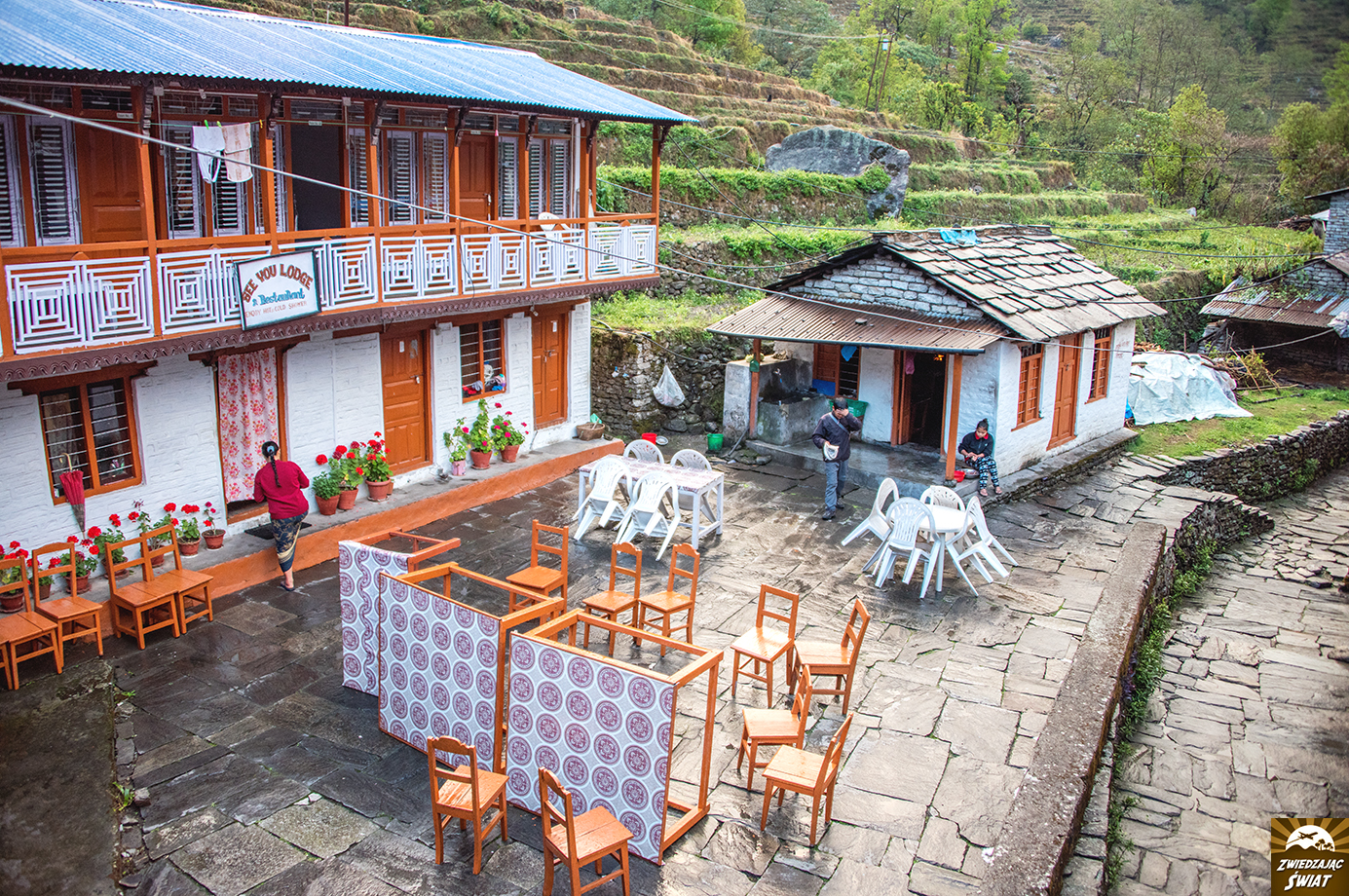 Ulewa, która nastąpiła po powrocie z Poon Hill, zatrzymała nas w Ghorepani dłużej, niż tylko na zaplanowane śniadanie. Stąd, tego dnia nocleg wypadł nam w Banthanti, w Tranquility Guest House, w górnej części wioski (bardzo fajne miejsce, przepyszna pizza).