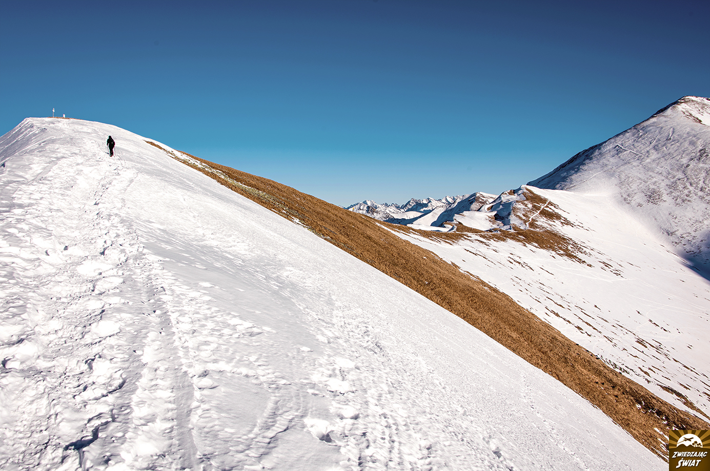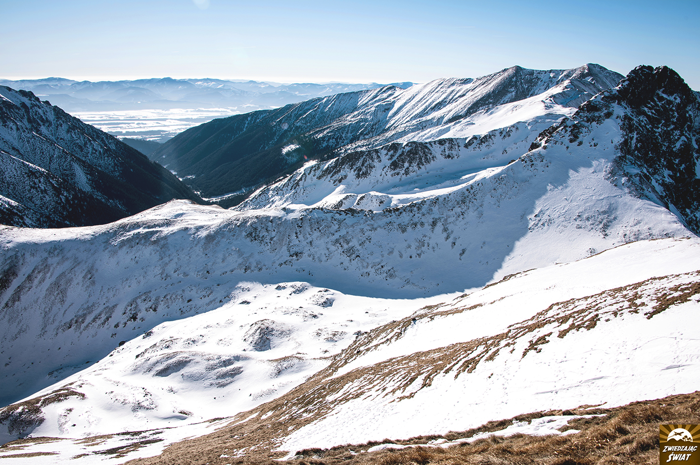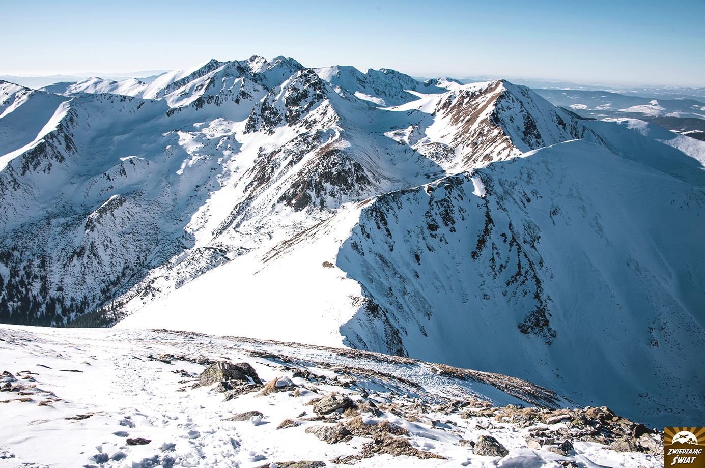Widoki ze szczytu są wspaniałe. Szczególnie groźnie i pięknie prezentują się słowackie Rohacze. Kiedyś już podziwialiśmy je z tego miejsca, tyle że w jesiennym wydaniu. Ciężko ocenić, która z wersji – jesienna czy zimowa – jest bardziej zachwycająca.