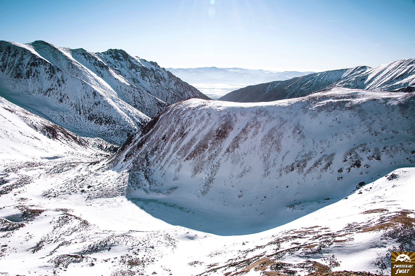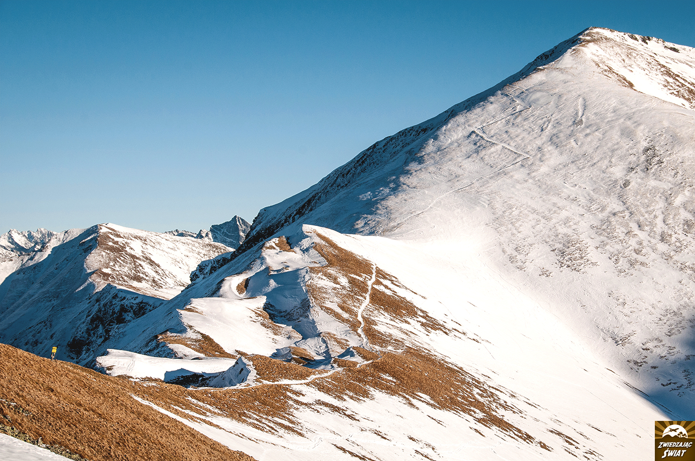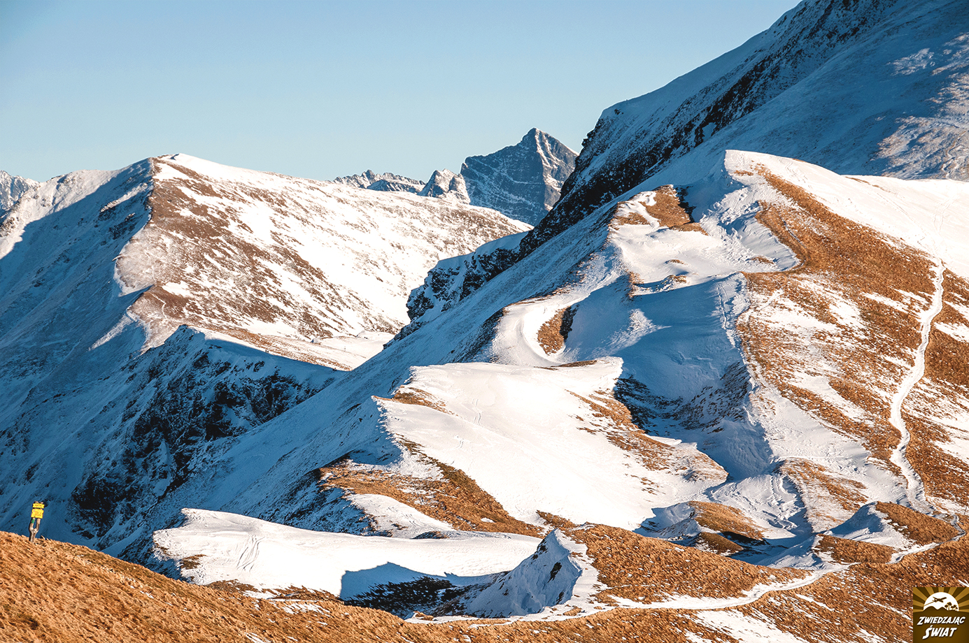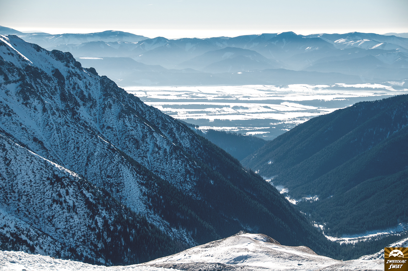 Widoki ze szczytu są wspaniałe. Szczególnie groźnie i pięknie prezentują się słowackie Rohacze. Kiedyś już podziwialiśmy je z tego miejsca, tyle że w jesiennym wydaniu. Ciężko ocenić, która z wersji – jesienna czy zimowa – jest bardziej zachwycająca.