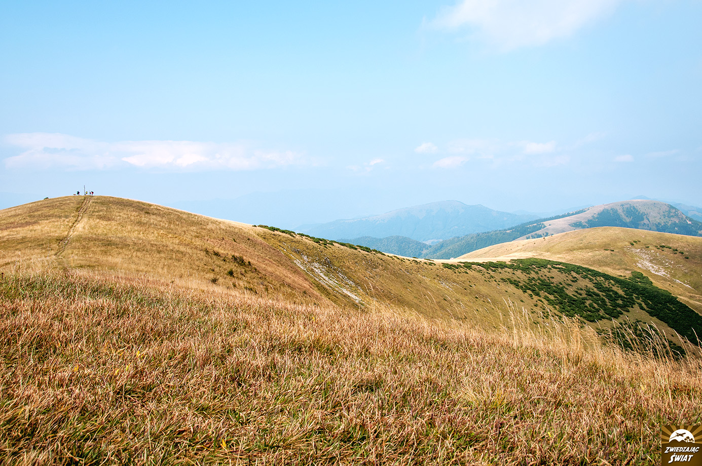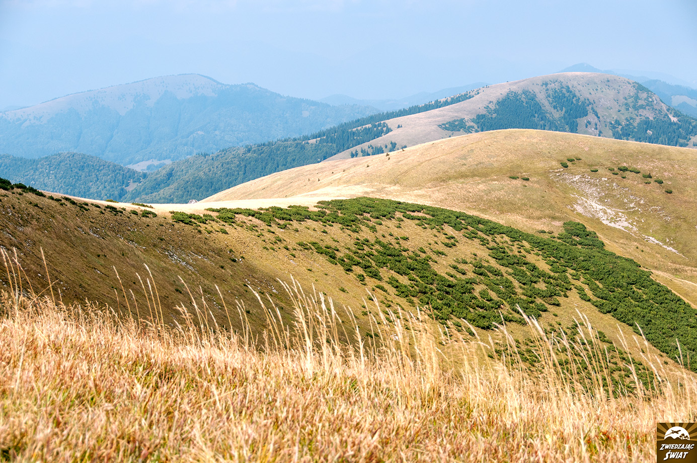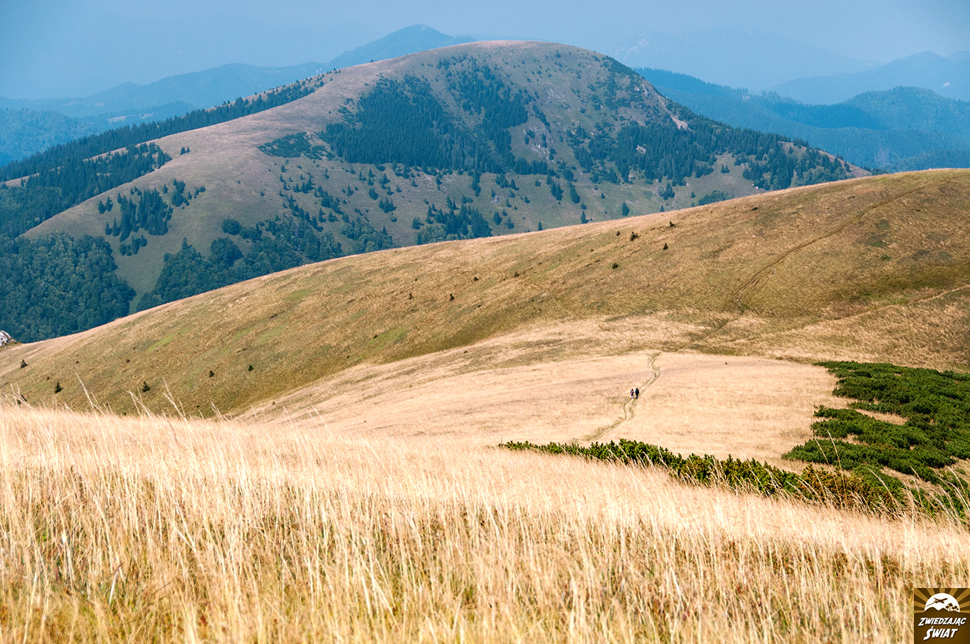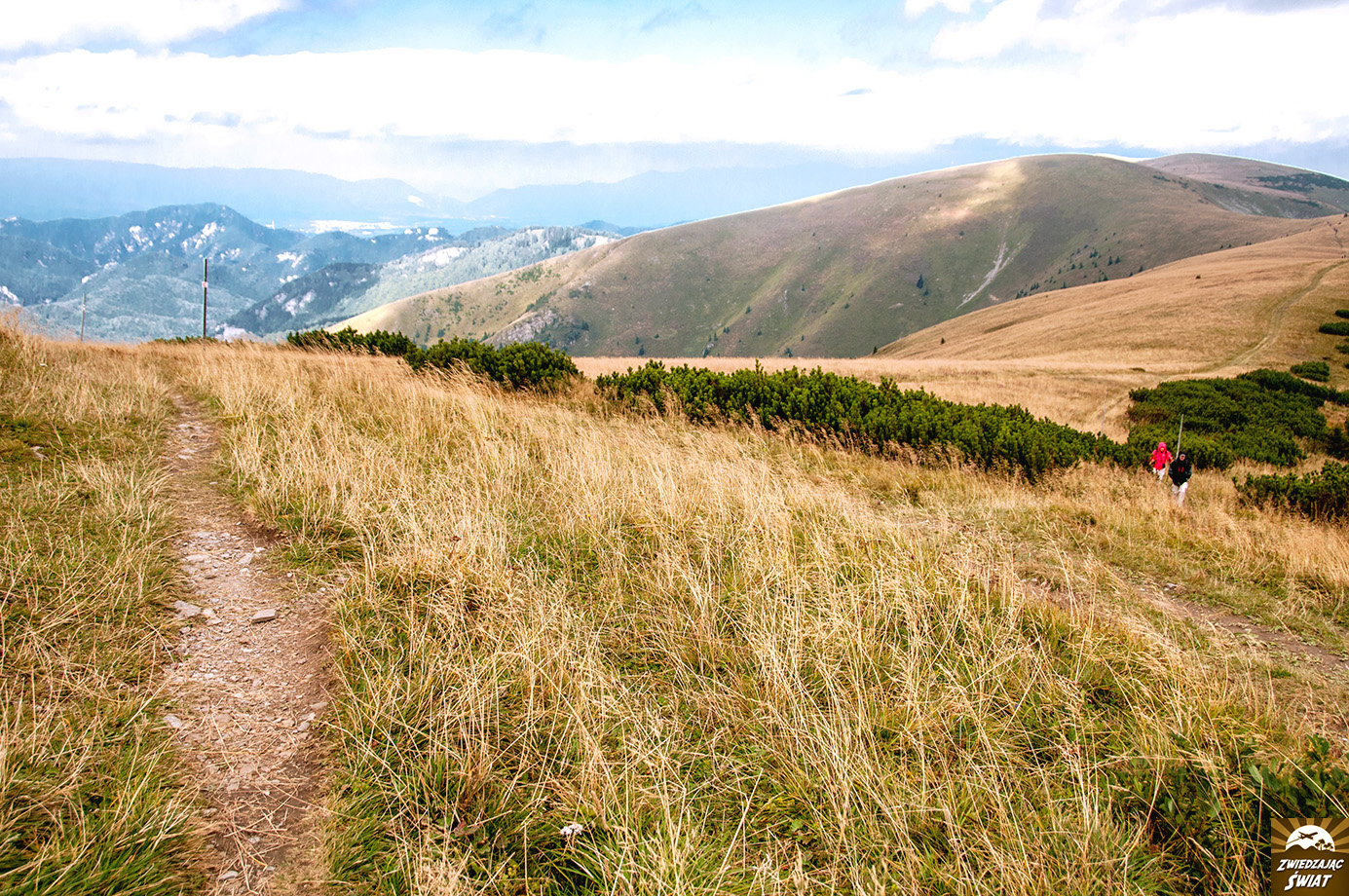 No właśnie, wraz z wejściem na szczyt Kriżnej rozpoczyna się najprzyjemniejsza i najbardziej widokowa część szlaku. Nadal wędrując za czerwonymi znakami, przez ponad 3 godziny nie opuszczamy głównego grzbietu Wielkiej Fatry, podziwiając rozległe górskie panoramy oraz szumiące złote trawy tutejszych hal.