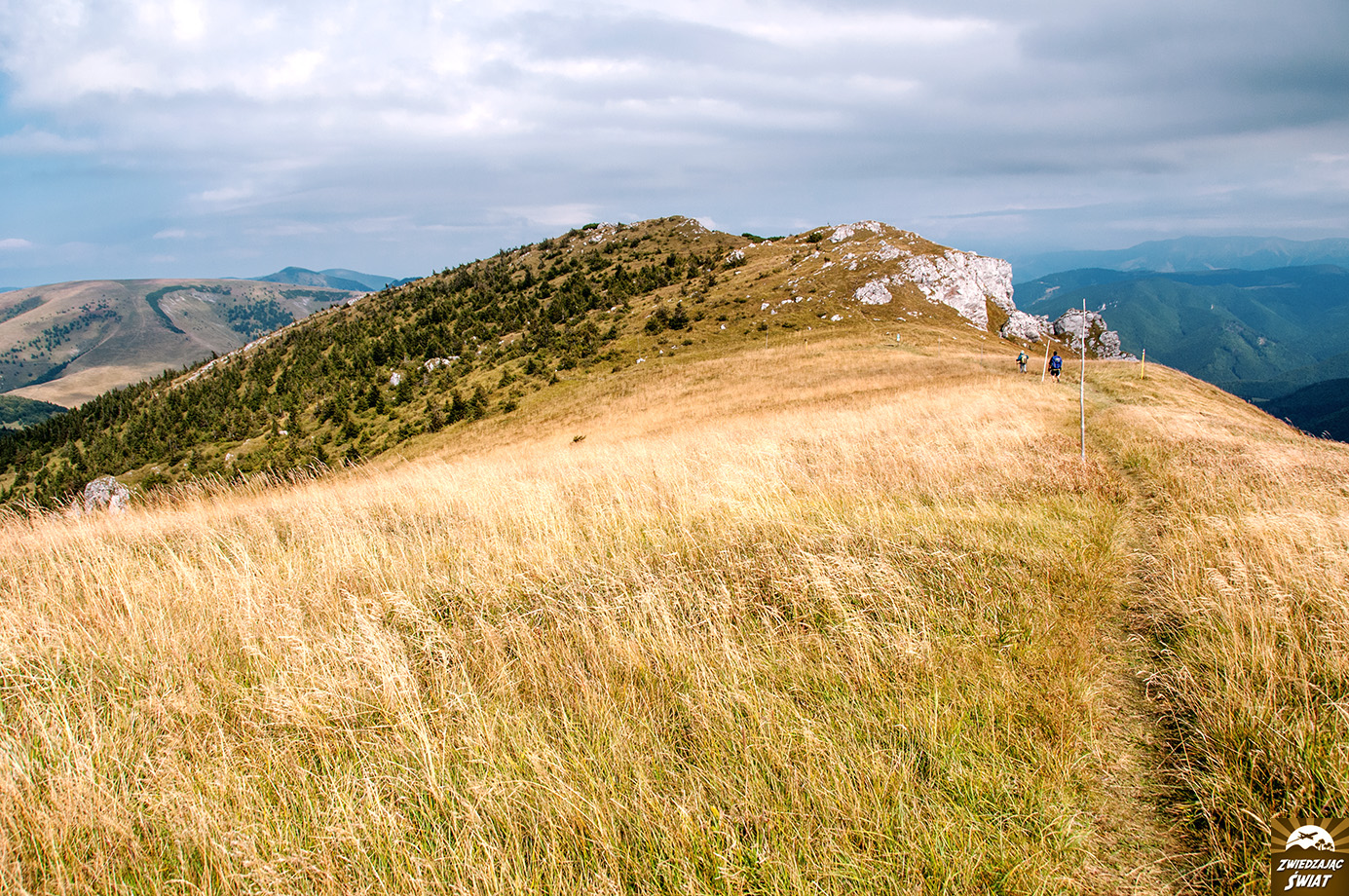 I faktycznie, tutejszy krajobraz to niemal wyłącznie łagodne kształty fatrzańskich wzniesień. Jedyny kontrast dla tej łagodności stanowią rozsiane to tu, to tam wapienne skałki oraz silny wiatr, którego porywy targają ubraniami wędrujących szlakiem turystów i złocistymi grzywami traw.