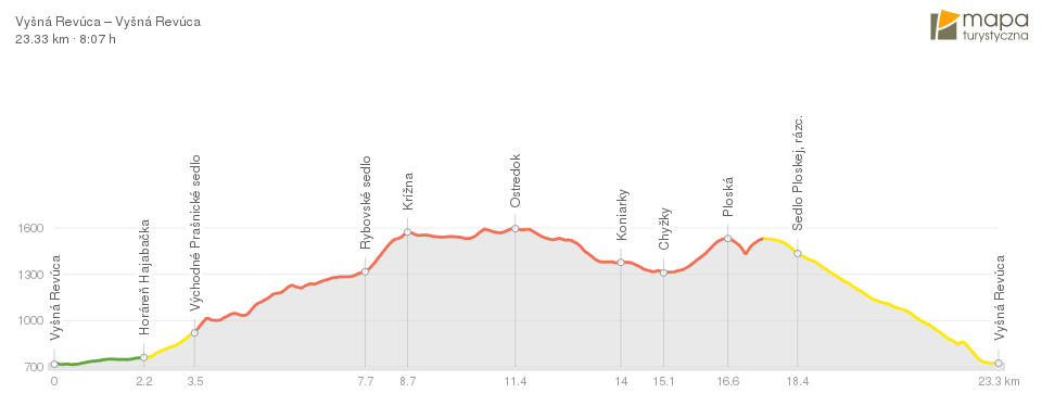 23-kilometrowa trasa obejmująca wszystkie 3 szczyty to 8 godzin sprawnej wędrówki. Bazę wypadową stanowi miejscowość Vyšná Revúca. Stąd, najpierw za zielonymi, a następnie żółtymi znakami póki co bez większego wysiłku docieramy do szlaku czerwonego. Teraz czeka nas dość męczący i długi etap trasy, czyli podejście przez las. W końcu wychodzimy na otwartą przestrzeń, osiągając odcinek grzbietu niedaleko Kriżnej, noszący nazwę Rybovské sedlo. Na szczycie Kriżnej powinniśmy się znaleźć po około 3,5 godzinie od rozpoczęcia wędrówki.