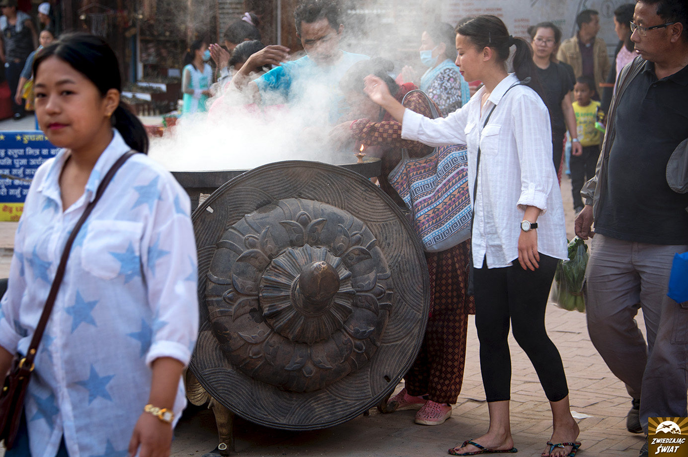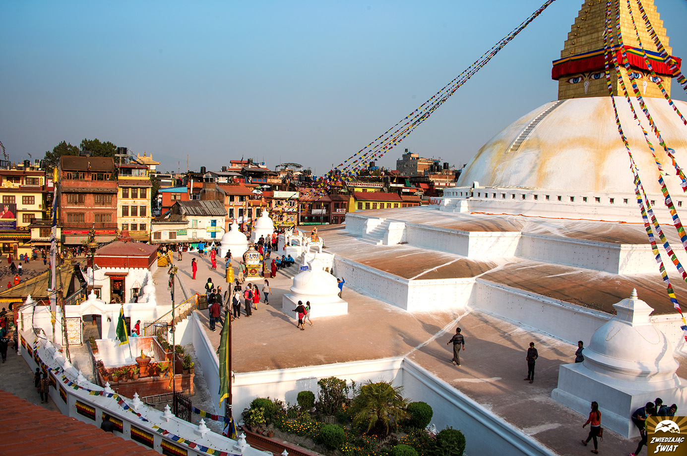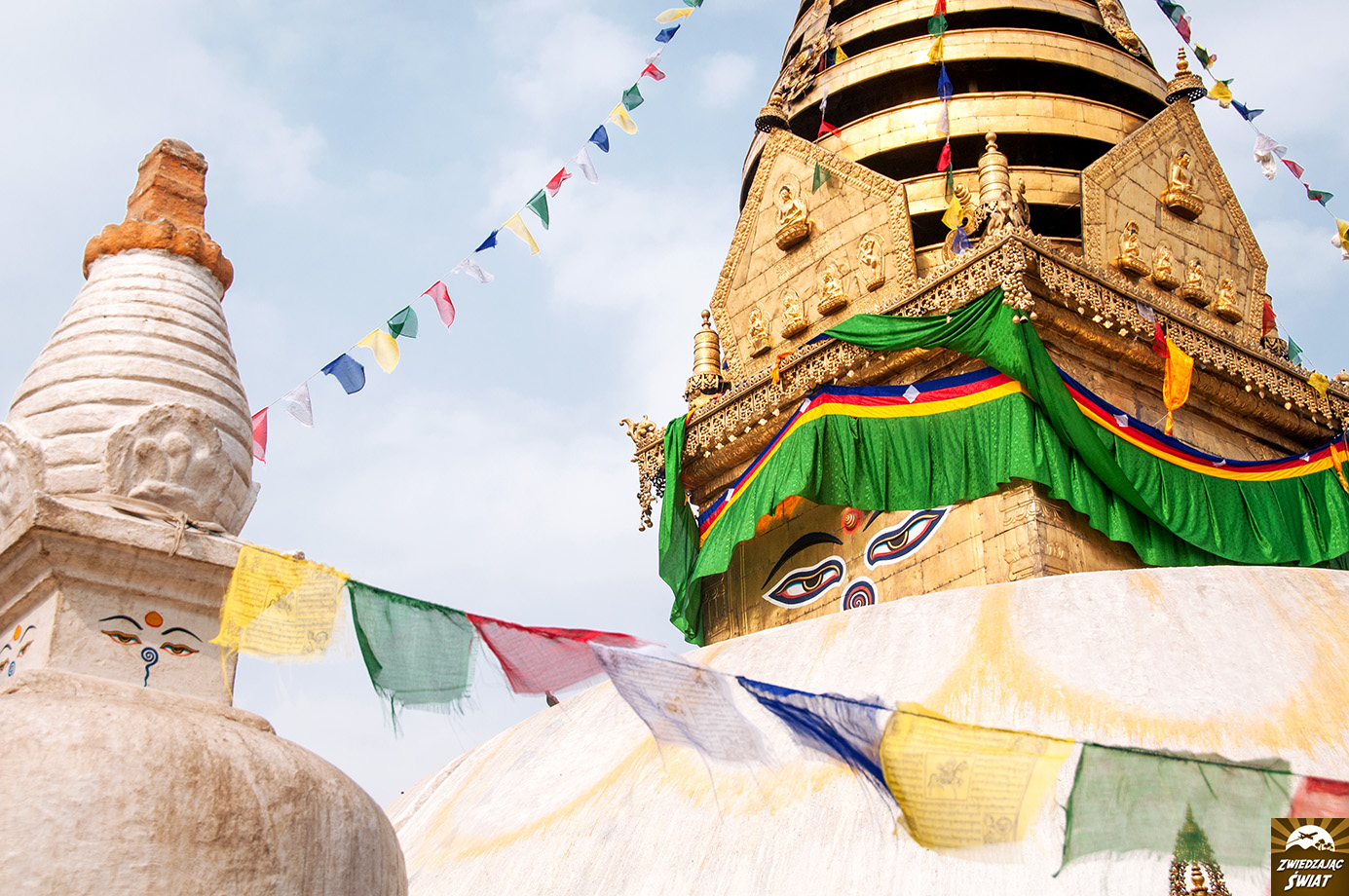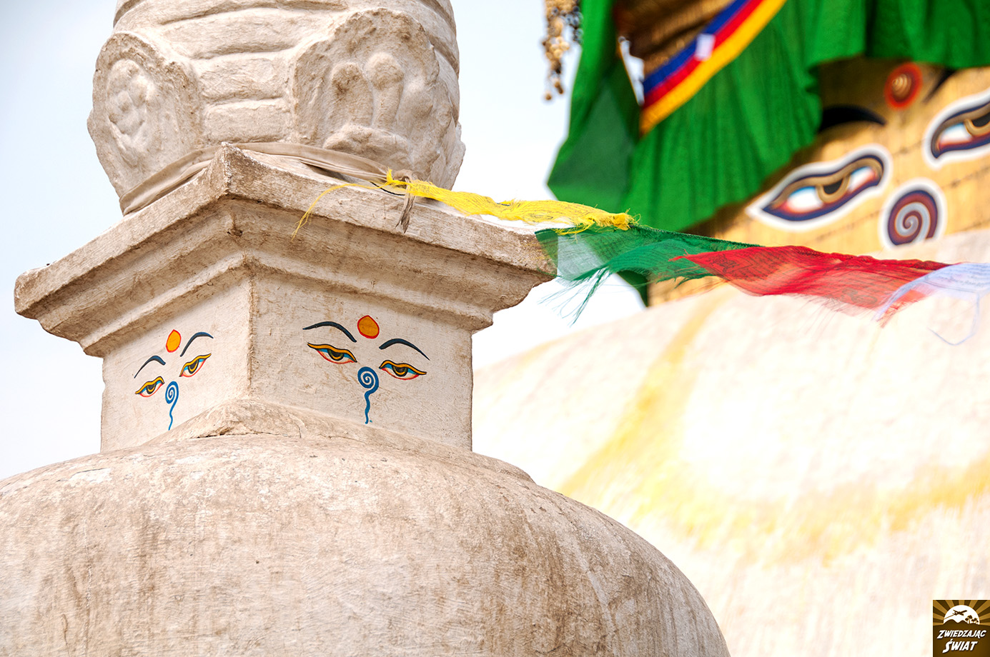 W Swayambunath ma się wrażenie, że ogarnięcie wzrokiem wszystkiego, co dzieje się wokół, wymaga właśnie takich nadprzyrodzonych zdolności. Tu wychudzony, barwnie ubrany i umalowany sadhu udziela błogosławieństwa, tam pielgrzymi modlą się i robią selfie na tle stupy, wirują modlitewne młynki, małpy polują na łakocie, a zdolny rzemieślnik wykuwa w kamieniu podobiznę Buddy.