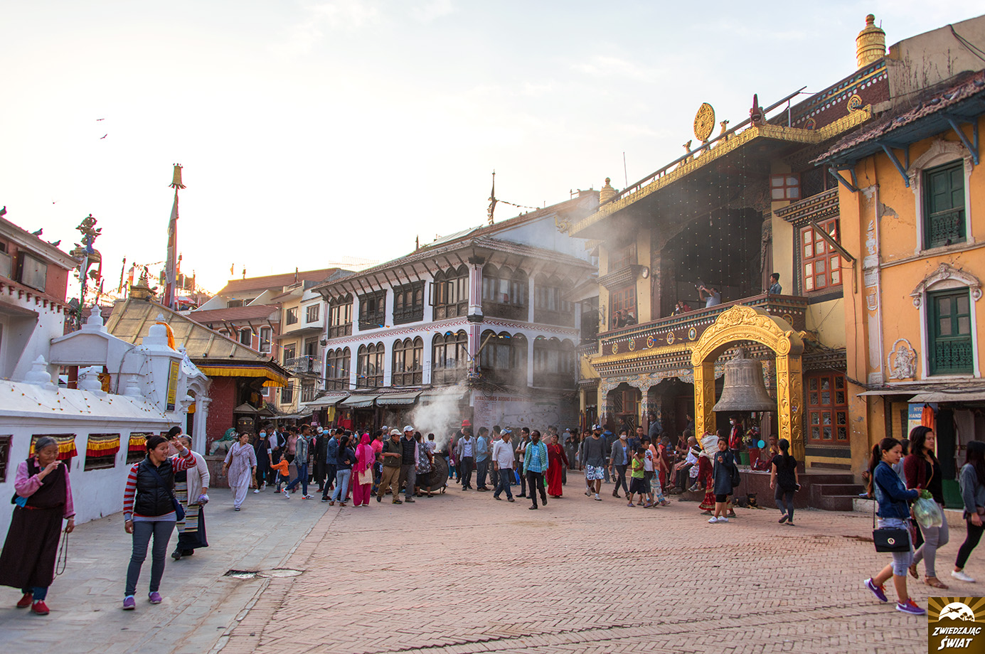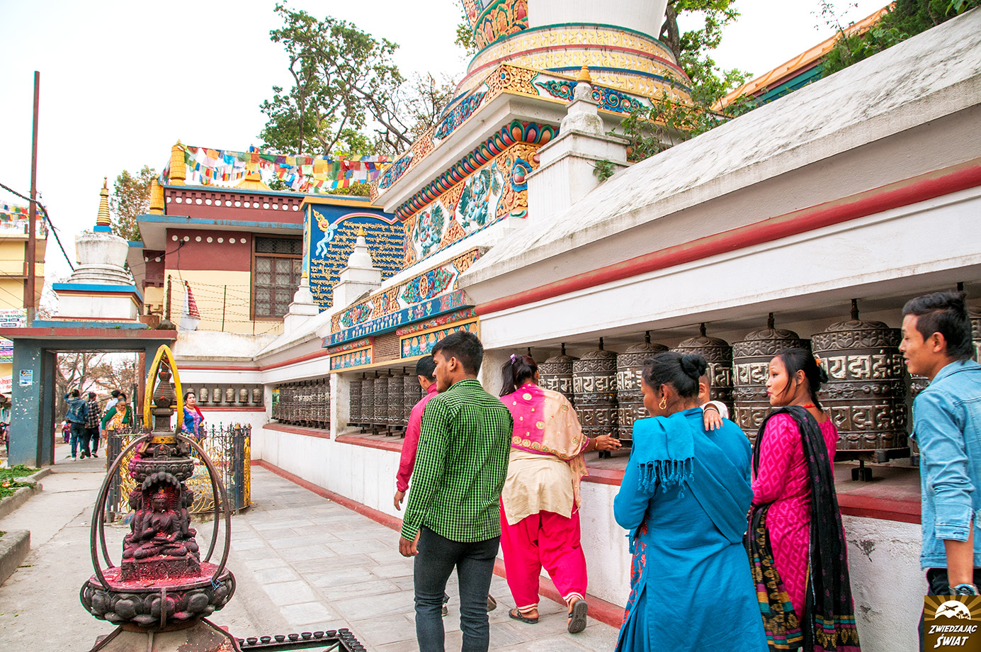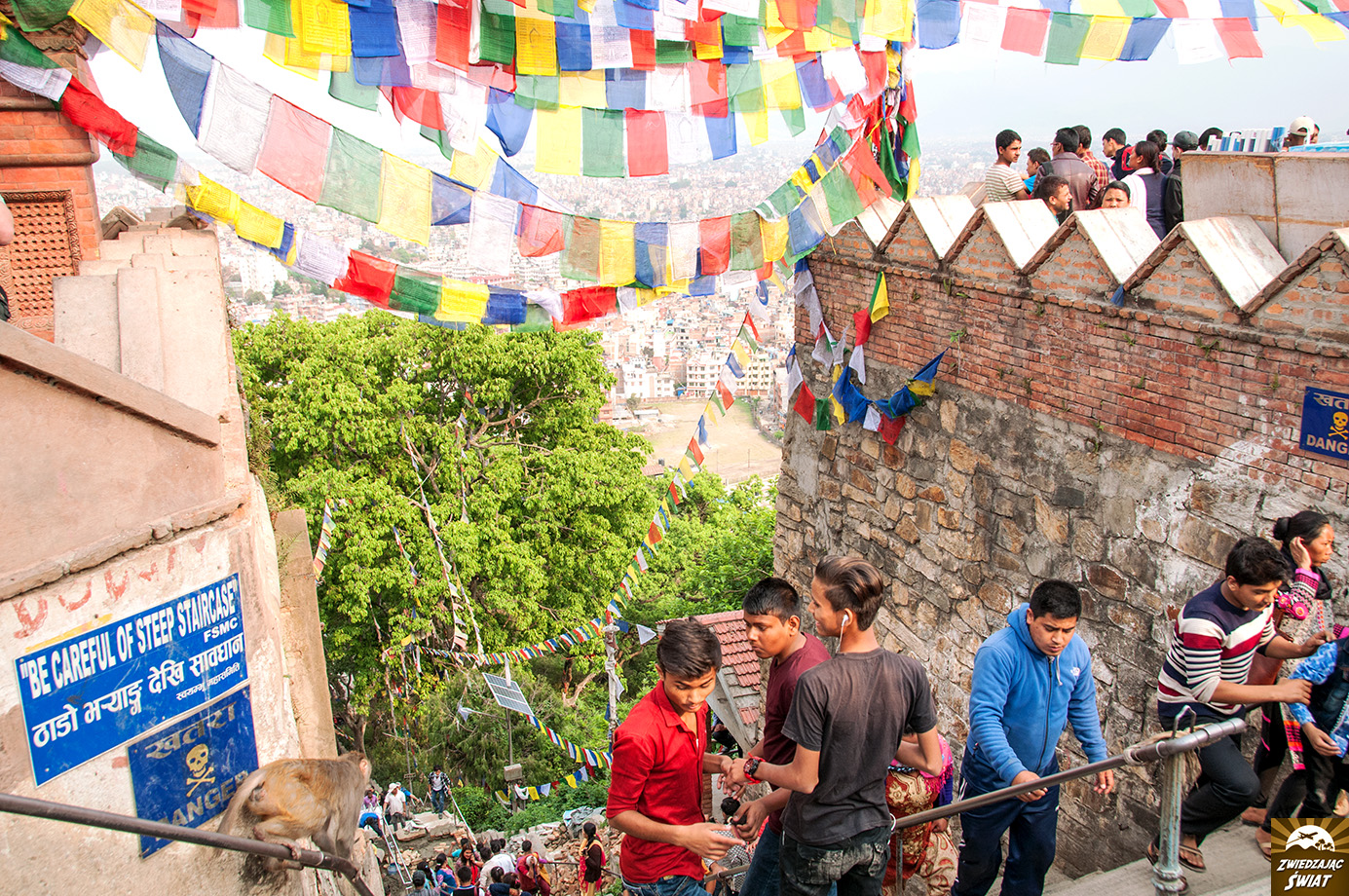 Podziwianie wielkiej stupy, stanowiącej serce kompleksu poprzedza wspinaczka po stromych schodach, prowadzących na świątynne wzgórze. Ocienione drzewami stopnie pokonuje się w wartkim potoku pielgrzymów, wśród których są zarówno wyznawcy hinduizmu, jak i buddyści. Wokół harcują stada małp, kwitnie handel pamiątkami oraz dewocjonaliami. Ze wzgórza roztacza się widok na spowitą smogiem i kurzem zabudowę Katmandu, na tle łopoczących modlitewnych flag.