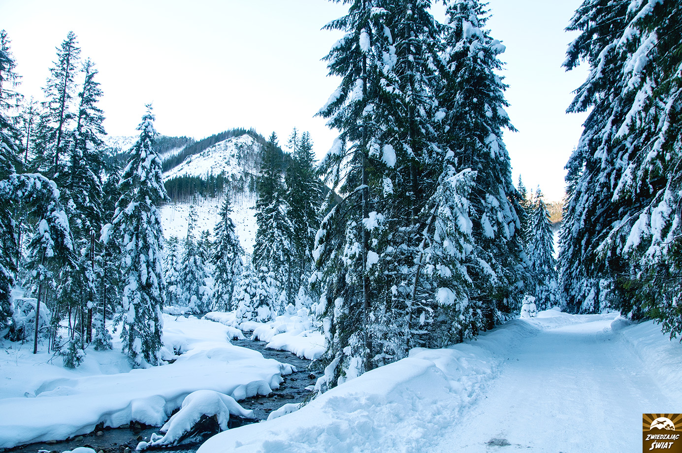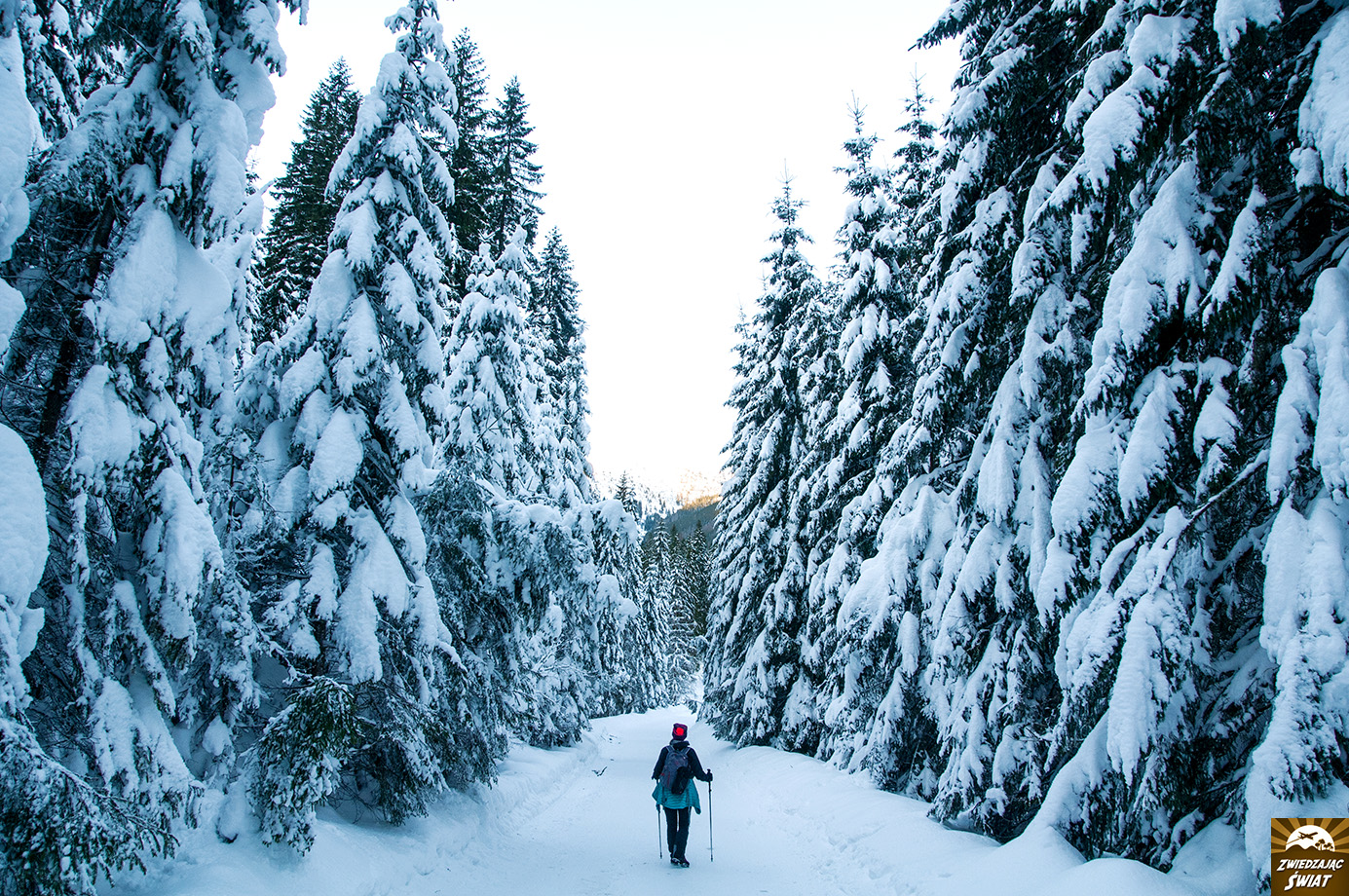 Polana Chochołowska, na której znajduje się największe w polskich Tatrach schronisko jest już niedaleko. Trasa na tym odcinku robi się szczególnie malownicza. Potężne świerki pokryte gęstym śnieżnym puchem wyglądają bajecznie.