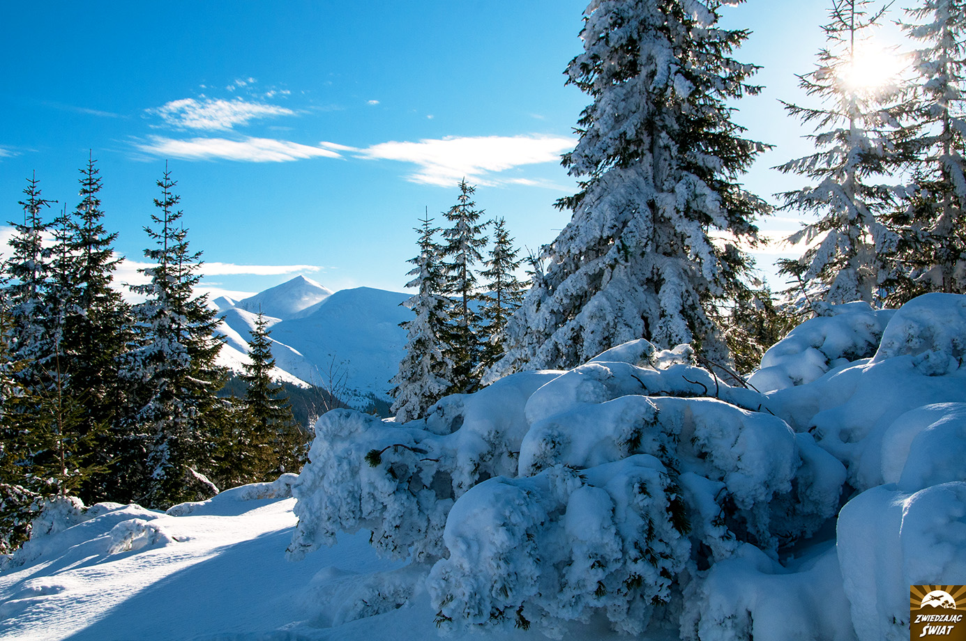 Nasz cel na dzisiaj jest jednak inny – dalej drepczemy więc za żółtymi oznaczeniami, i w końcu opuszczamy zalesioną, dobrze przetartą drogę. Pojawiają się pierwsze panoramy. Pogoda rozpieszcza, widok ośnieżonych drzew na tle gór daje kopa do dalszej wędrówki.