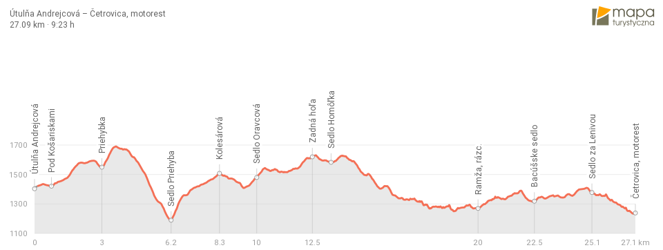 Szlak: Utulna Andrejcova ➡️ Pod Košariskami ➡️ Priehybka ➡️ Sedlo Priehyba ➡️ Kolesárová ➡️ Sedlo Oravcová ➡️ Zadna hol’a ➡️ Sedlo Homôl’ka ➡️ Ramža ➡️ Bacúšske Sedlo ➡️ Sedlo za Lenivou ➡️ Sedlo Čertovica