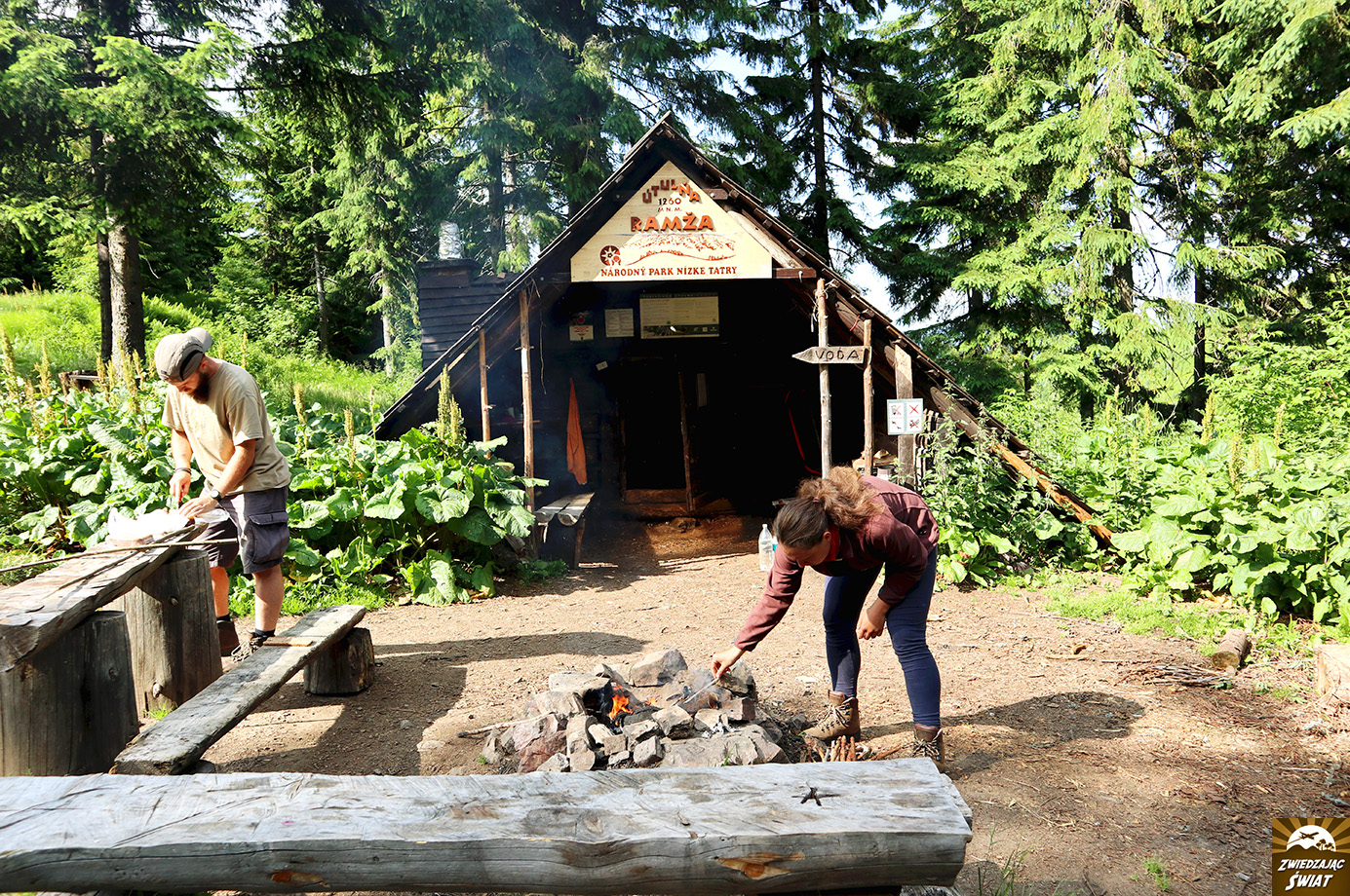 Z parnego, słonecznego Telgartu ruszyłyśmy w stronę najwyższego punktu przewidzianej na ten dzień trasy, czyli na Kraľovą Holę (zmieniając na początku szlaku długie spodnie na krótkie getry zapomniałam posmarować łydki kremem z filtrem, co miało dla mnie opłakane skutki w następnych dniach), gdzie odczuwalna temperatura była już zdecydowanie niższa i wiał silny wiatr. Dalej granią z rozległymi panoramami powędrowałyśmy w kierunku utulni Andrejcová – uroczej drewnianej chatki, gdzie z ulgą przyjęłyśmy wiadomość, że są jeszcze miejsca, i pierwszej nocy na szlaku mamy zapewniony dach nad głową.