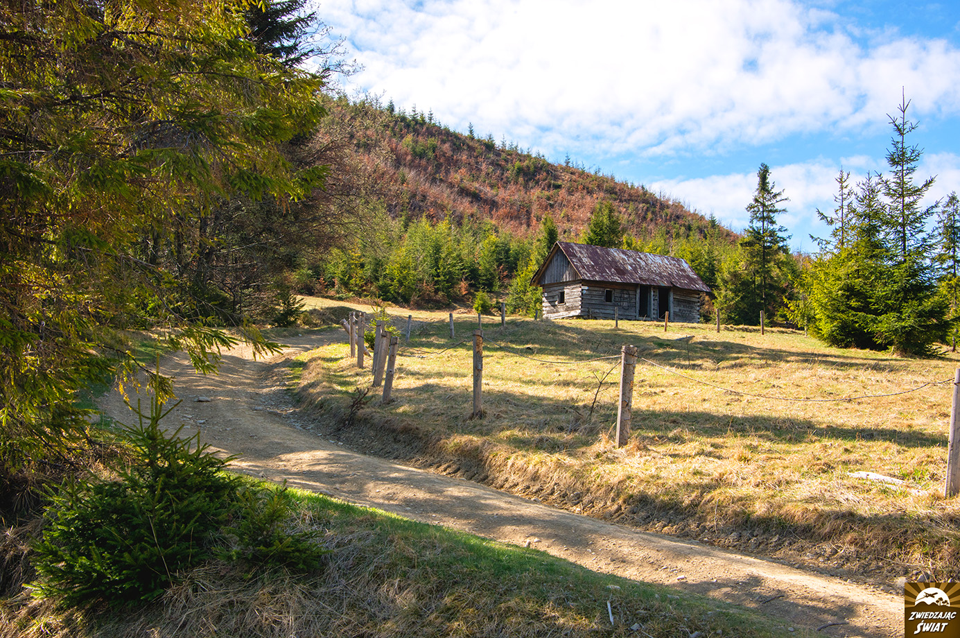 Stąd znaki czarnego szlaku wskazują nam kierunek wędrówki. Jego celem jest pierwsza ze wspomnianych hal – Hala Boracza. Trwający ponad godzinę odcinek biegnie najpierw asfaltem, a następnie typową leśną drogą, by w końcu wyprowadzić nas na otwartą przestrzeń z piękną falującą panoramą, tuż przy rozwidleniu szlaków.