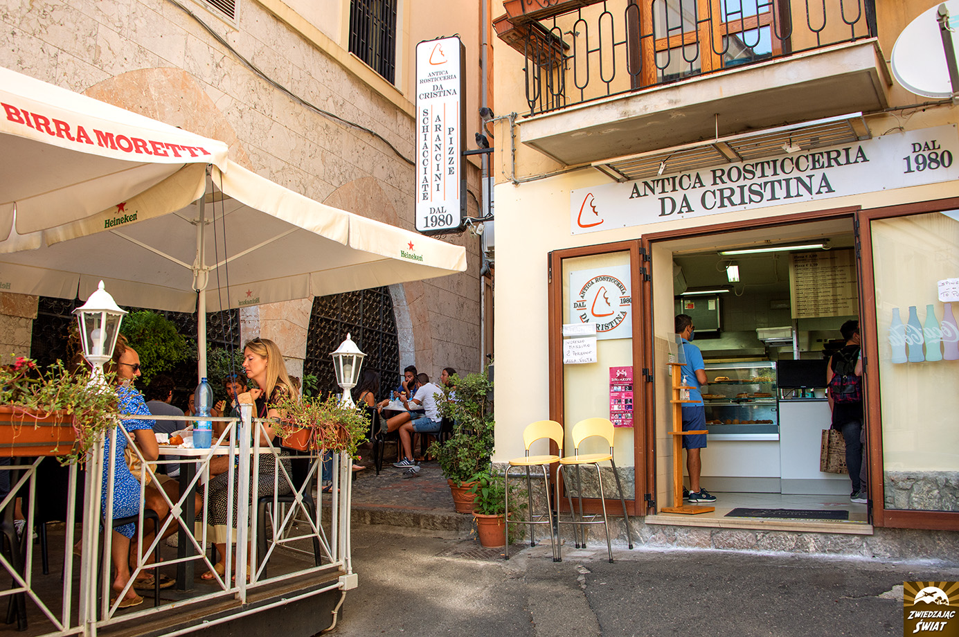 Zupełnie przypadkowo – obserwując ludzi w okolicy katedry św. Mikołaja znikających w pobliskiej uliczce i powracających stamtąd z różnymi przysmakami – trafiliśmy do baru z cibo di strada, czyli ulicznym jedzeniem. Miejsce nazywa się Antica Rosticceria Del Corso, na zewnątrz jest kilka stolików, a w środku mnóstwo pyszności, nie tylko kawałki pizzy czy arancini, ale dużo, dużo więcej.