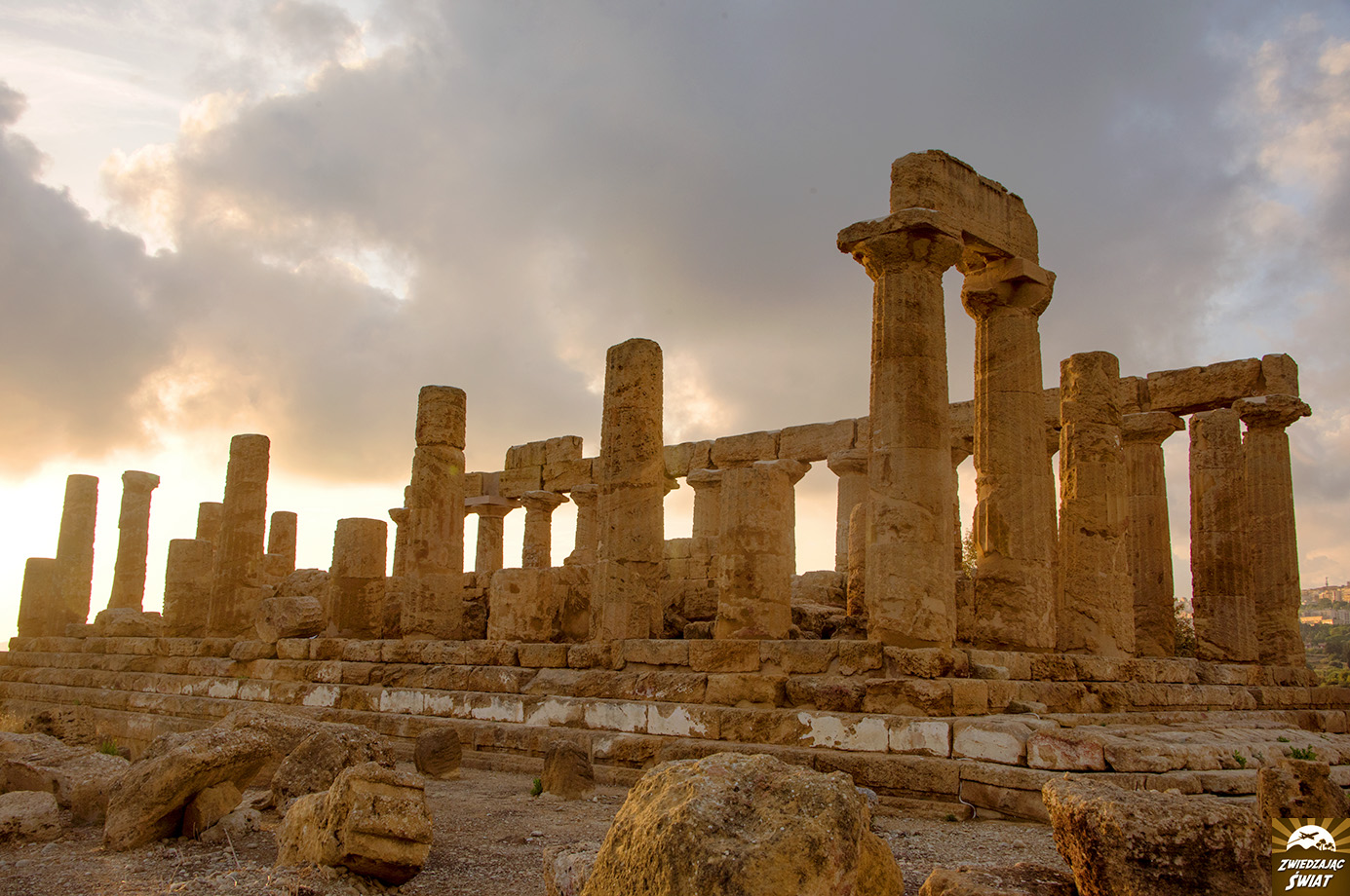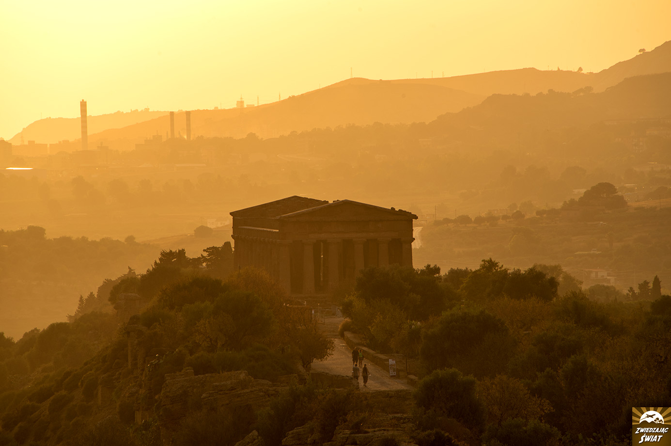 Do Doliny Świątyń dotarliśmy późnym popołudniem, kiedy leniwe słońce cudownie podkreślało złocisty kolor antycznych ruin. I tak spacerując od jednej do drugiej budowli, wróciliśmy na koniec w pobliże tej najlepiej zachowanej. Świątynia Concordii w ostatnich promieniach zachodzącego słońca to był prawdziwie romantyczny widok. Po tym spektaklu Valle dei Templi stopniowo zaczęło skrywać się w półmroku. Jednak główne obiekty nie zniknęły całkowicie w ciemnościach, dzięki oświetlającym je reflektorom.