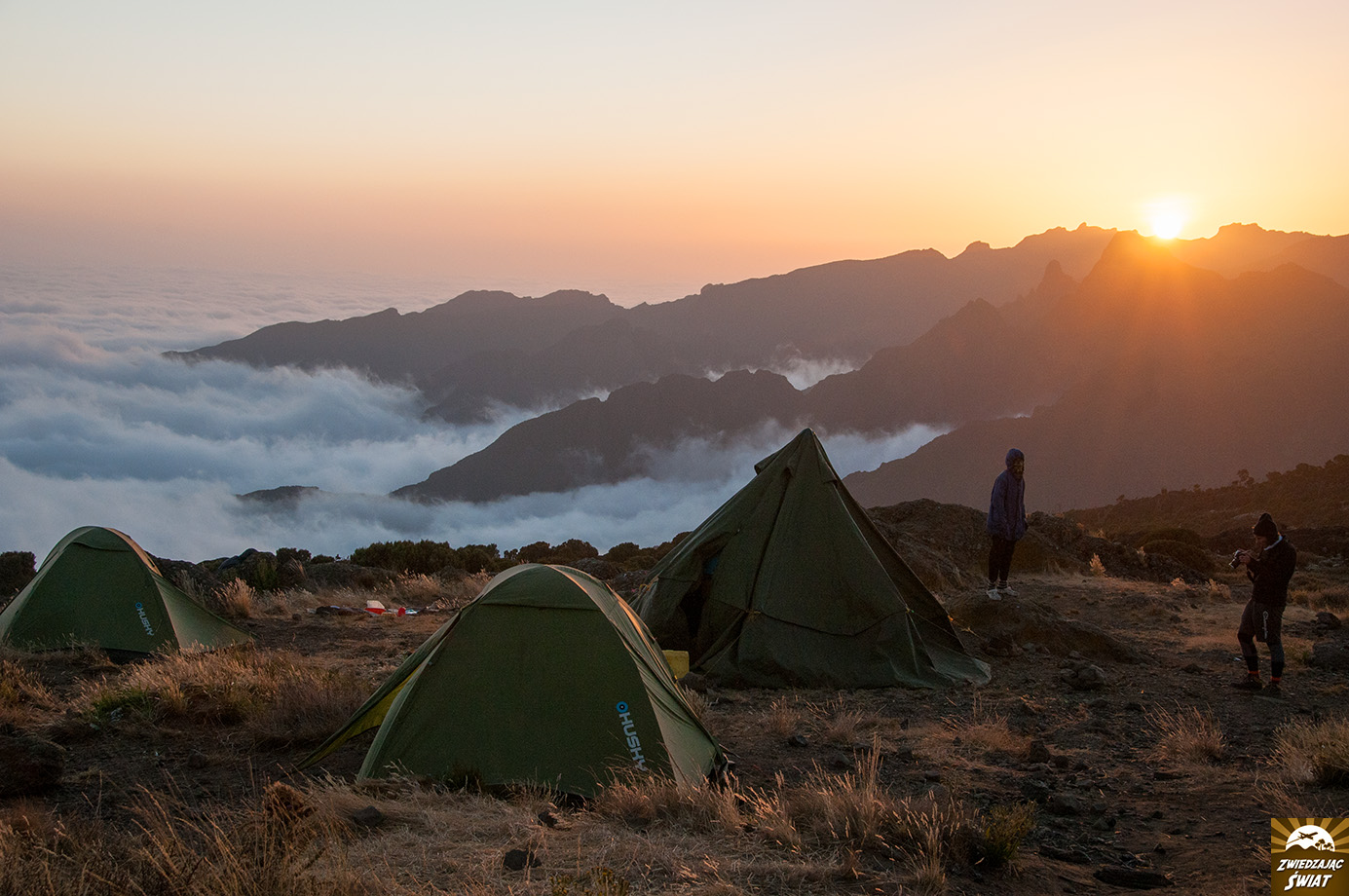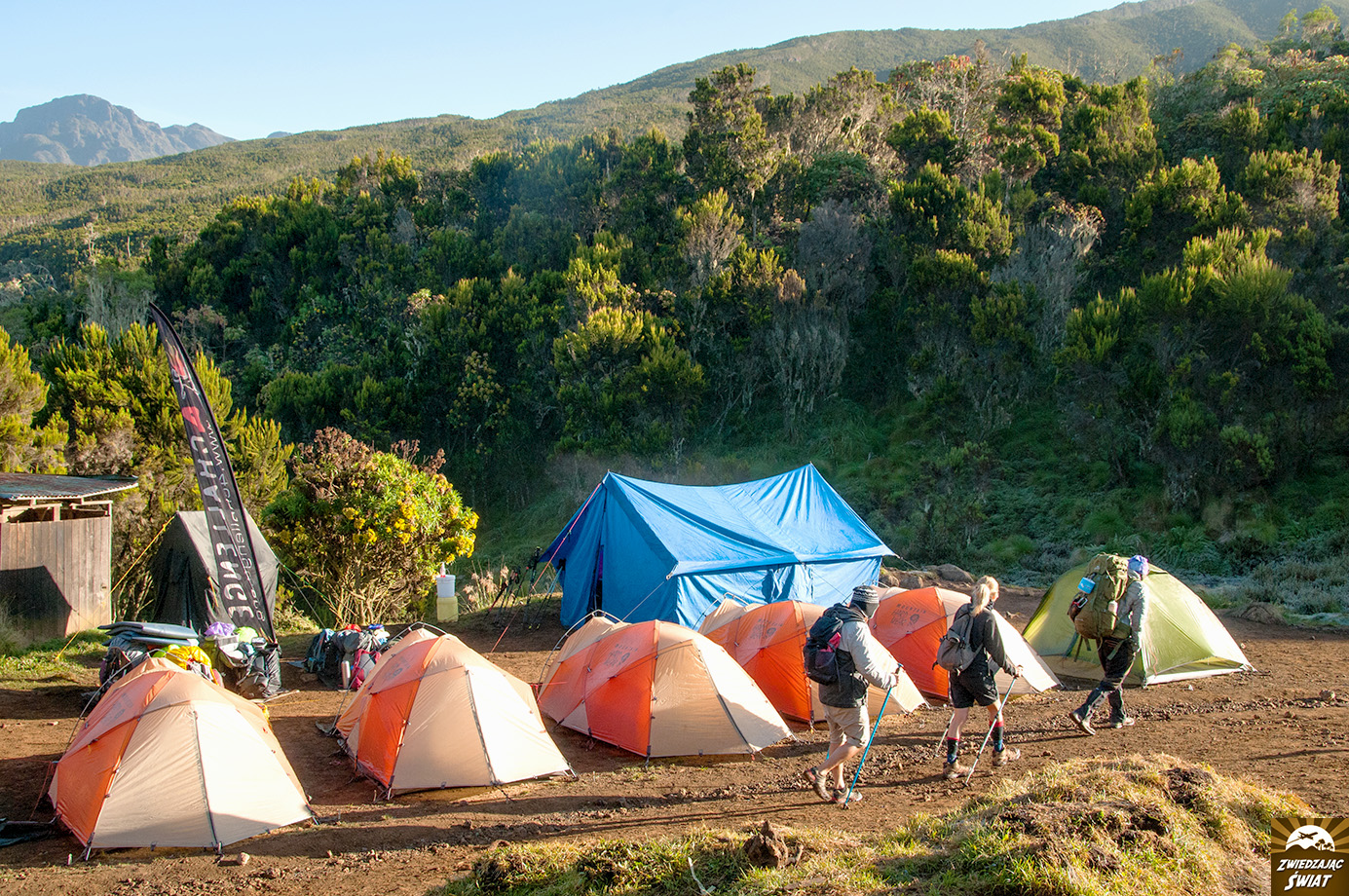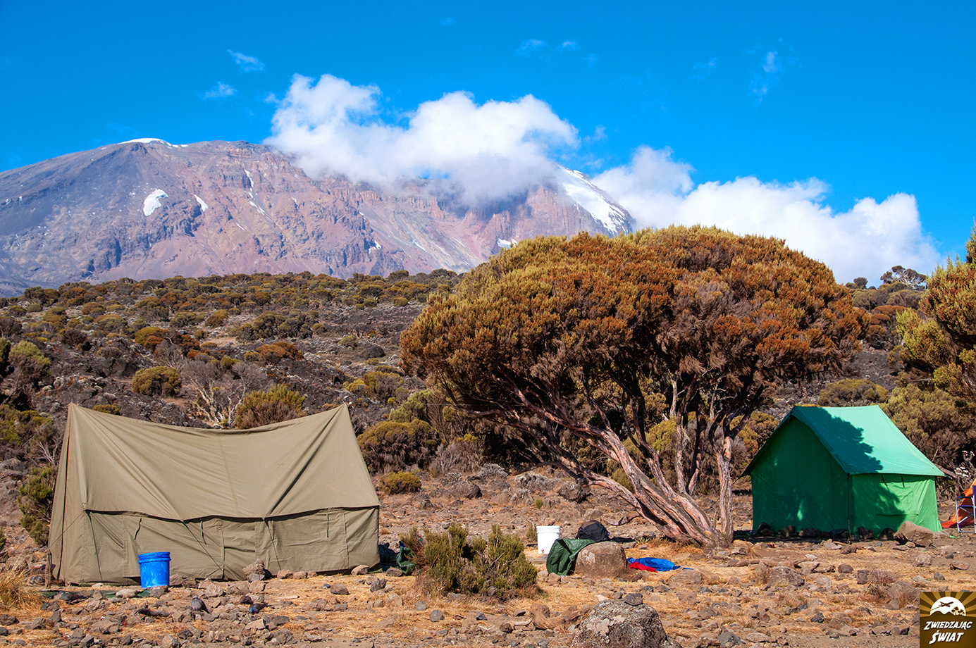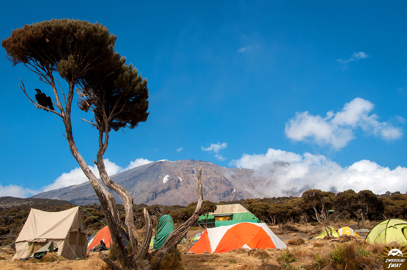 Po wyjściu z mesy okazuje się, że po mglistym, wilgotnym poranku nie ma śladu. Świeci słońce, otworzyły się fantastyczne widoki na krater Kibo, a obóz wygląda tak pięknie, że aż żal go opuszczać. Czas jednak ruszać dalej.