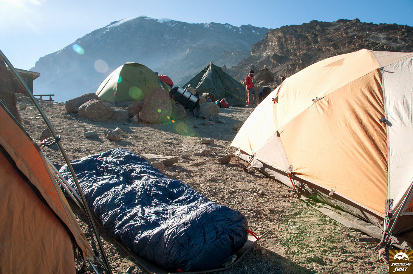 Kilimanjaro Machame Route to 5 nocy spędzonych pod namiotem. Nocy przesyconych wilgocią, gdy obóz rozbijany jest blisko lasu deszczowego, niespokojnych przez szalejący na zewnątrz wiatr, i coraz zimniejszych gdy wyprawa zbliża się do szczytu. Jeżeli bowiem ktoś myśli, że podczas afrykańskiej przygody z najwyższą górą kontynentu nie można zmarznąć, jest w błędzie. W obozie, w którym nocowaliśmy przed atakiem szczytowym, czyli Barafu Camp na wysokości 4673 m n.p.m. temperatury sięgają minus 0°C. W takich warunkach poza odpowiednią odzieżą największym sojusznikiem, zapewniającym ciepło i komfortowy sen elementem ekwipunku jest śpiwór. Ja wybrałam produkt firmy Pajak. Oferta śpiworów Pajak jest na tyle bogata, że bez problemu pozwala znaleźć odpowiedni model na każdą, nawet najbardziej wymagającą wyprawę. Ja zdecydowałam się na Core950 wypełniony najwyższej jakości Polskim Puchem Kaczym o rozprężności 700 cuin. Przeczytałam, że zapewnia on bezpieczny sen w temperaturach ekstremalnych nawet do -39 stopni. Coś dla mnie! Po skompresowaniu ten wcześniej objętościowo duży, cudownie miękki śpiwór o kształcie mumii, z którego po zapięciu wystawał mi tylko przysłowiowy nos, zmienił się w mały, lekki pakunek, który zajął niewiele miejsca w moim plecaku wyprawowym.